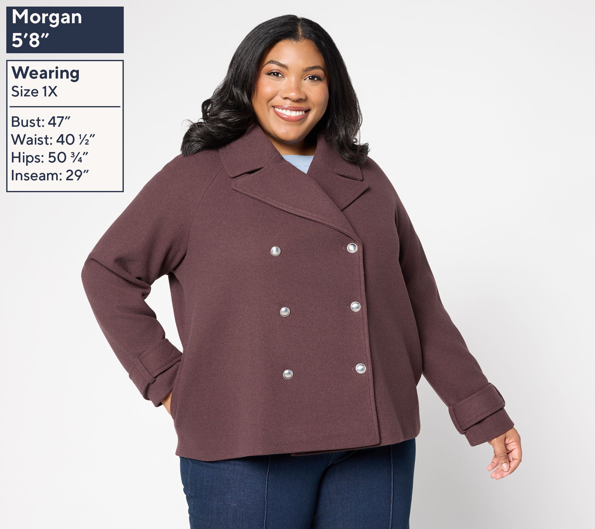 • Features: double-breasted button closure, notch collar and lapel, pleat in lining, inside button, side seam pockets, long raglan sleeves with tab and belt loops