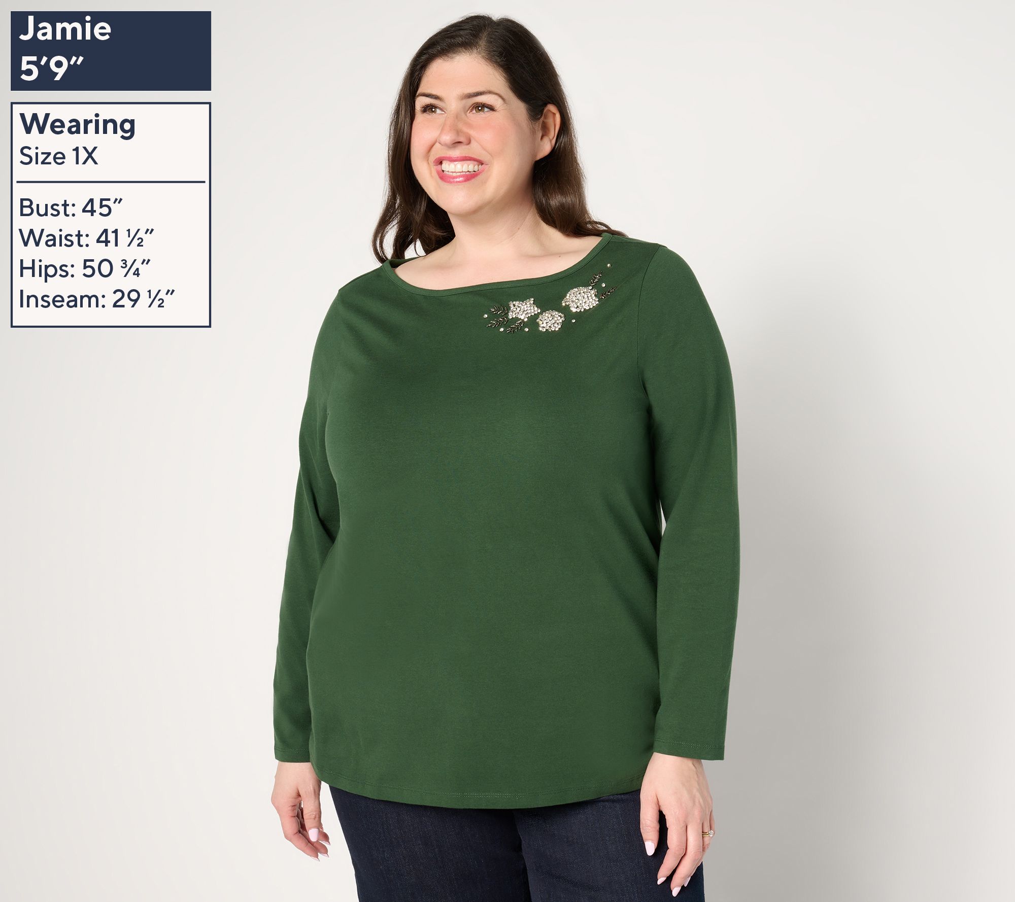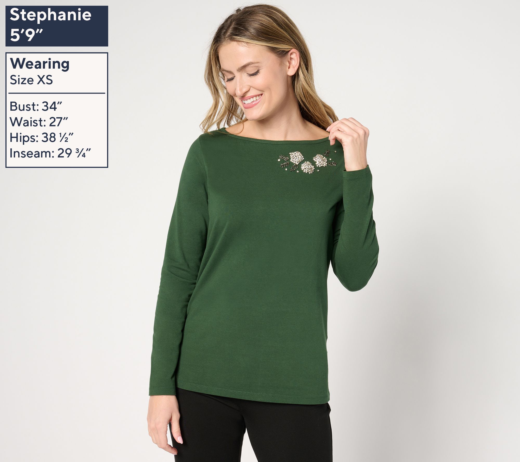 • Features: clean finished crew neckline, long set-in sleeves, embellishment at neckline