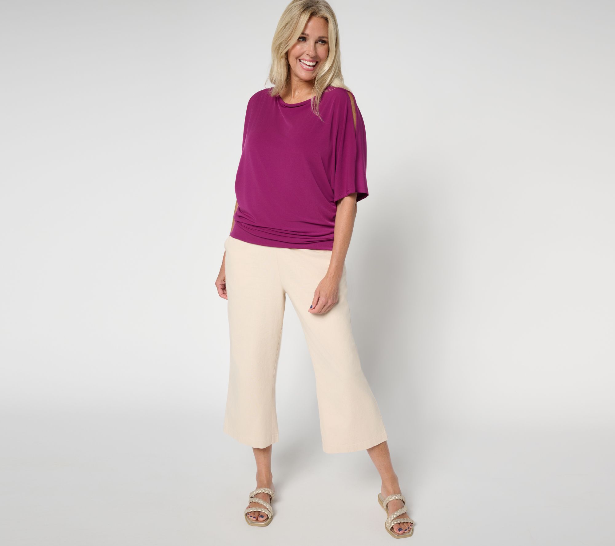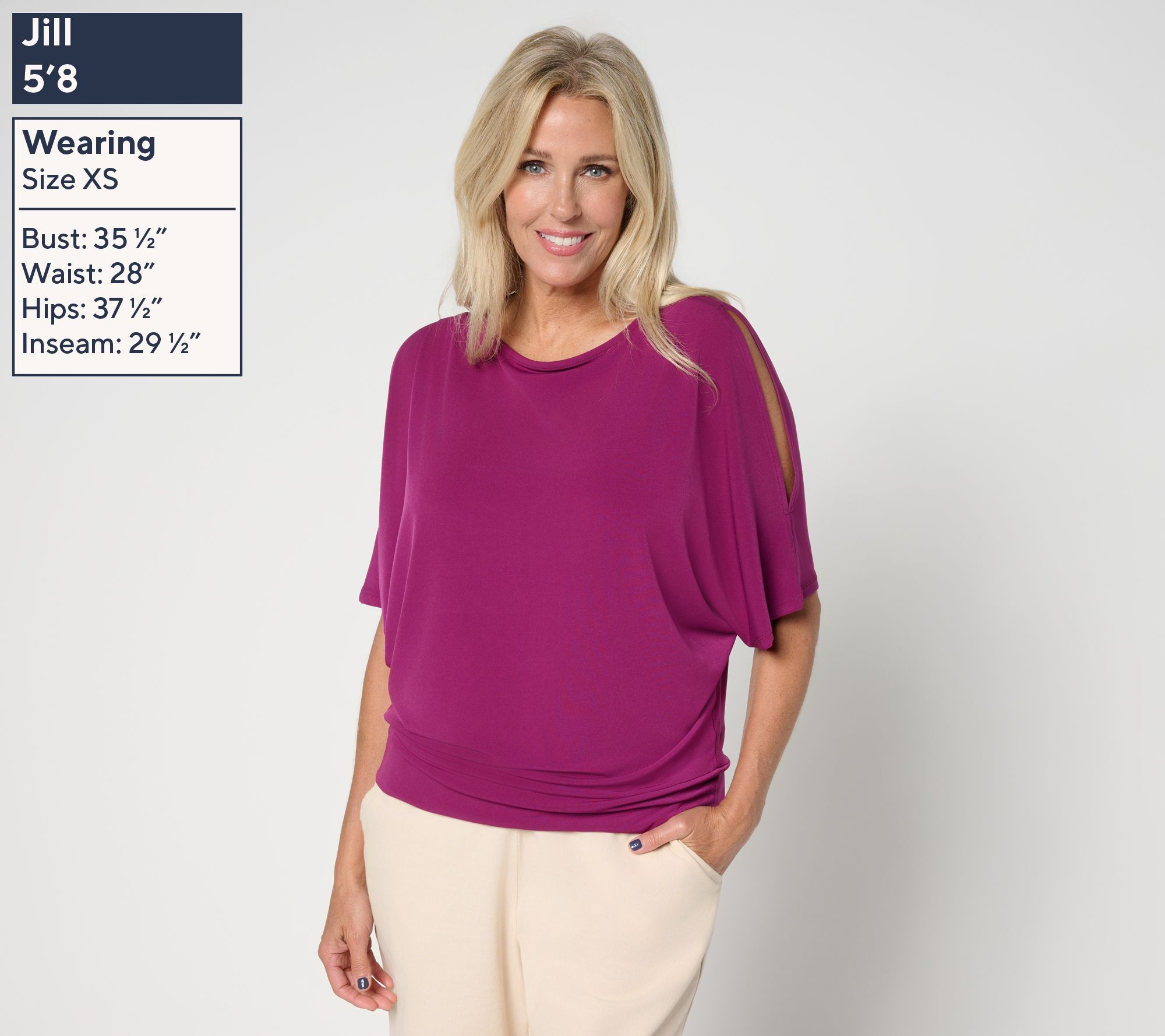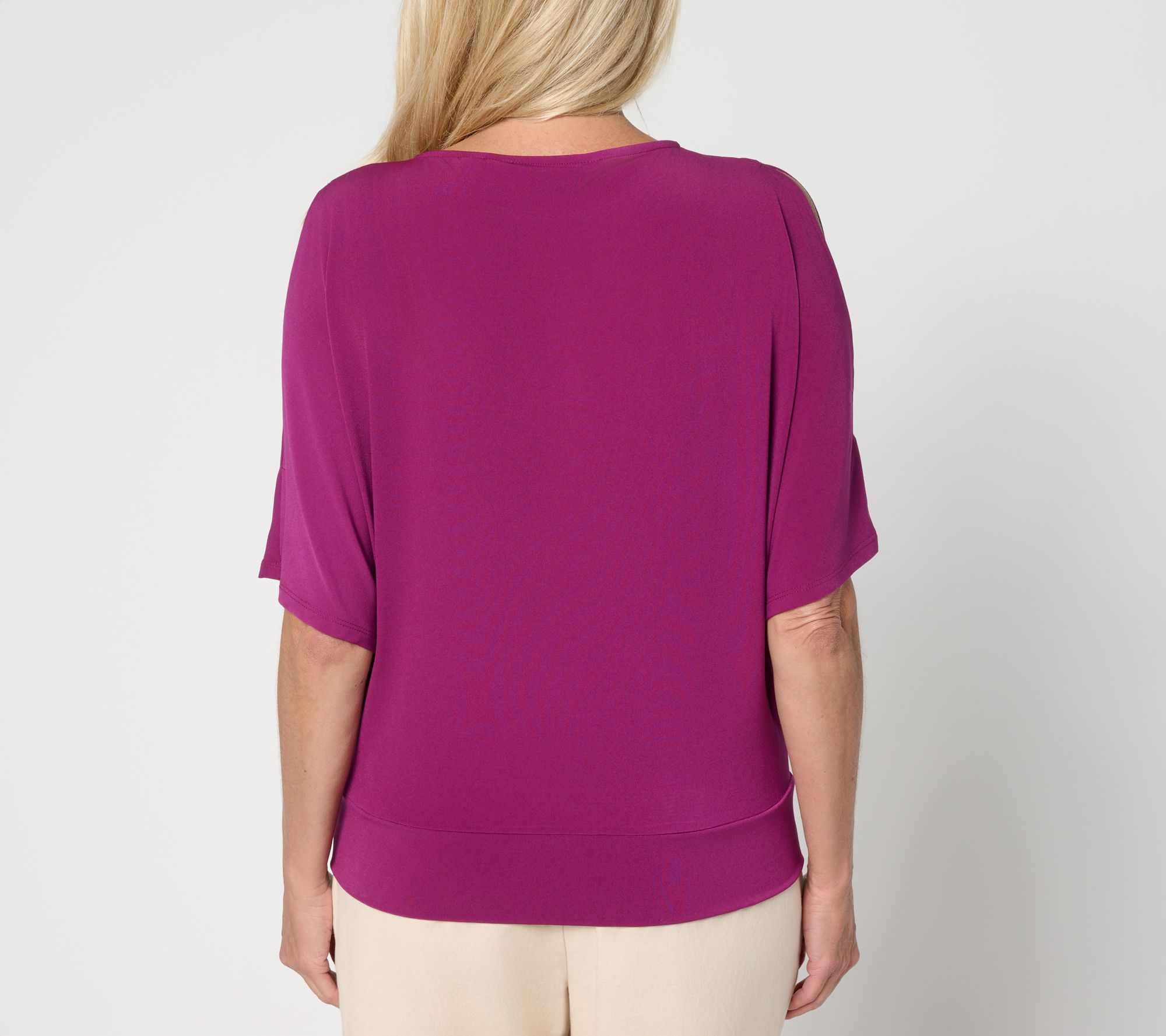 Gail loves a cold-shoulder look -- and you will too, thanks to this dolman-sleeve top. Fine-tuned for effortless wear and flair, the relaxed style inspires confidence and garners compliments left and right. From BEAUTIFUL by Lawrence Zarian.