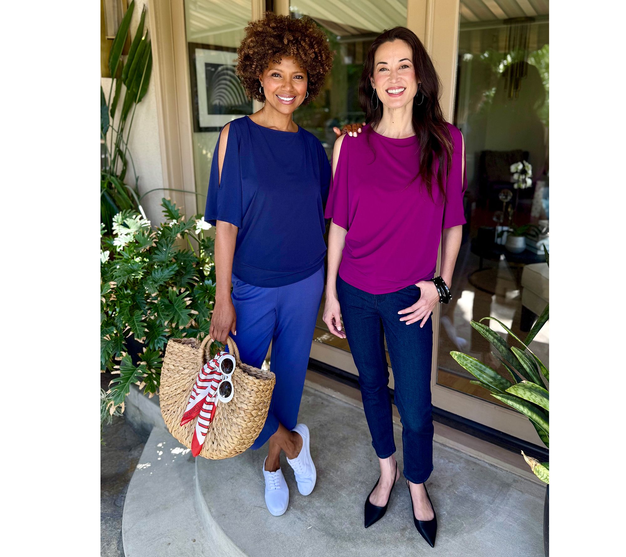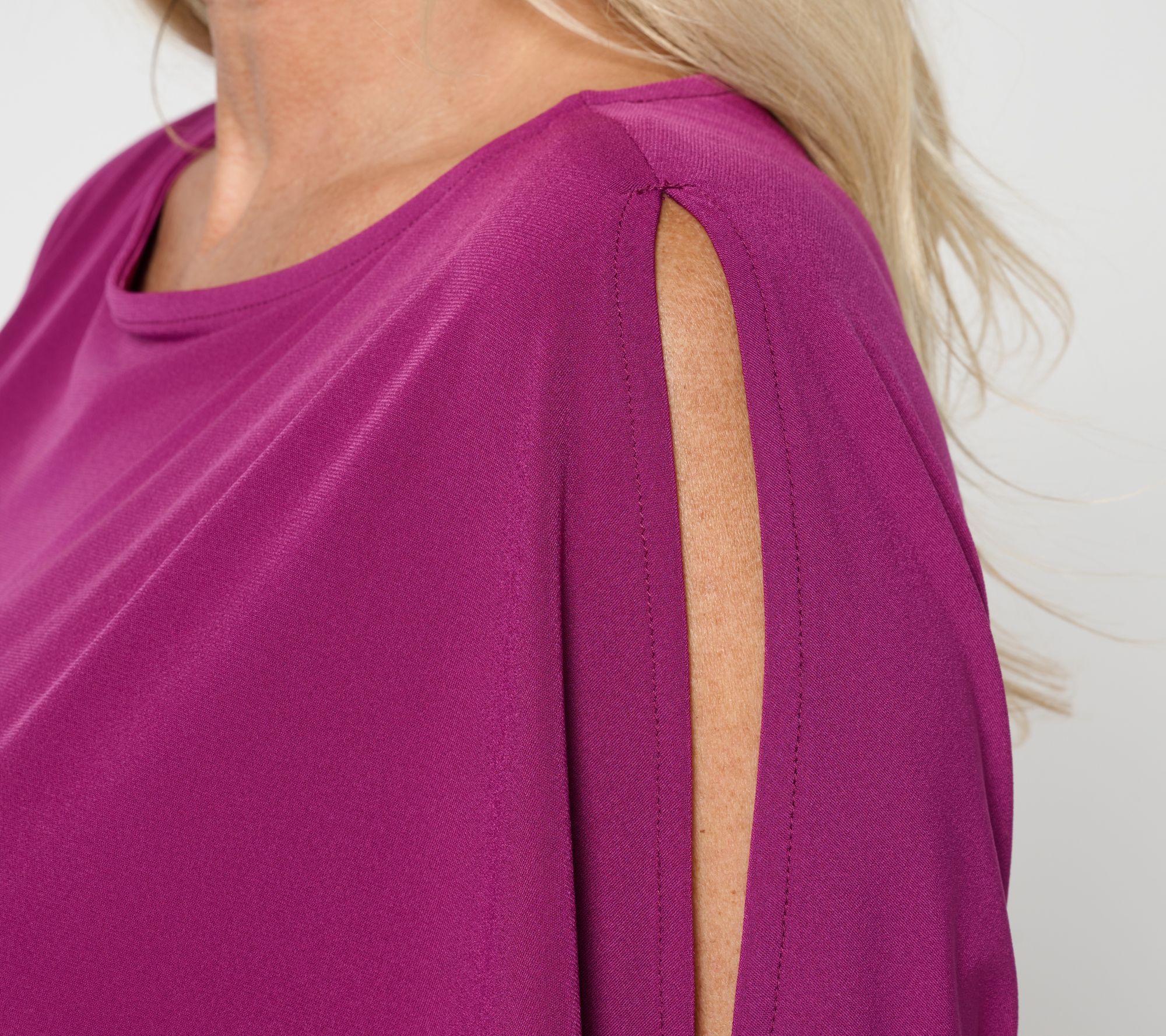 • Features: bateau neckline, cold-shoulder styling, dolman sleeves with closed slit details, bottom band