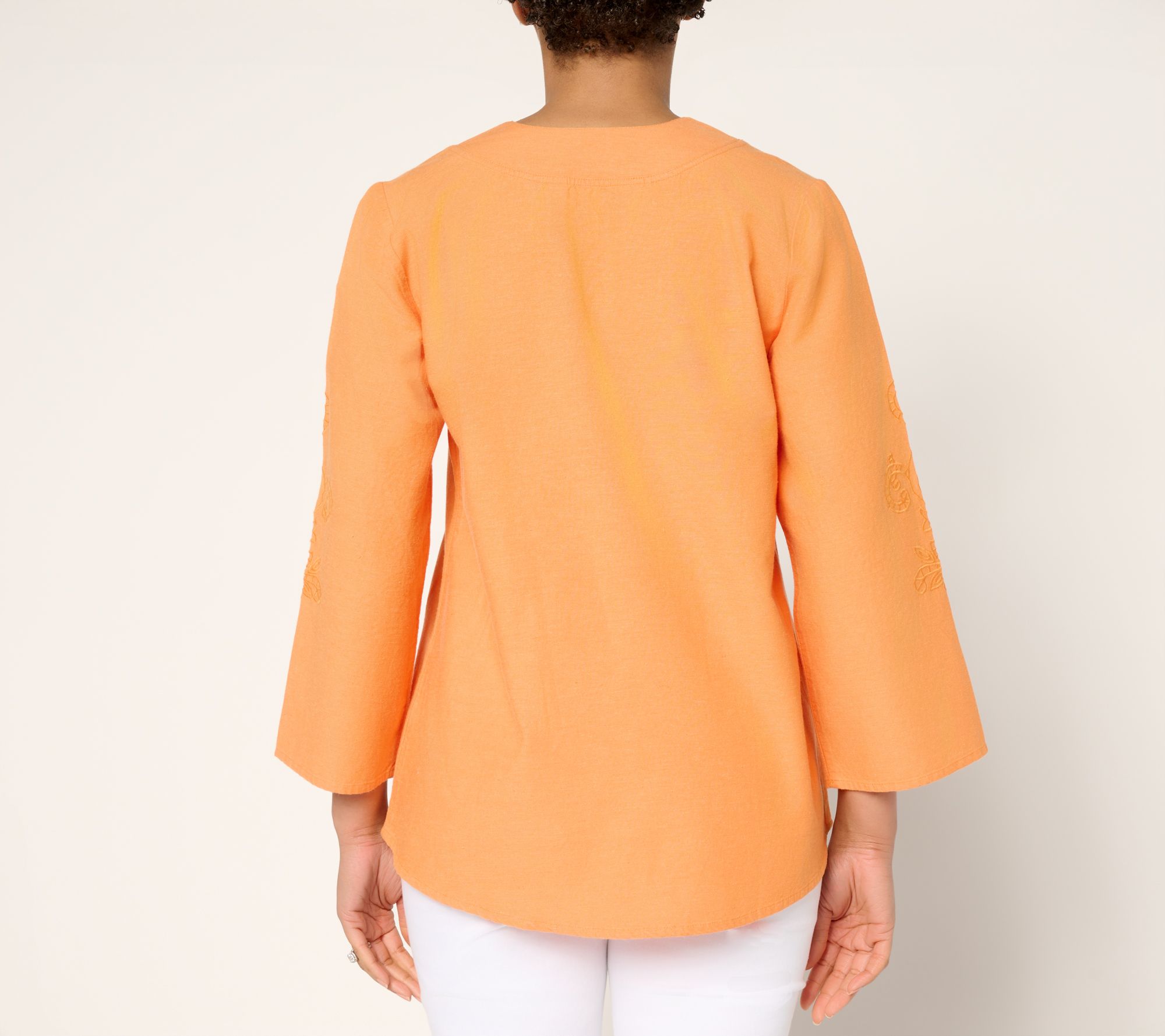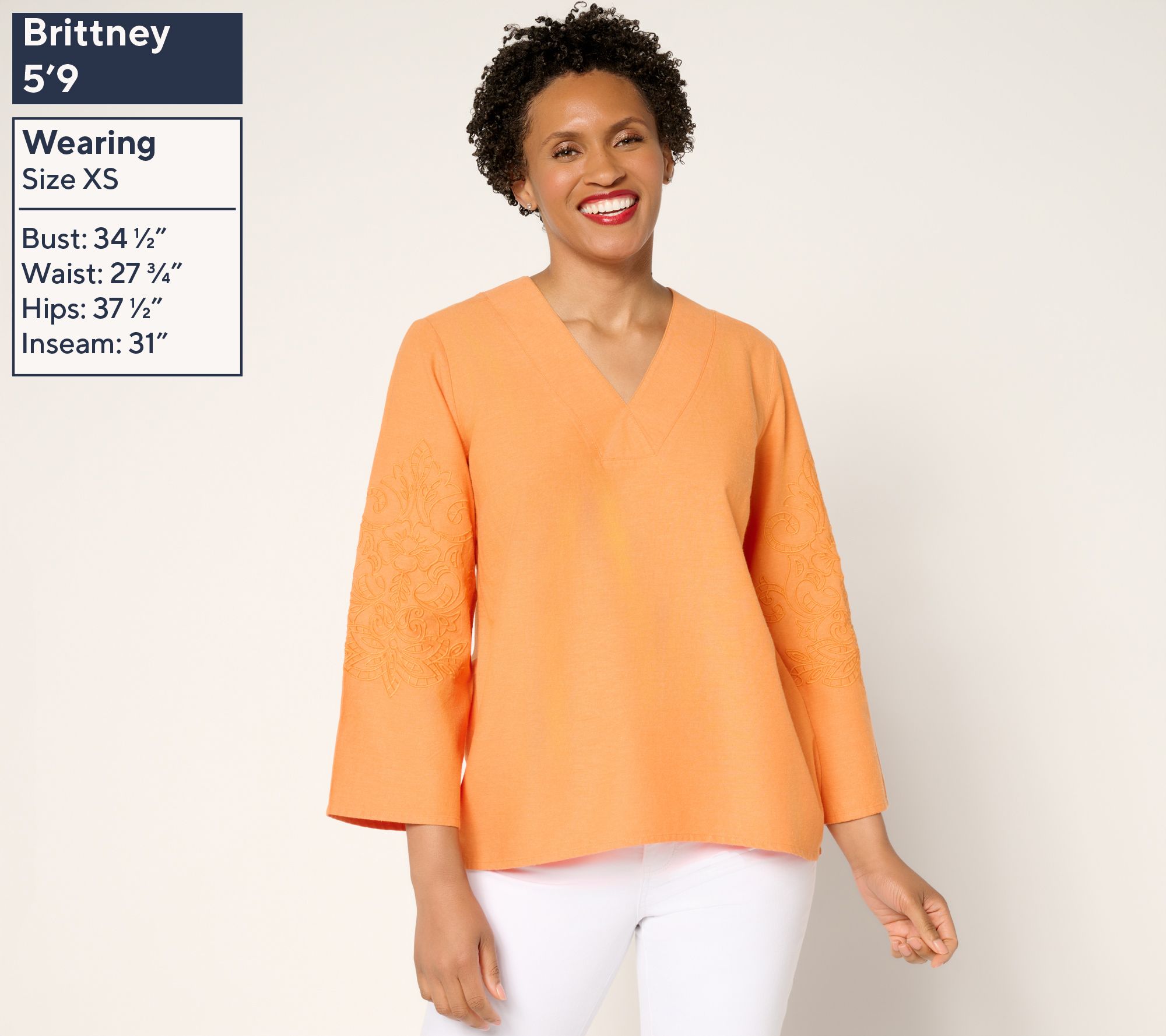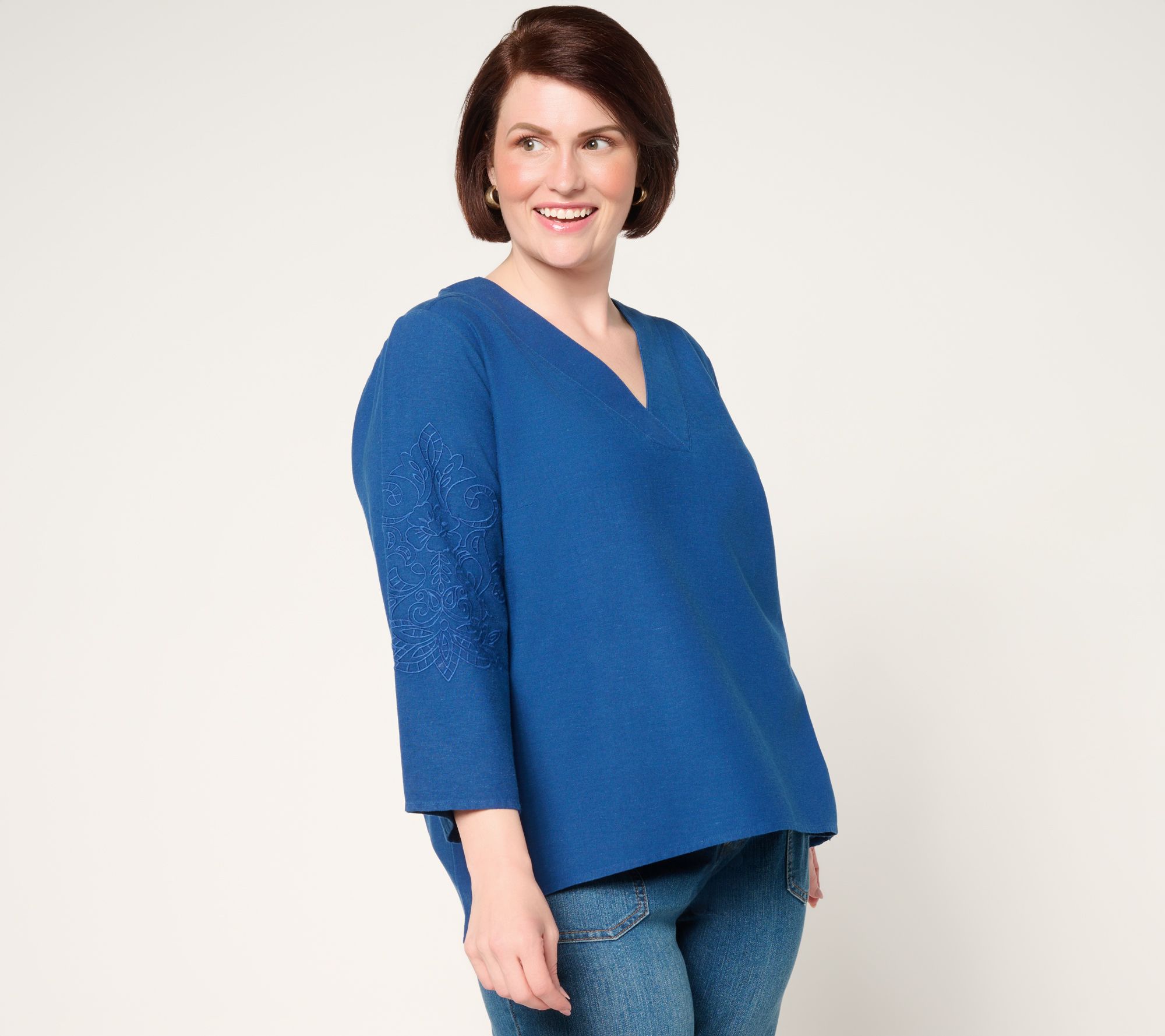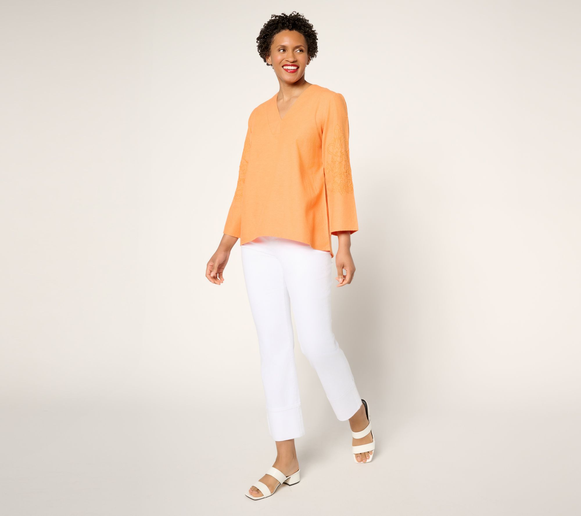 Anchor your summer capsule collection with this lovely linen-blend top from Lawrence Zarian. We're eyeing up the delicate eyelet detail on the statement-making bracelet-length sleeves, and loving the hi-low hem for that extra bit of coverage in back. But we think what makes this top so flattering is the crossover V-neck -- adding elevated sophistication to day outings or evening events. From BEAUTIFUL by Lawrence Zarian.