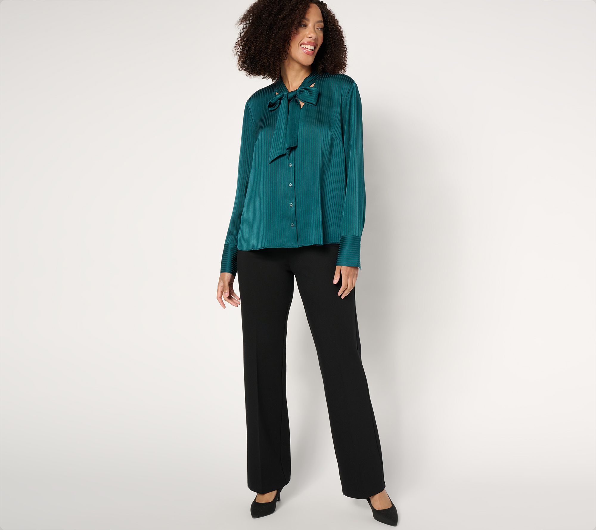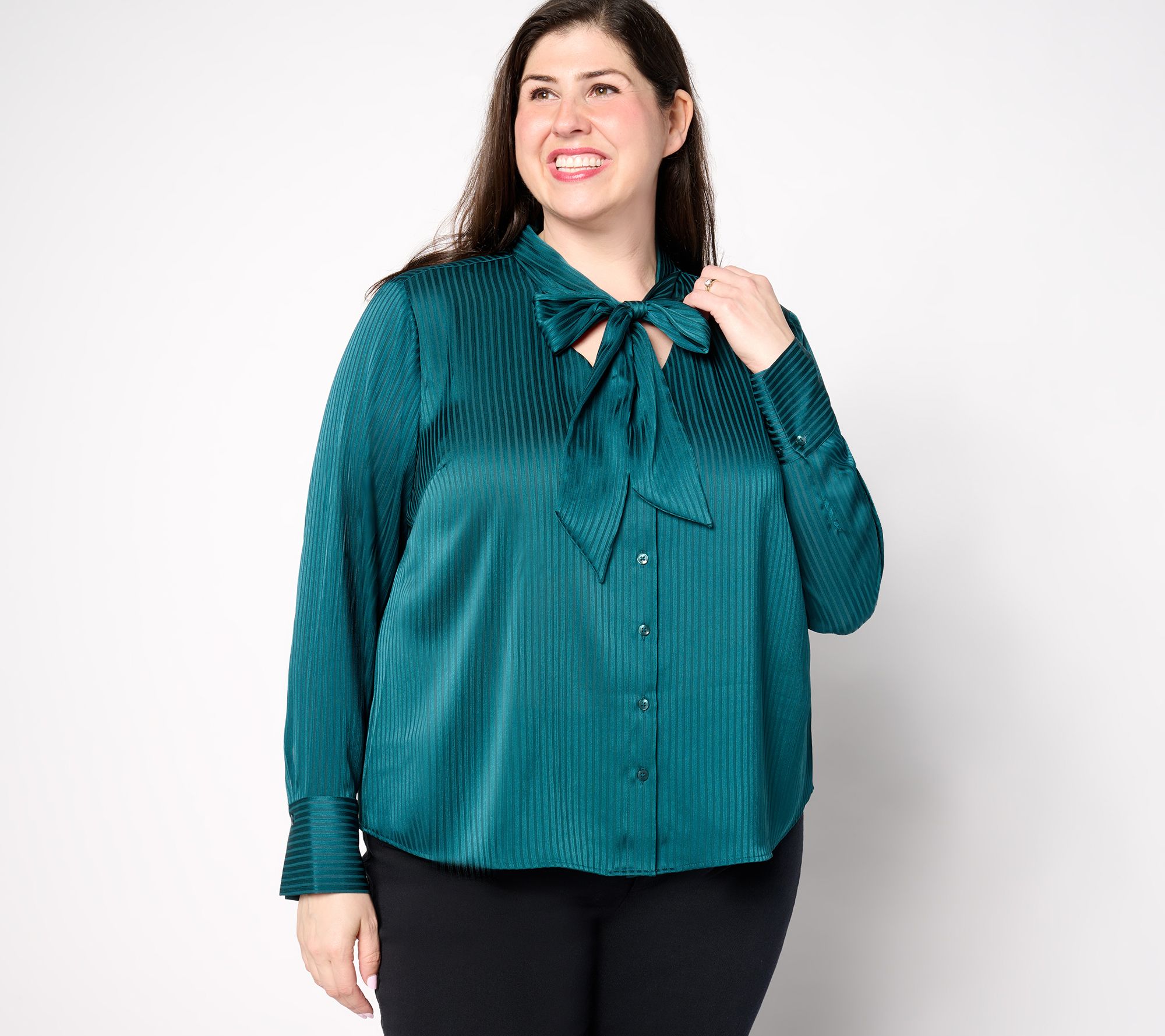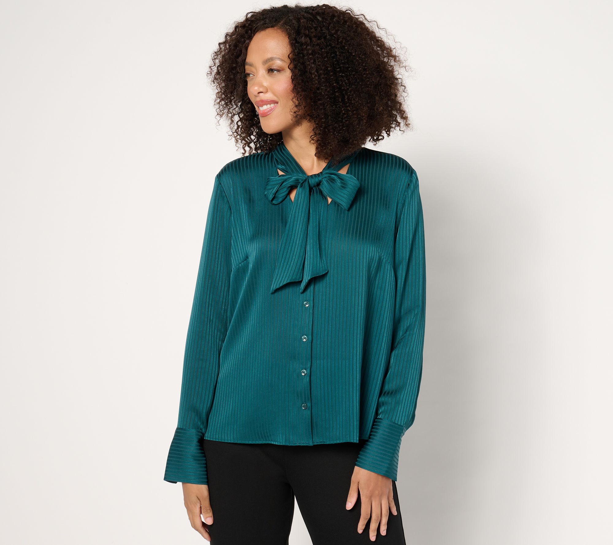 Wrap up a pretty, polished look (that'll extend well beyond the festive season) with this silky bow blouse. We love how the extended cuffs and tailored button-front work beneath a blazer for the office or more formal events. From BEAUTIFUL by Lawrence Zarian.