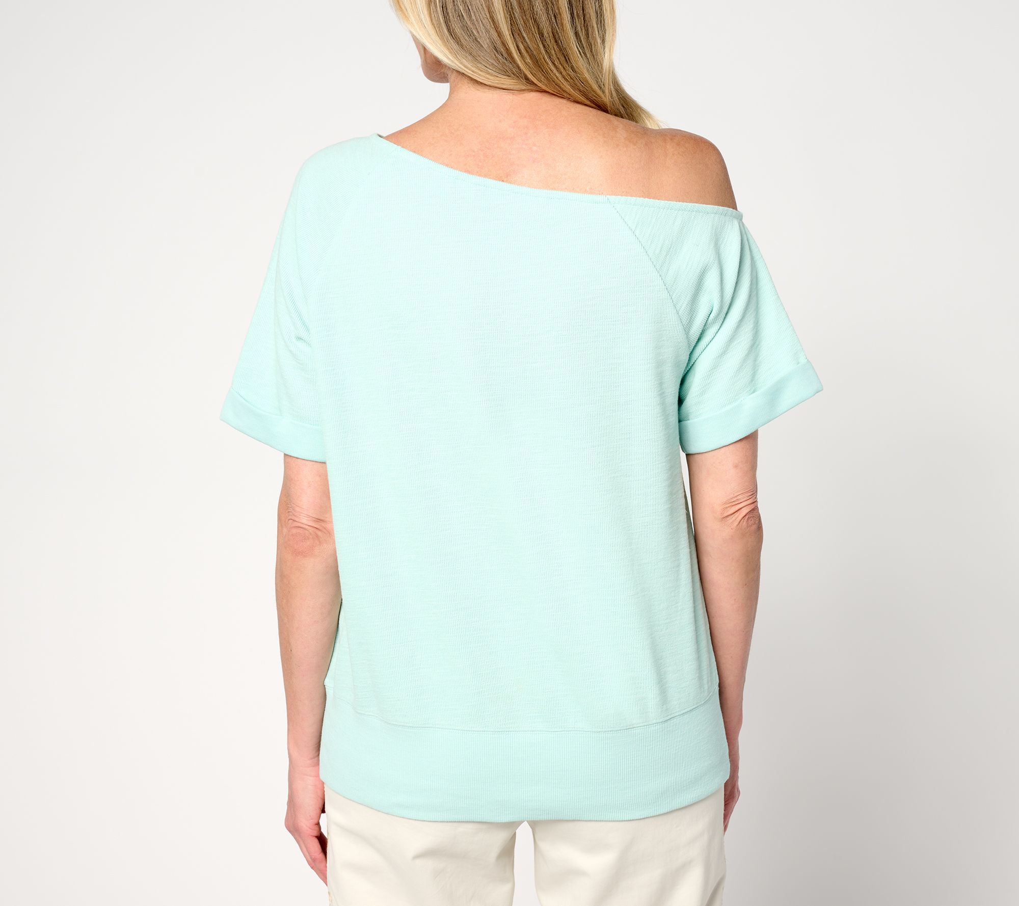 • Features: rolled raglan short sleeves with tacked cuffs, ribbed hem