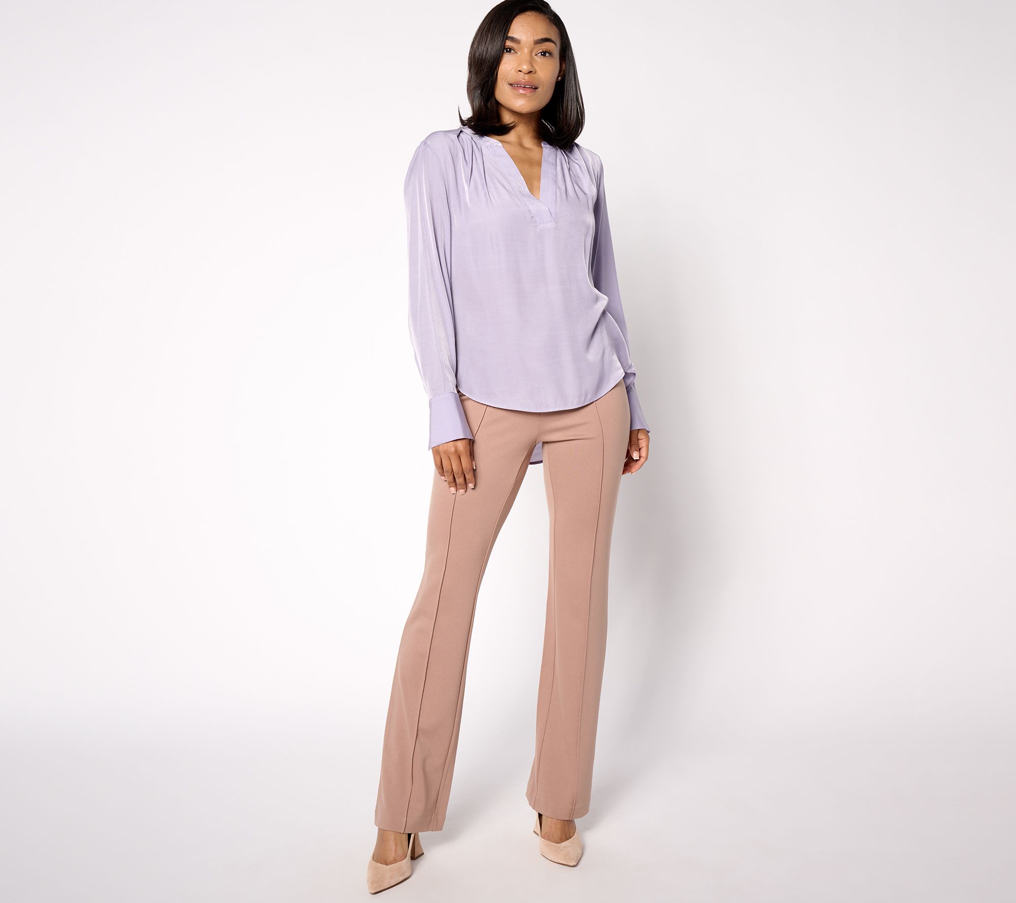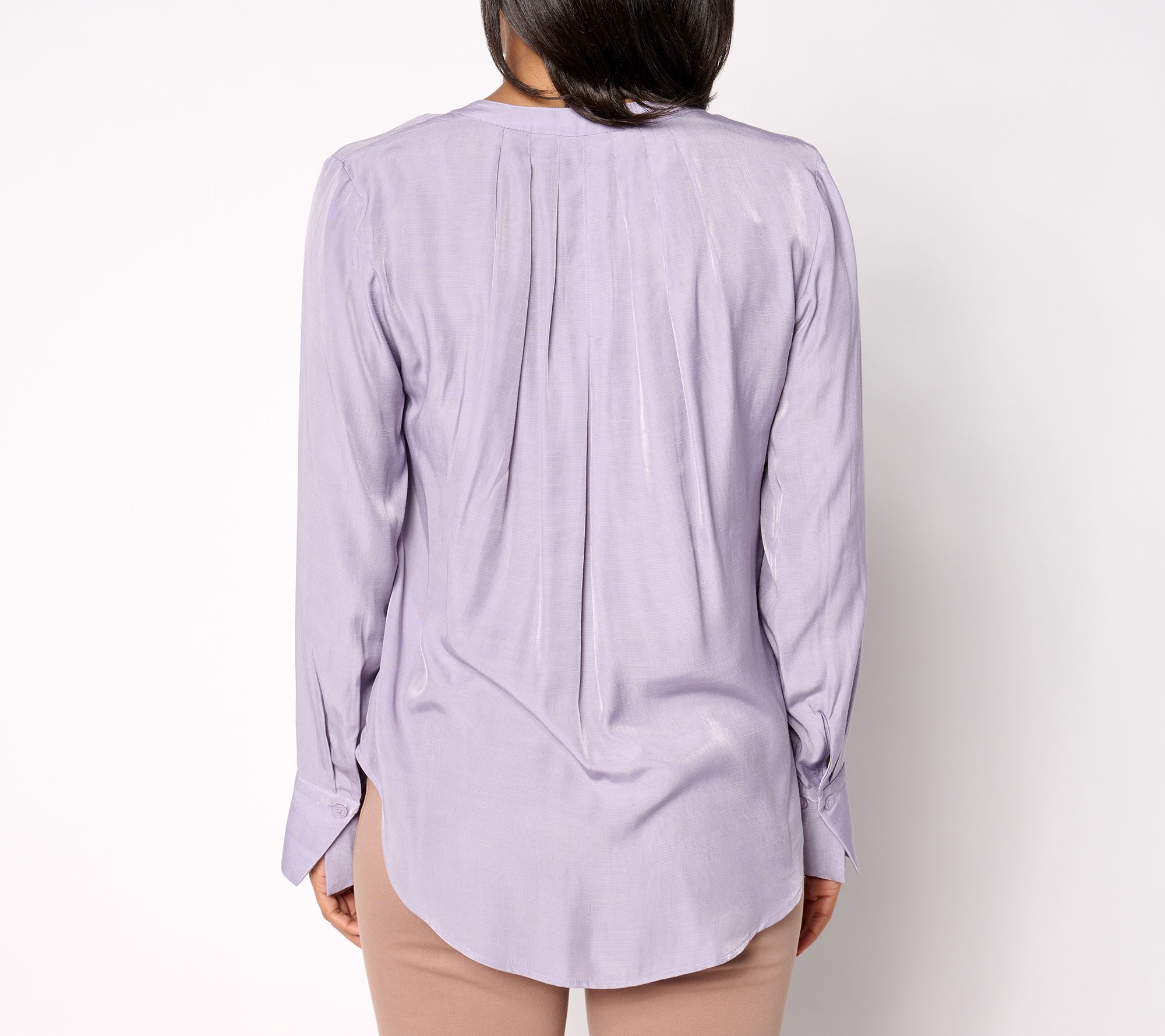 Not your average everyday blouse, this elevated beauty is fashioned with a split V-neckline, pleats on the front and back, and adjustable cuffs. After all, it's all about the details! From Beautiful by Lawrence Zarian.