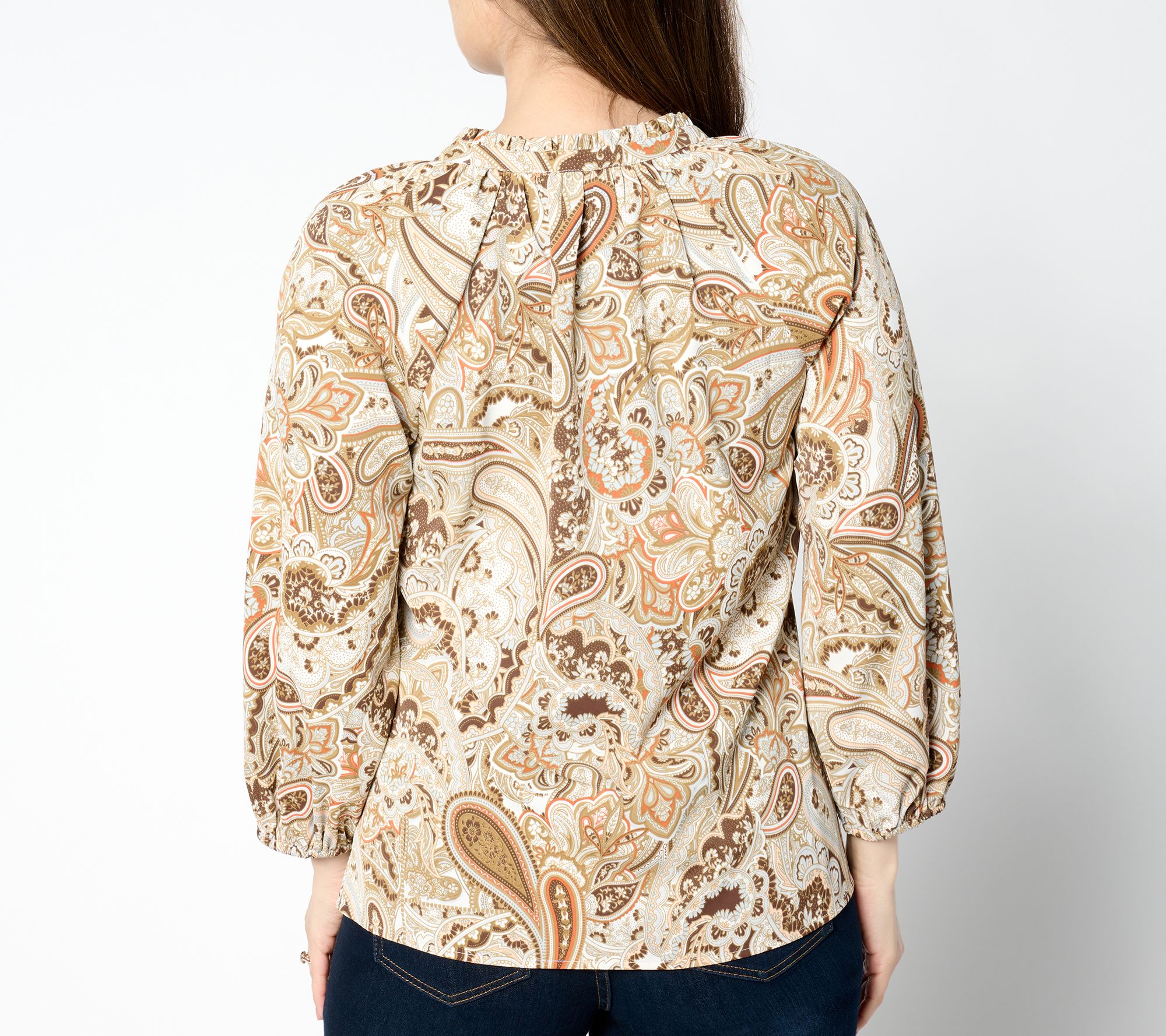 • Features: two-ply ruffle and shirring around neckline, raglan sleeves with elastic openings and shirring, clean-finished front slit, turnback hem