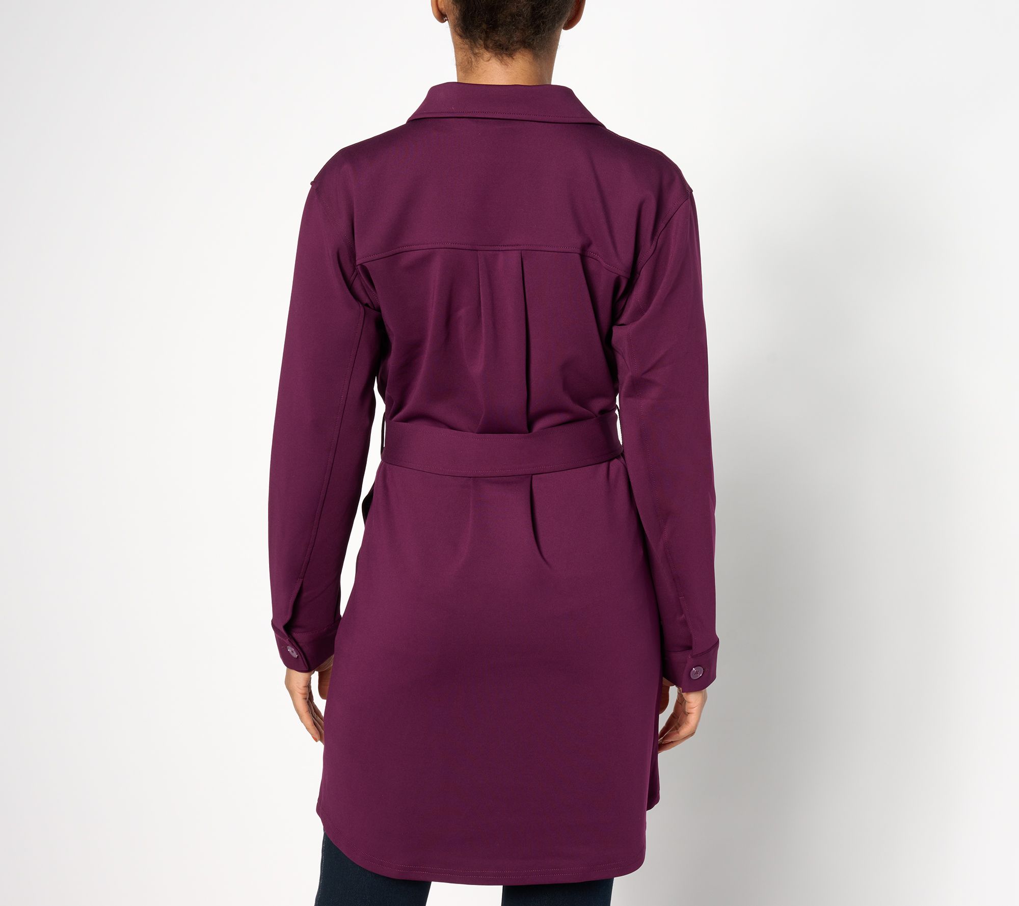 • Features: button-front closure, collar, pleated back yoke, long sleeves, side pockets, waist sash, shirttail hem