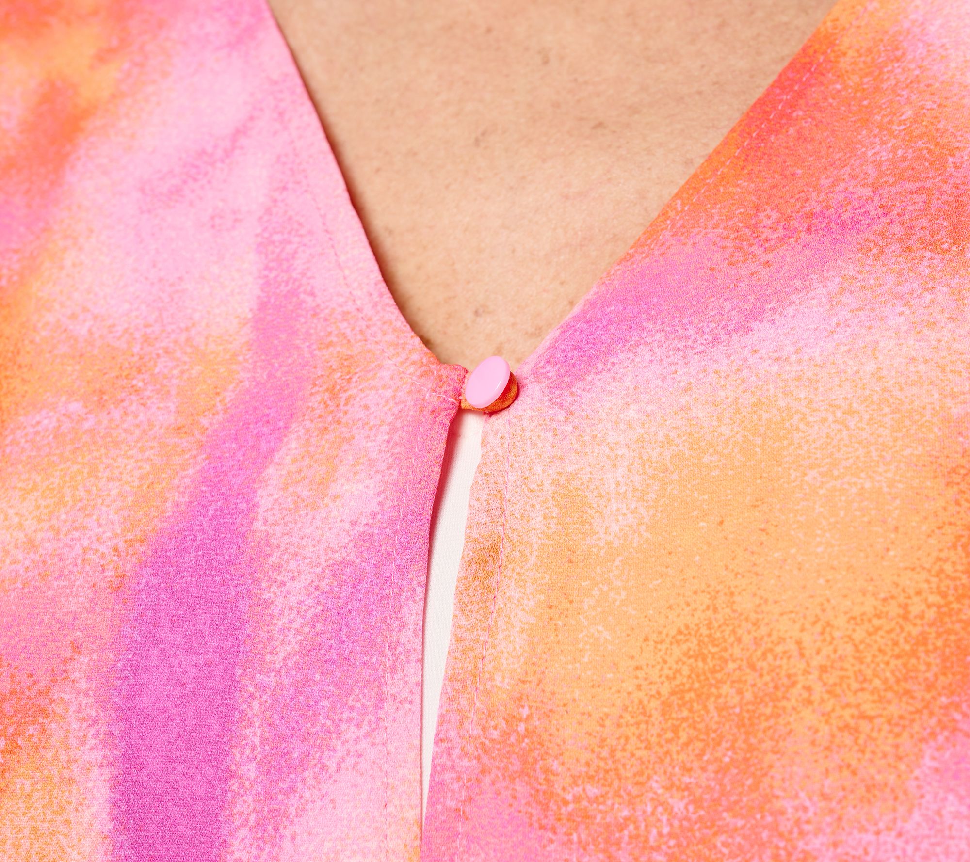 • Features: V-neckline with self-loop button closure, all around turnback hem