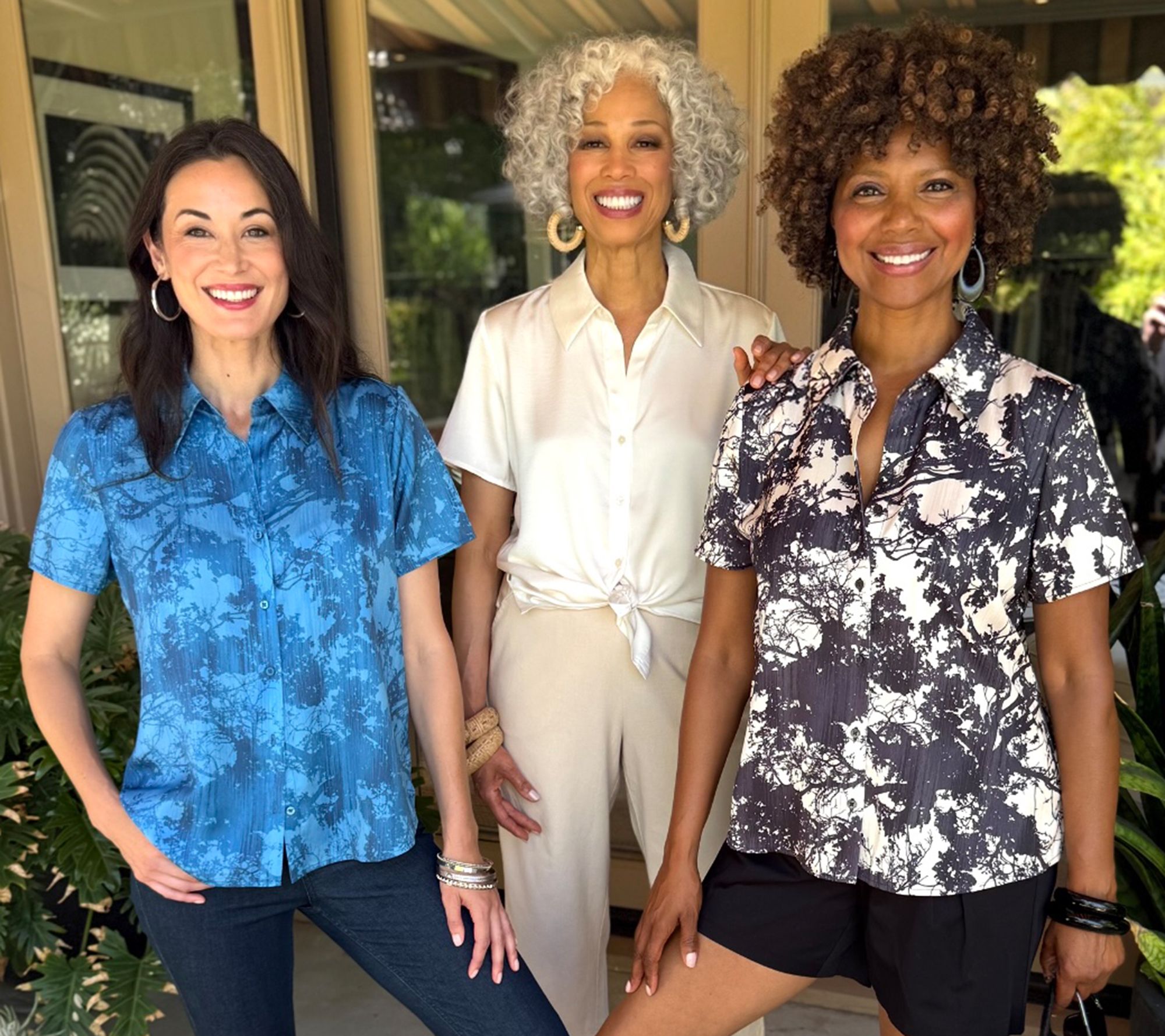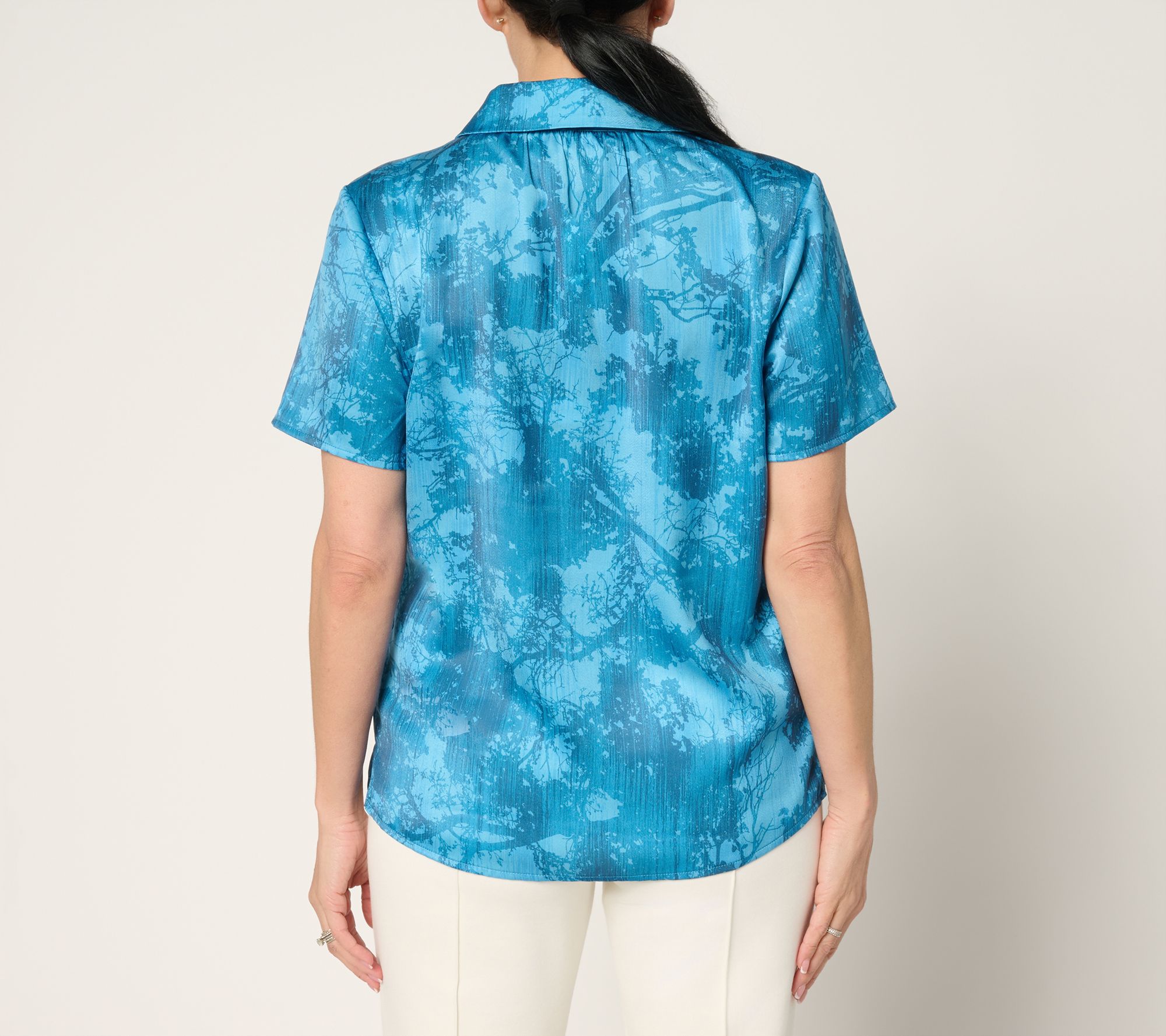 Showcase your easygoing style with this short-sleeve blouse, featuring a crisp button front and gentle shirring at the back neckline for a soft, feminine touch. Side slits add movement and a relaxed feel -- making this an effortless choice. From BEAUTIFUL by Lawrence Zarian.