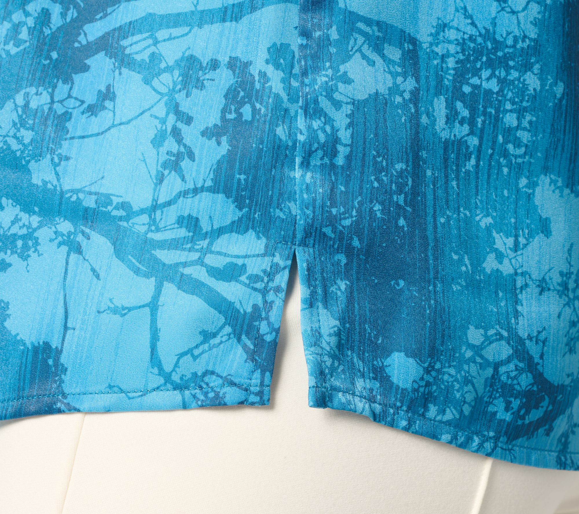 • Features: two-ply collar and stand, button-front placket, shirring at center back neck, side slits