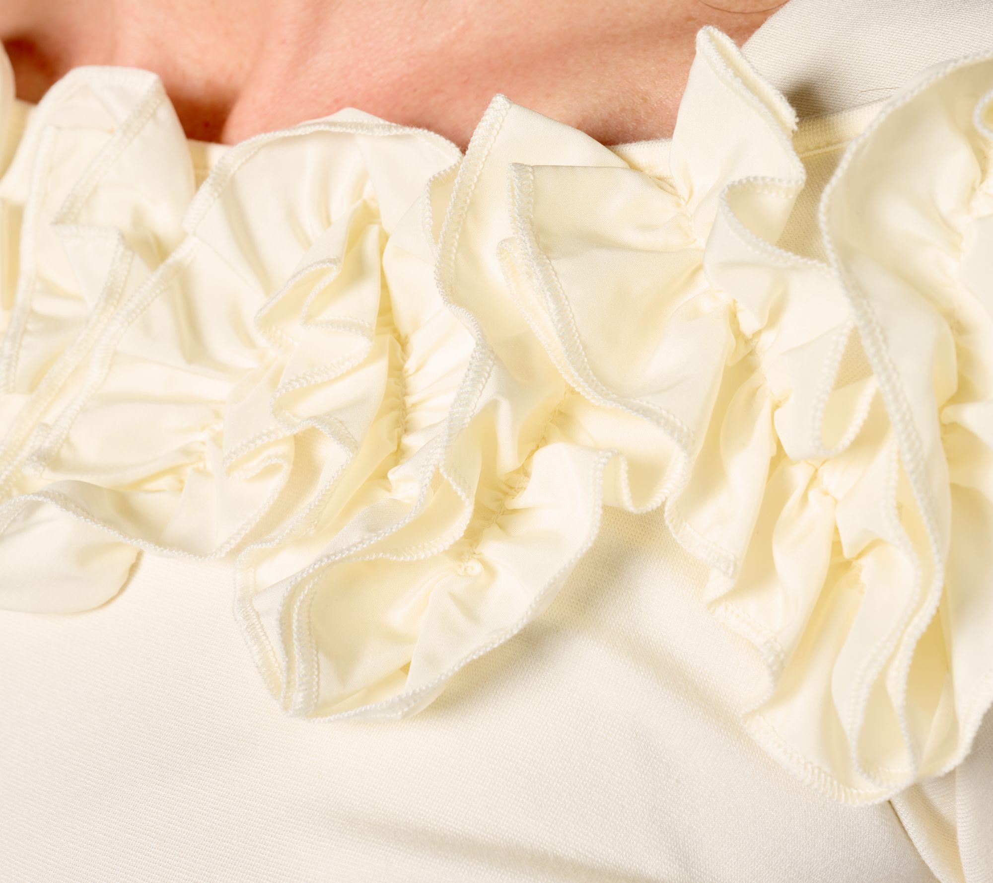 • Features: boat neckline with dimensional rosette details, long sleeves, bust darts, straight bottom hem