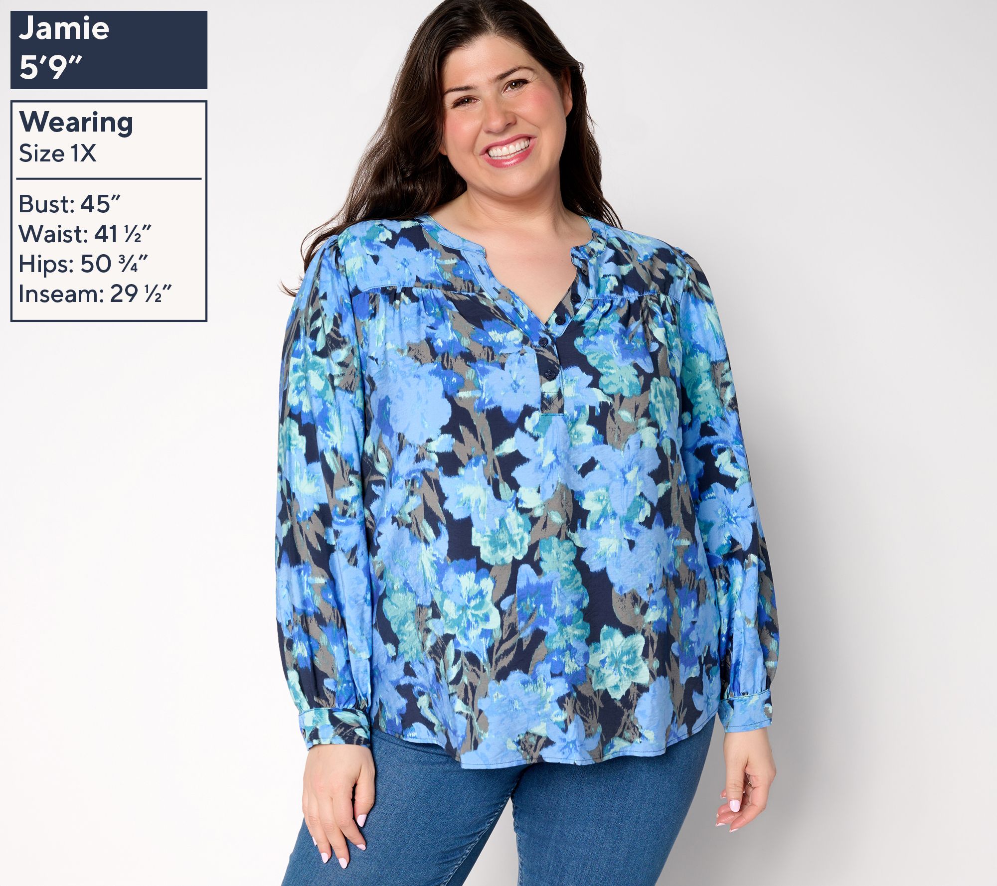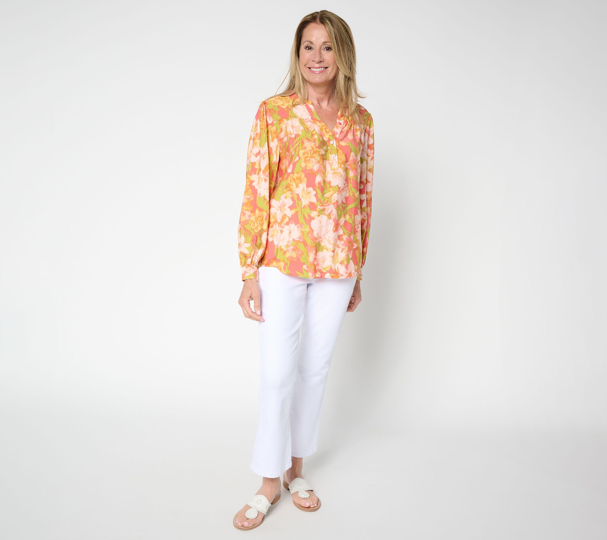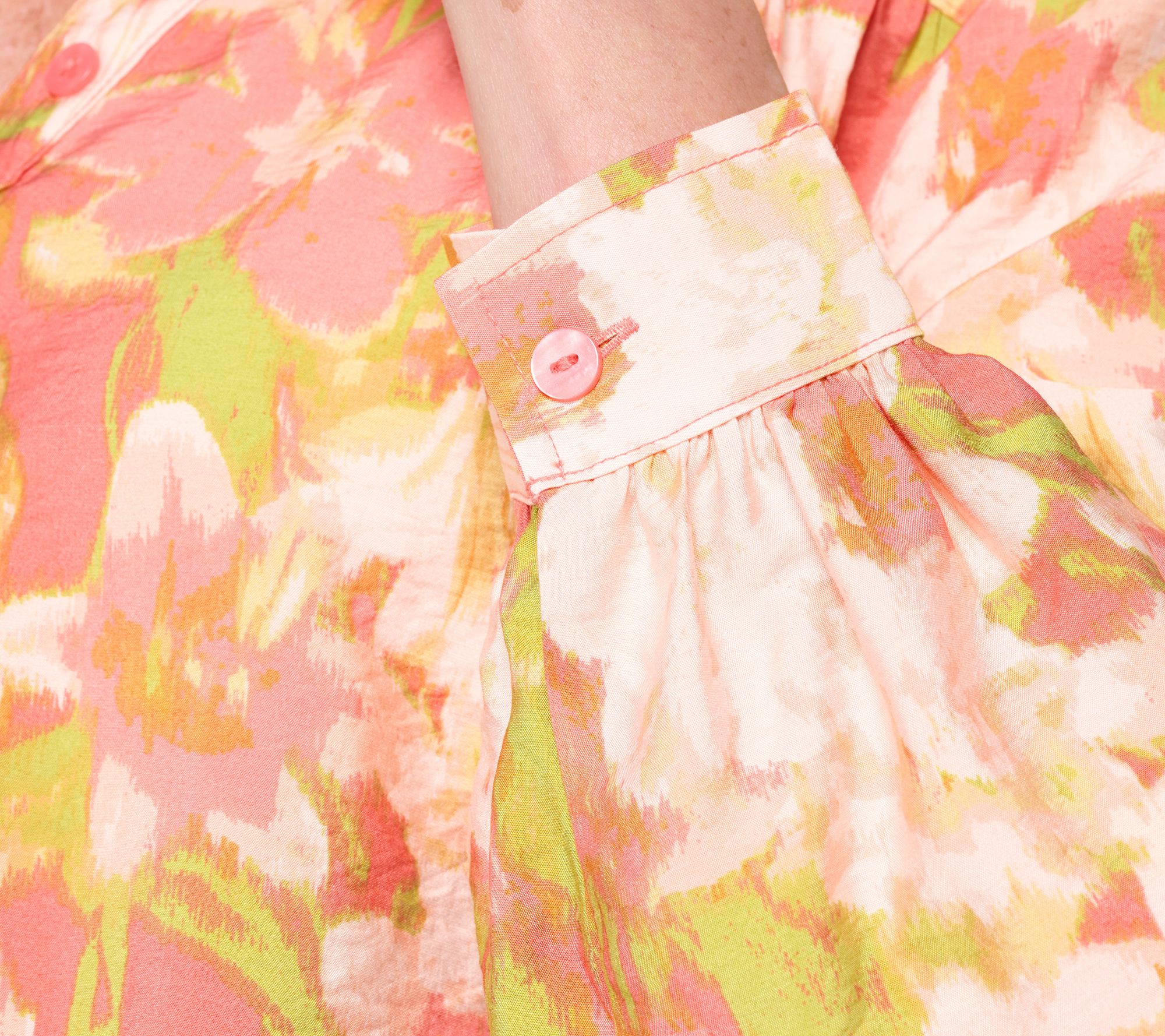 • Features: allover print, collar band, Y-neck henley with button closure, gathered long blouson sleeves, curved bottom hem, back yoke, button cuffs, hi-low hemline
