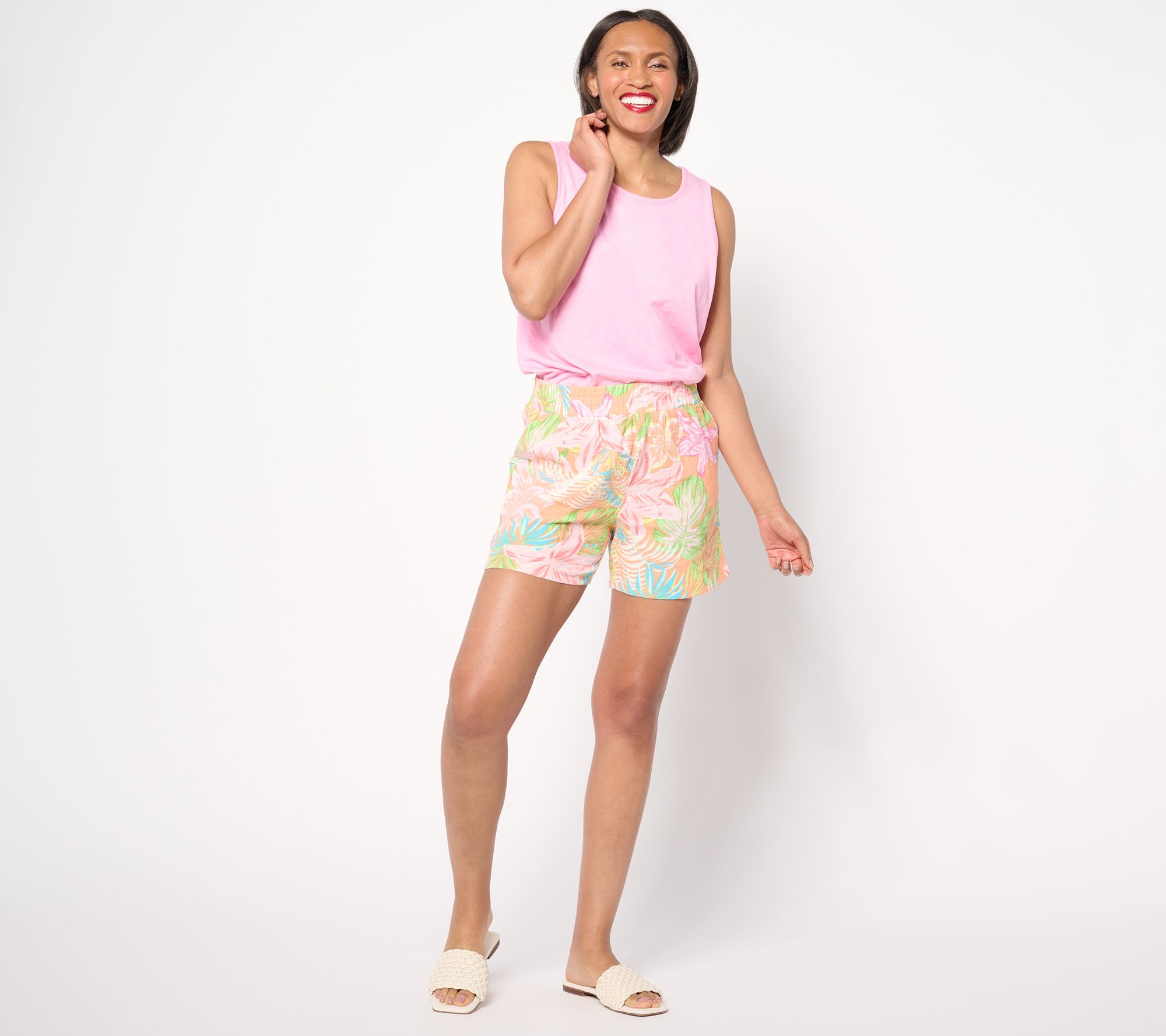 Let's get tropical! These colorful 5" shorts extend those feel-good vacay vibes throughout the season. And, btw, in 100% cotton gauze, they're really, really comfy. From Belle Beach by Kim Gravel.