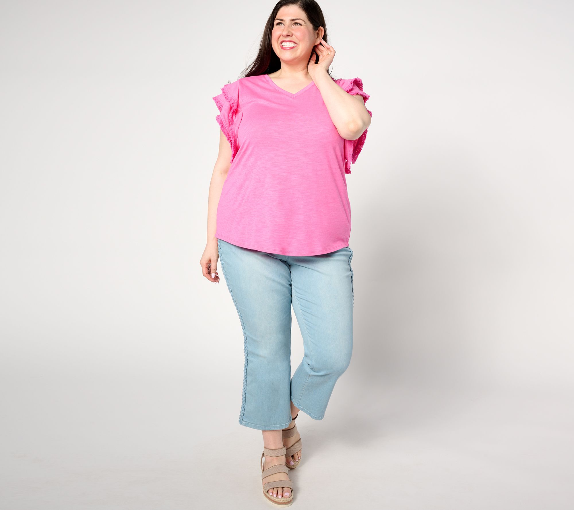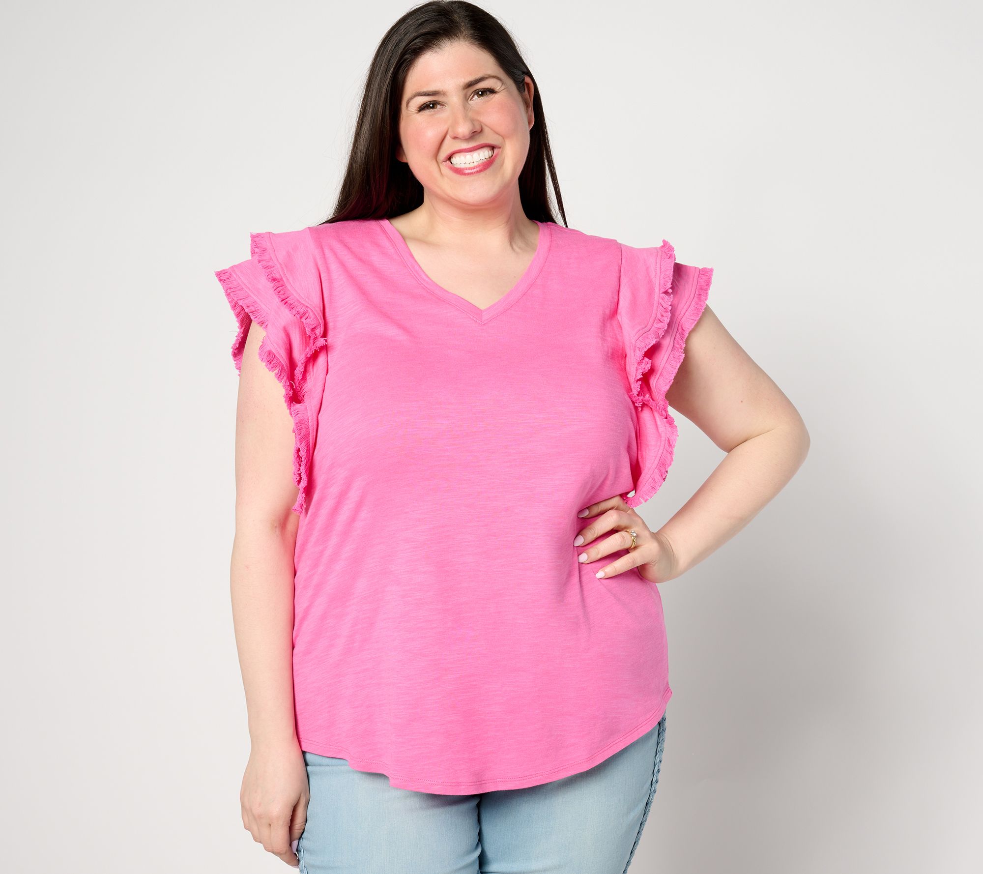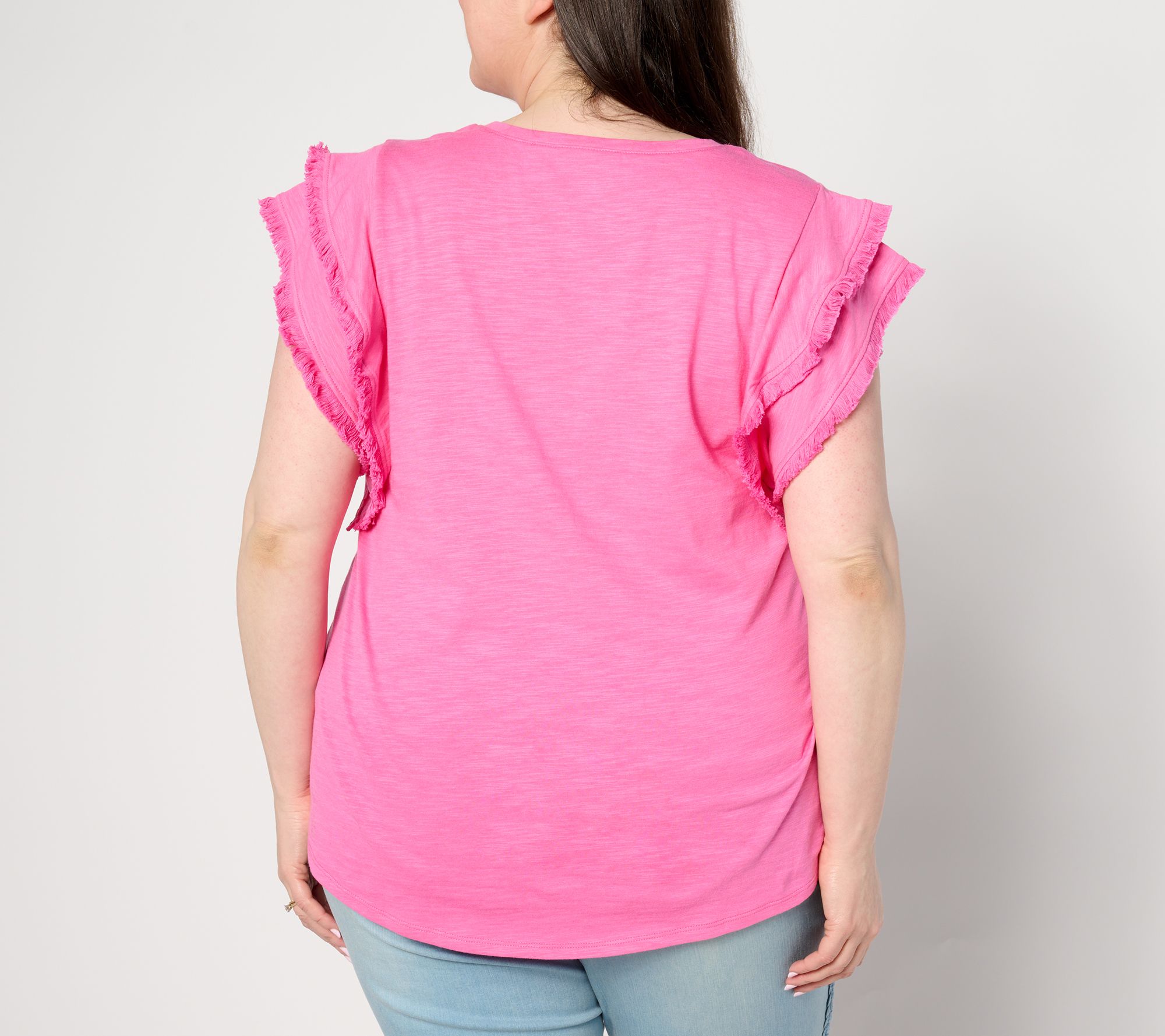 Ruffle trim on the cap sleeves makes this slub knit top a winning choice. Pair it with your favorite shorts or white slacks for a lovely look. From Belle Beach by Kim Gravel.
