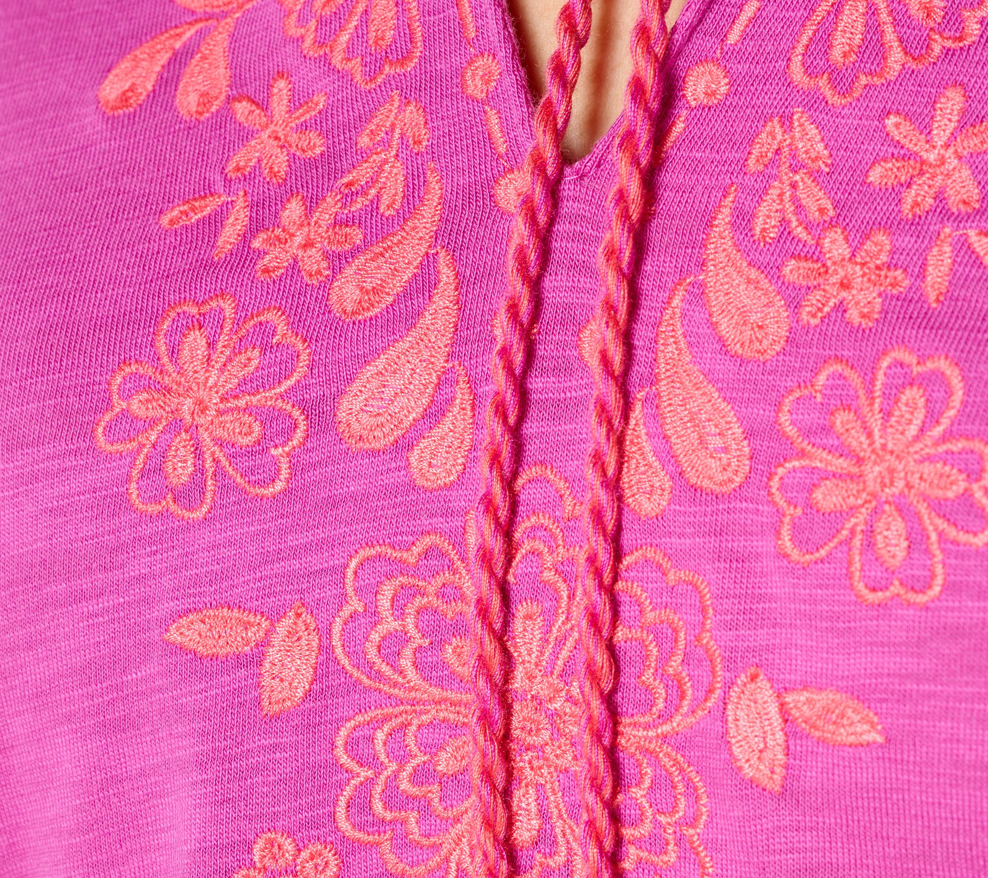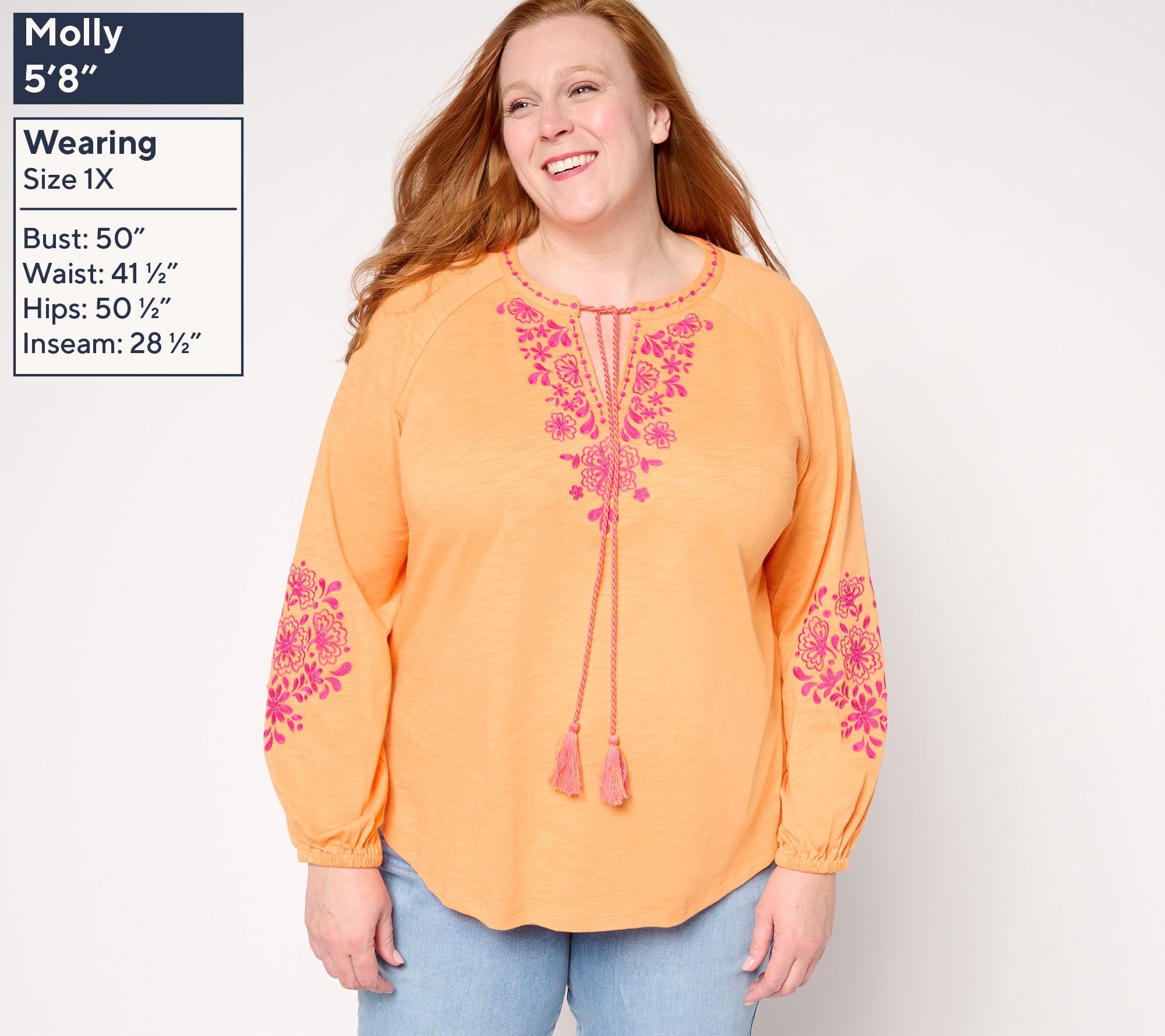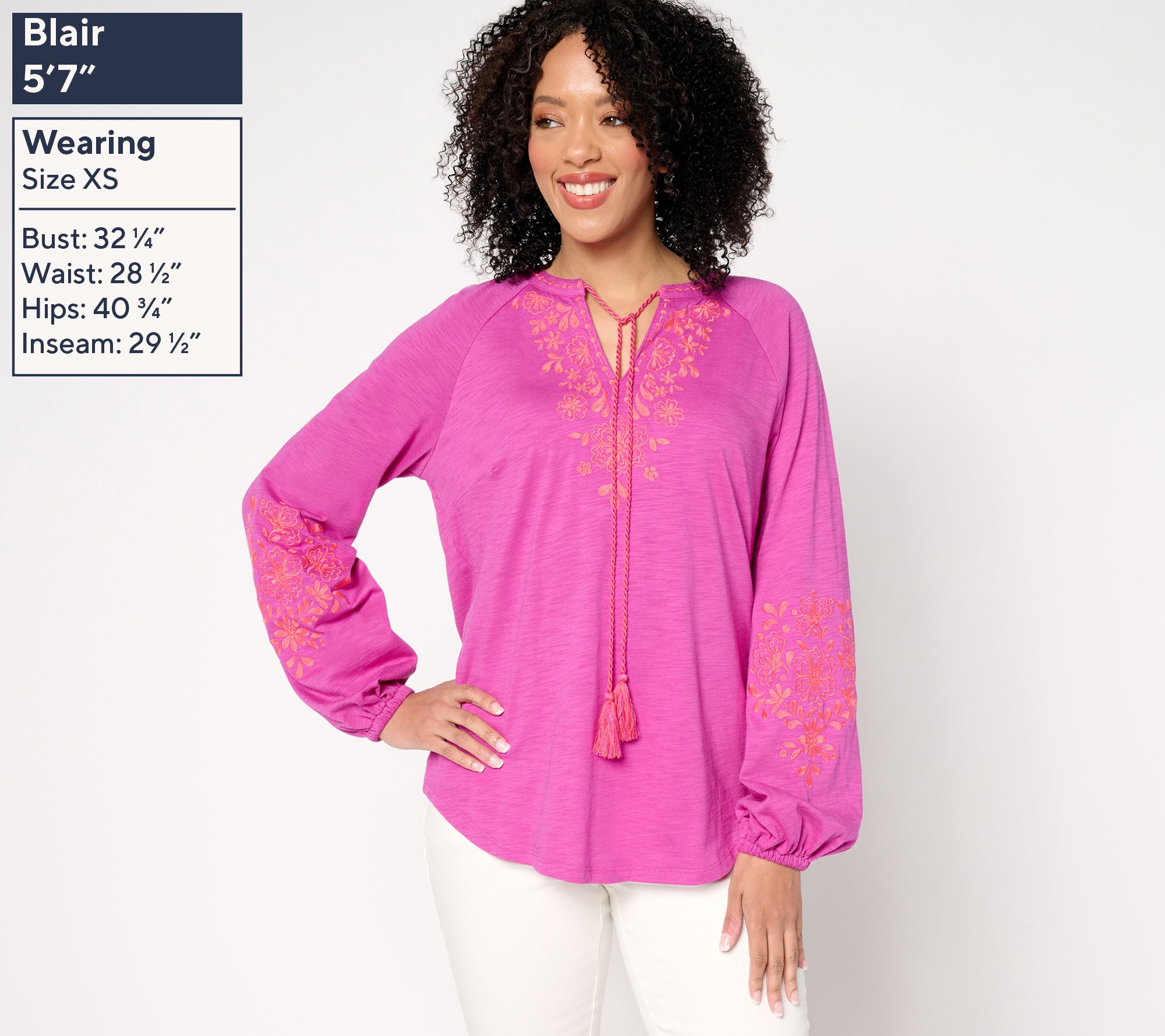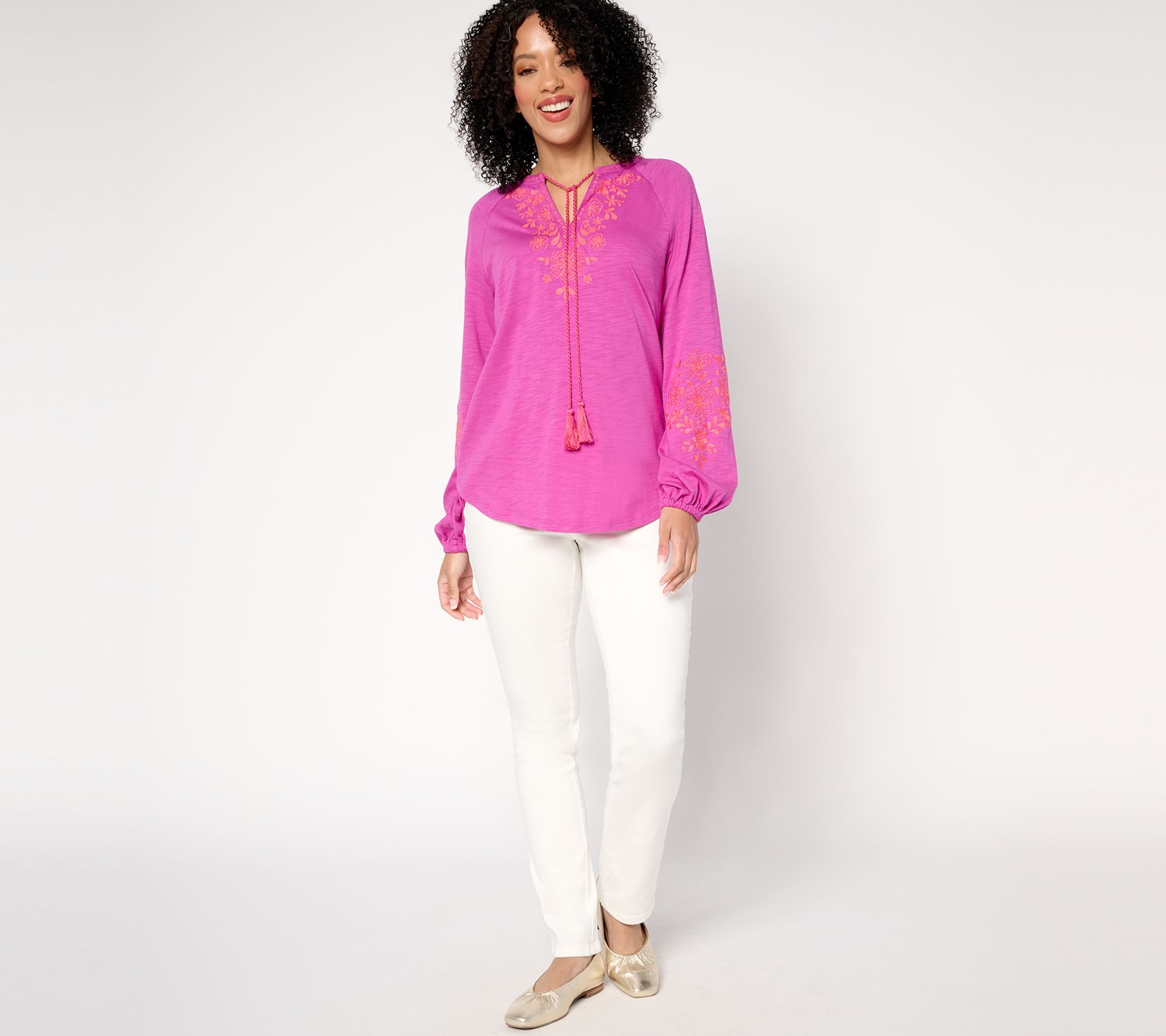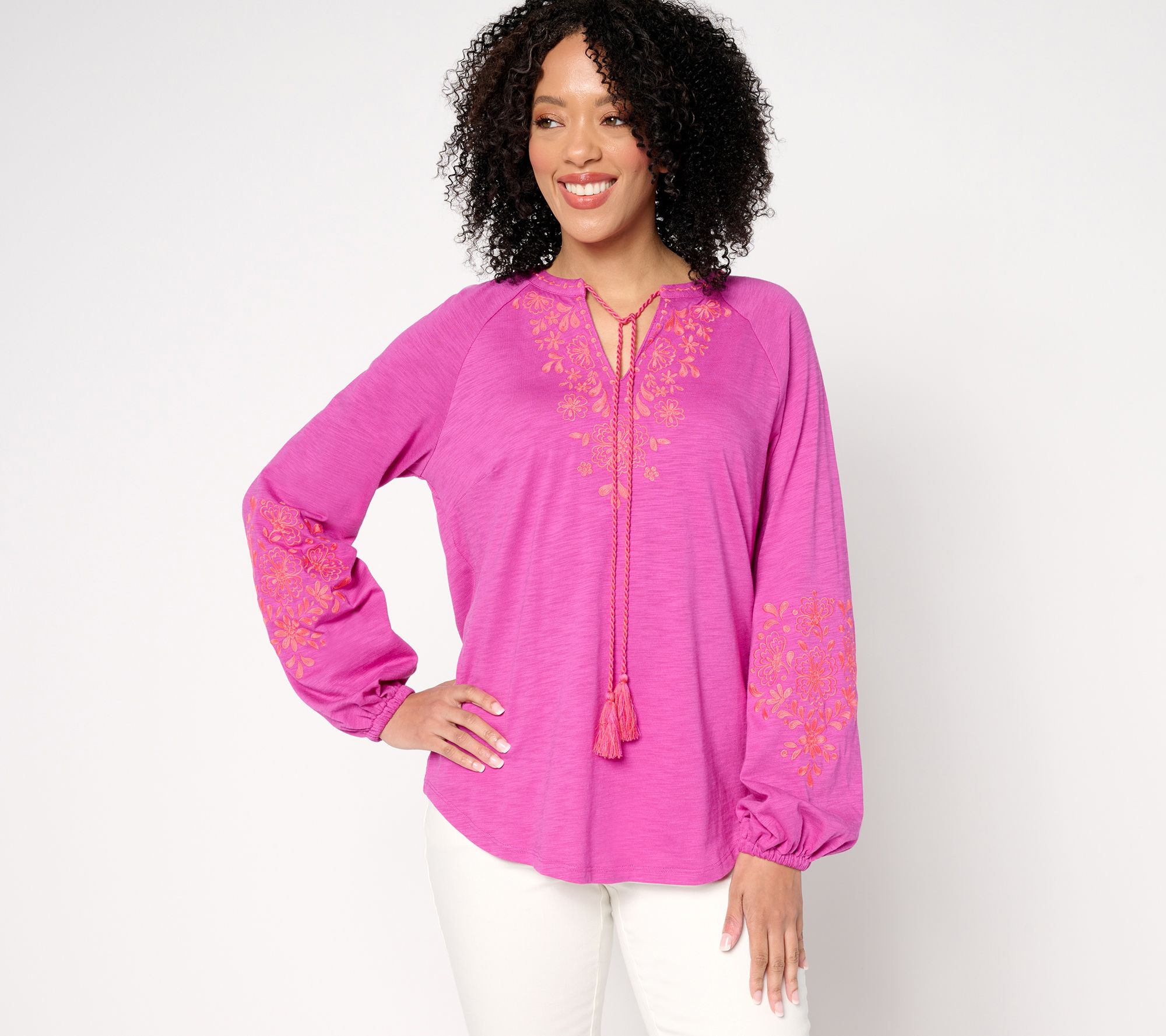 Embrace a boho-chic energy with this Lotus Sunrise embroidered top. With its tassel-accented split neckline, long raglan sleeves with elastic cuffs, and flattering curved hem, this peasant-style design brings an updated yet relaxed vibe to any everyday look. From Belle by Kim Gravel.