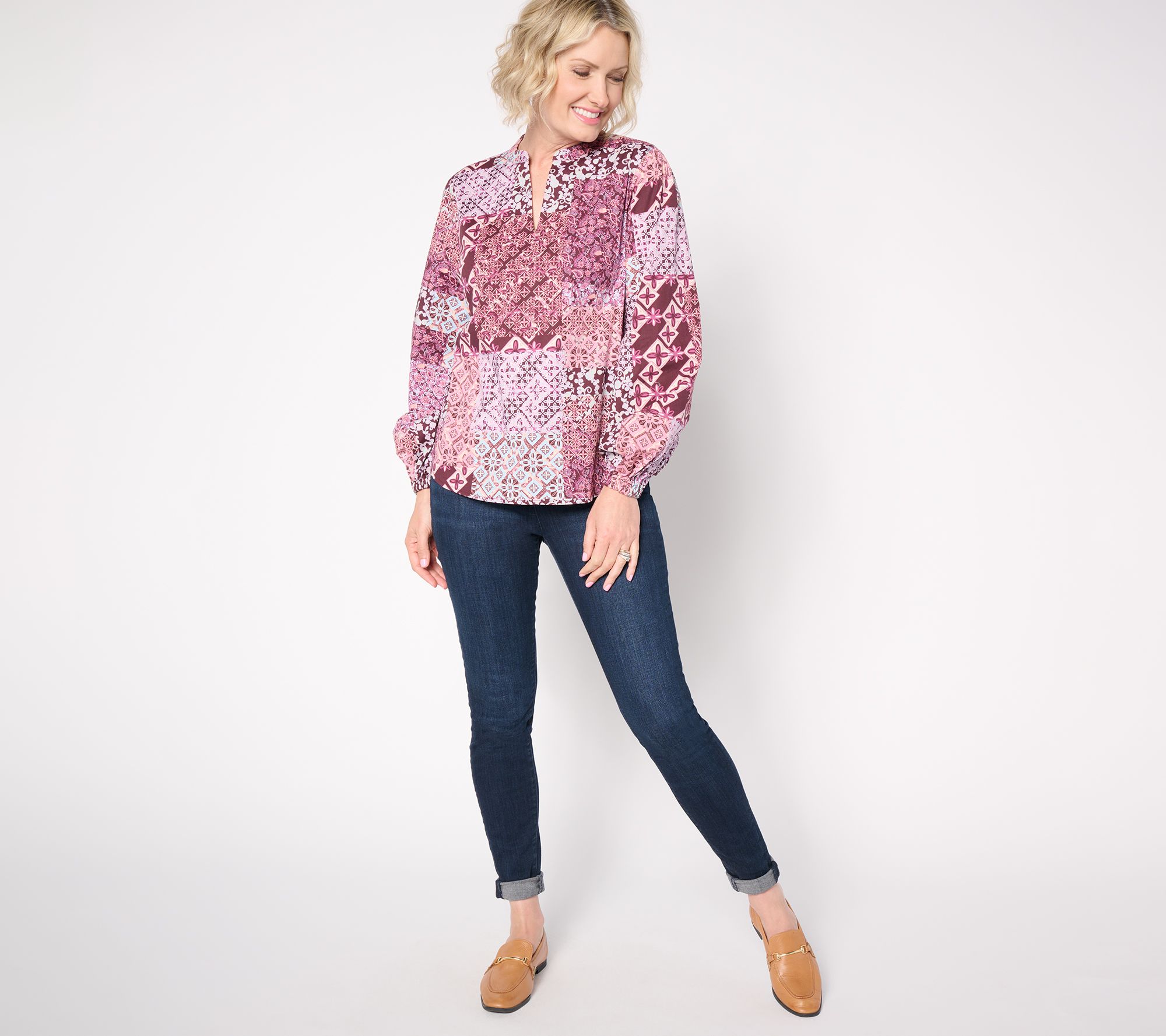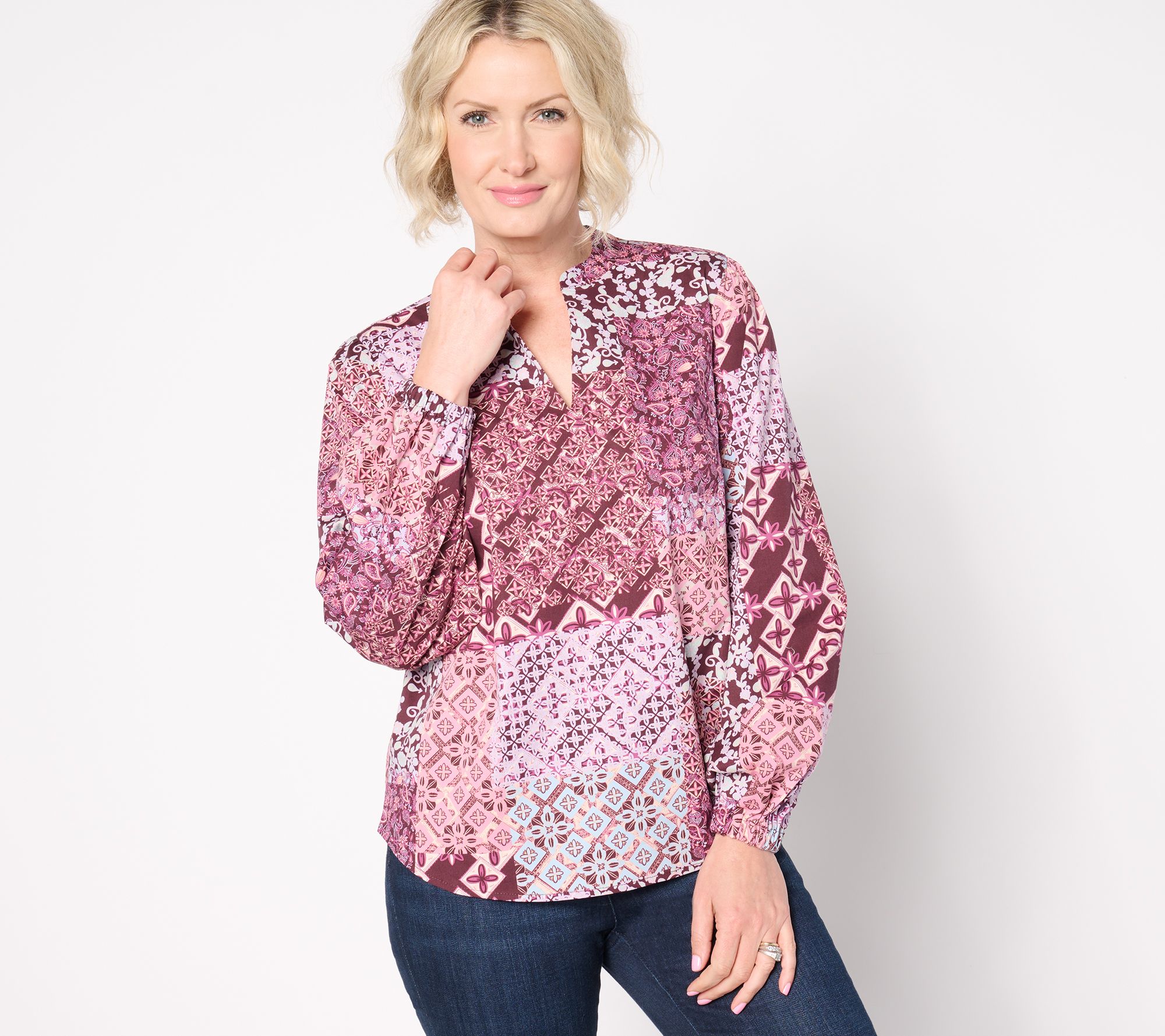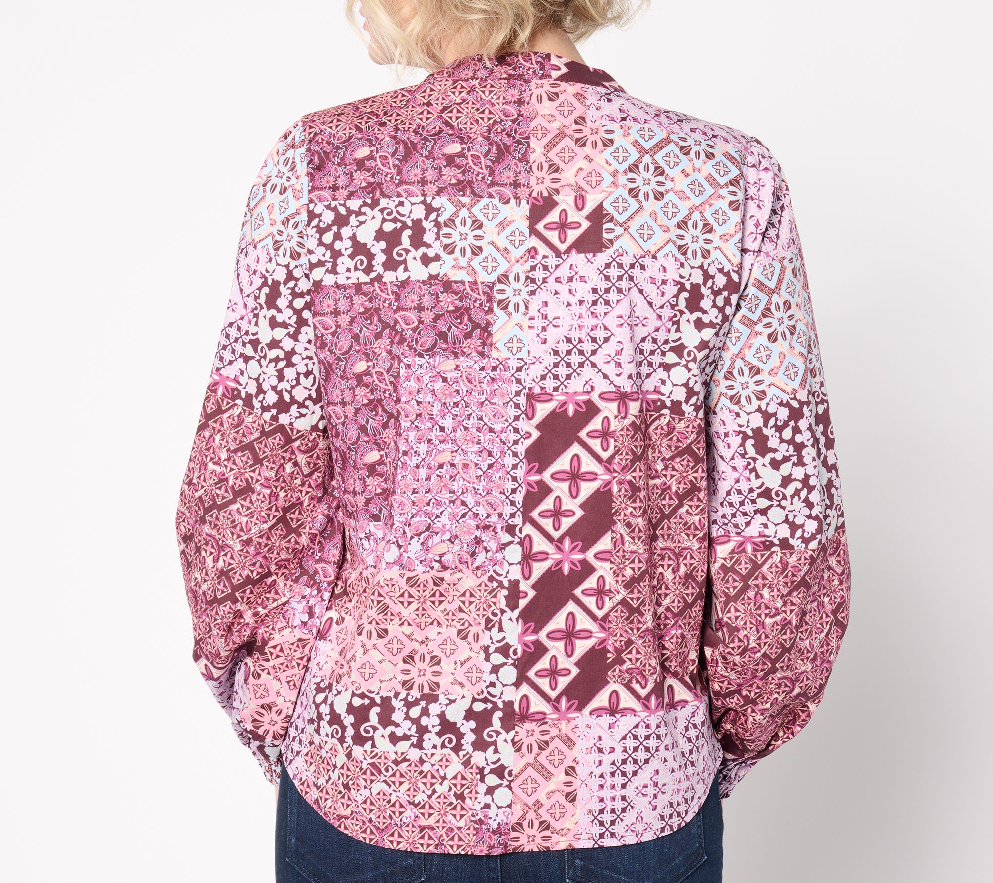 • Features: allover patchwork print, long sleeves with elastic cuff, split neck, shirttail hem