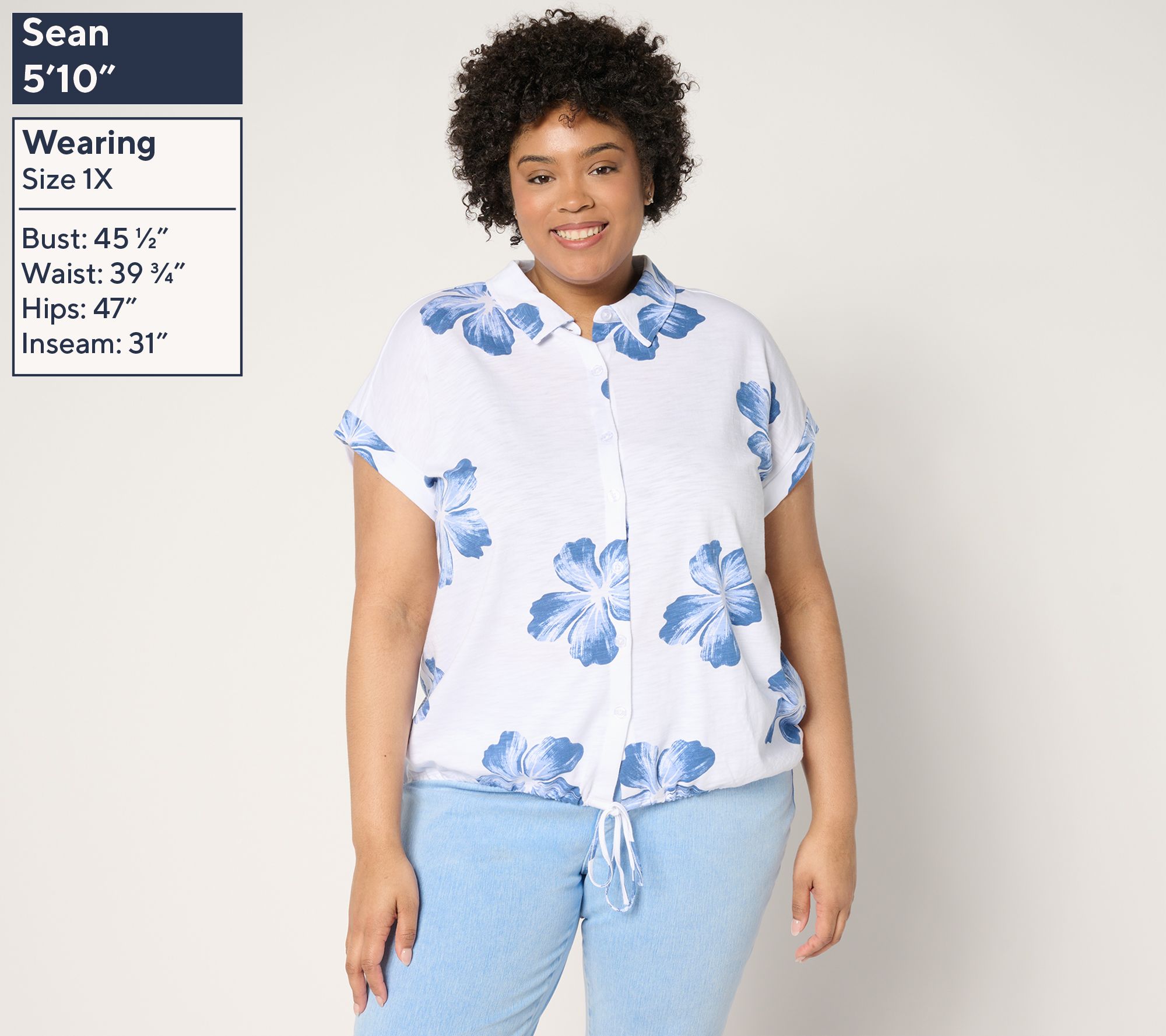 • Features: short sleeves, button-front closure, drop-shoulder style, straight bottom hem with drawstring tie