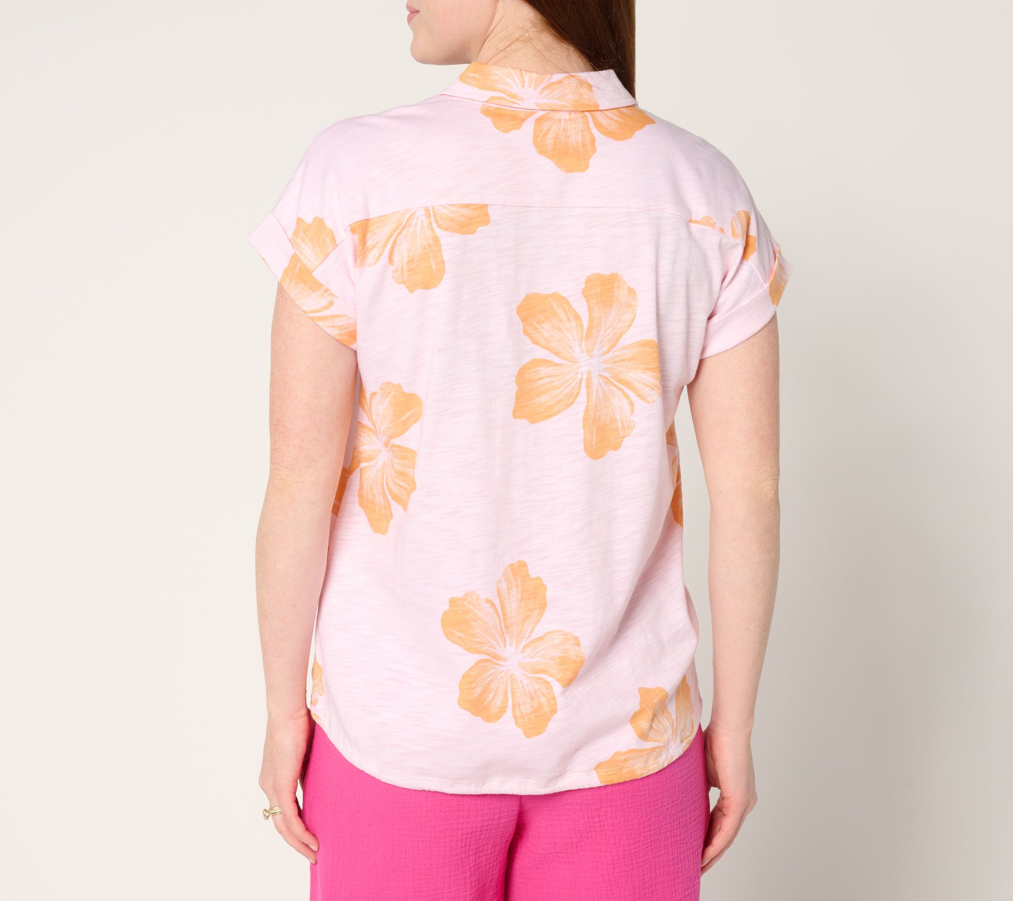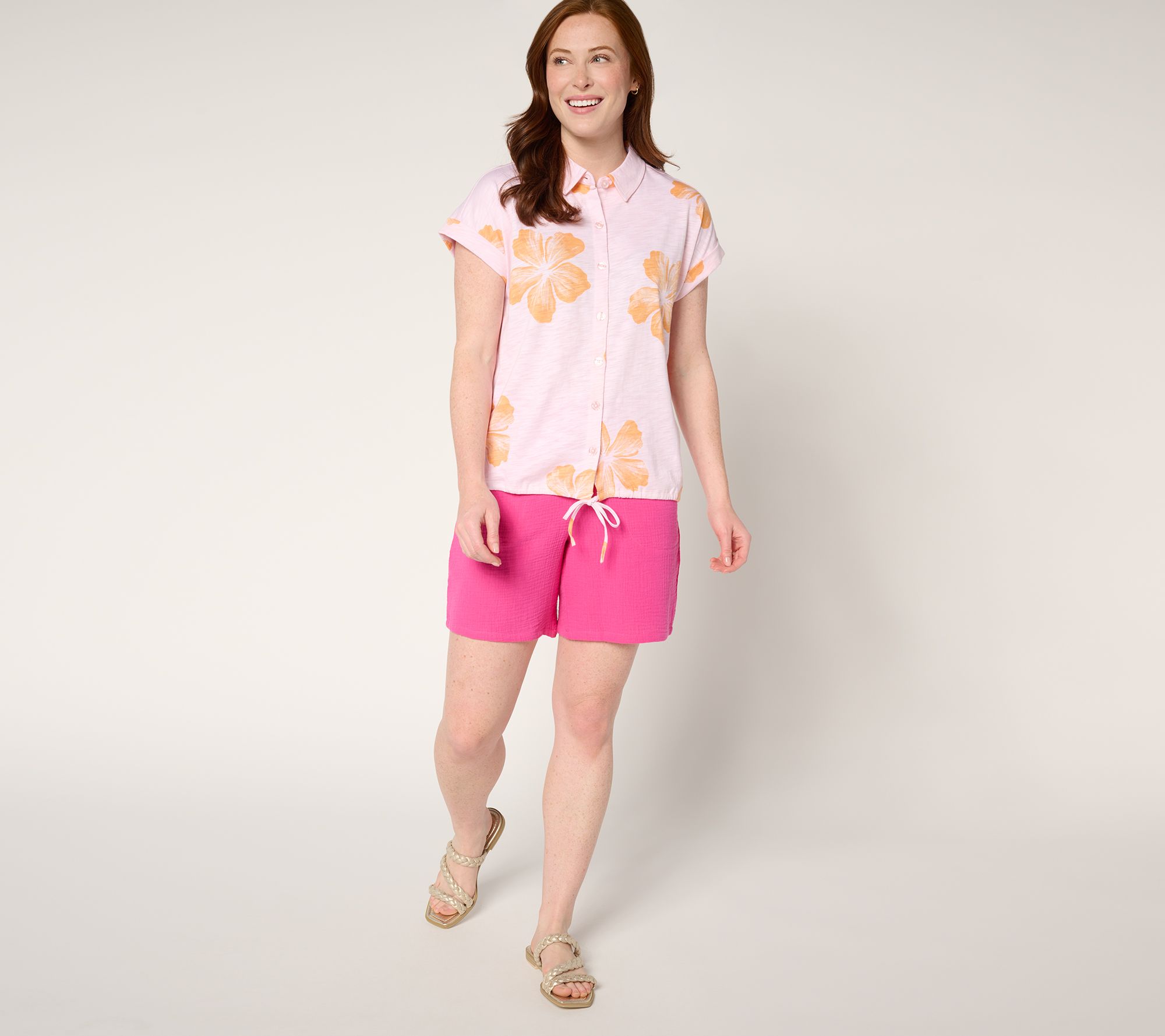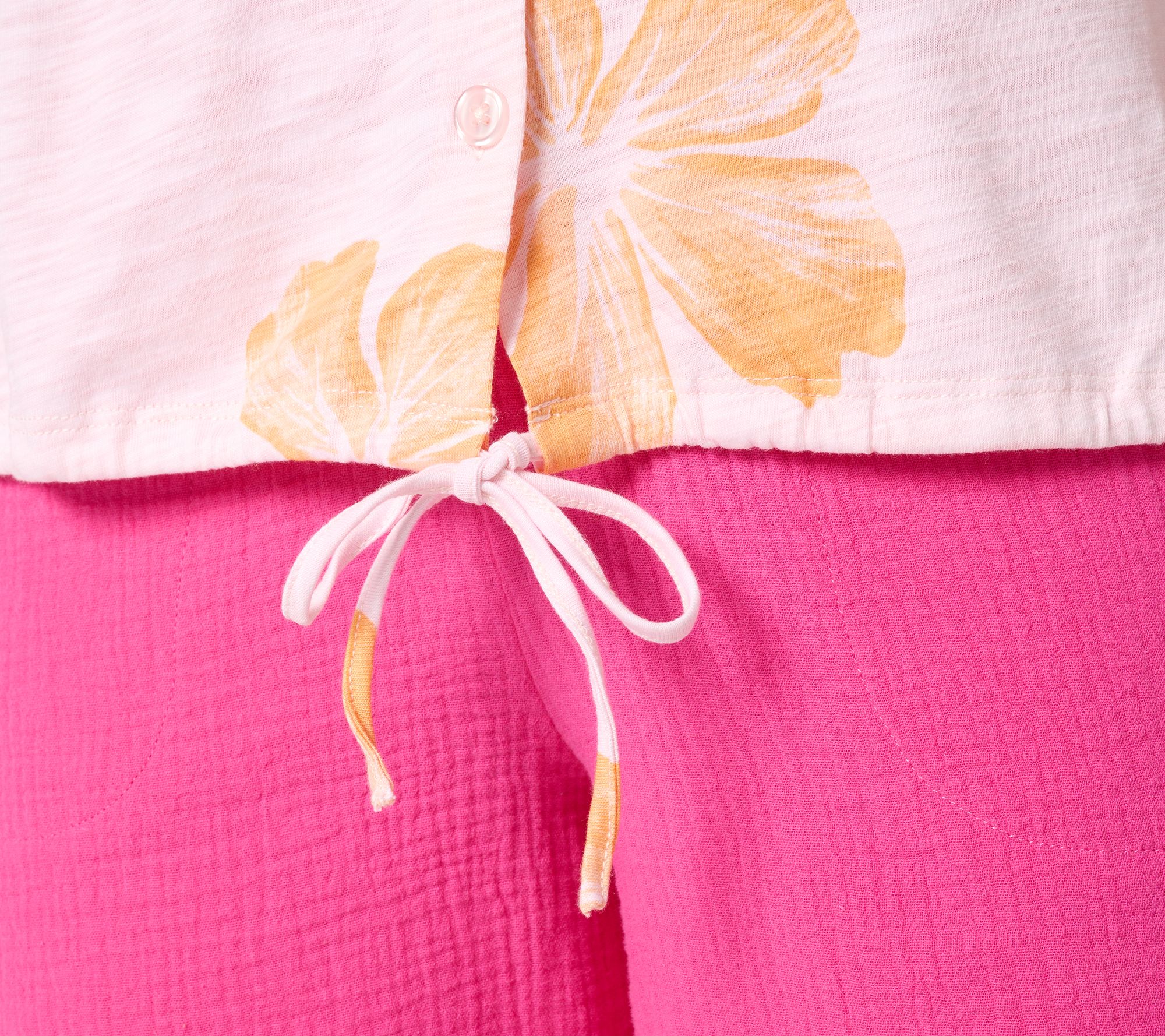 A sweet escape awaits in this short-sleeve button-front top, ready for sun-drenched days and balmy evenings. Draw the tie at the hem for your preferred shape -- loose for a breezy vibe or cinched for a playful finish. The soft cotton-modal blend (with easy drop-shoulder silhouette) makes it a go-to for vacations, weekend hangs, and a dash of daily aloha. From Belle by Kim Gravel.