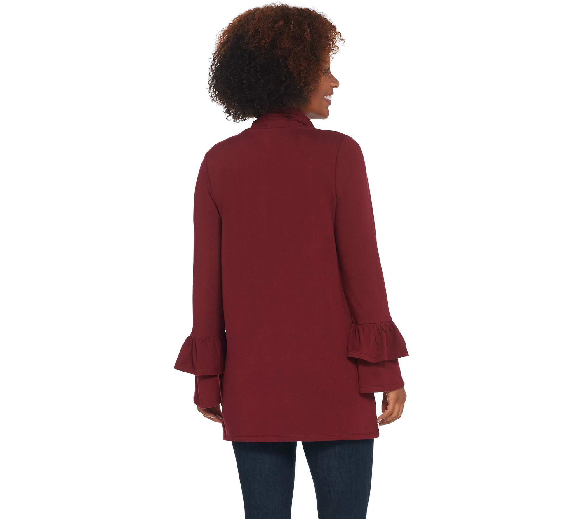 Ruffled bell sleeves infuse this classy cardigan with feminine charm. From Belle by Kim Gravel.