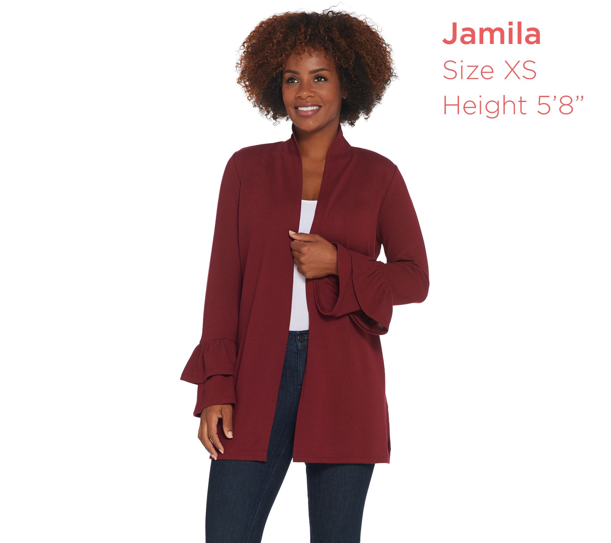 • Features: open front, long bell sleeves with ruffle details, side slits