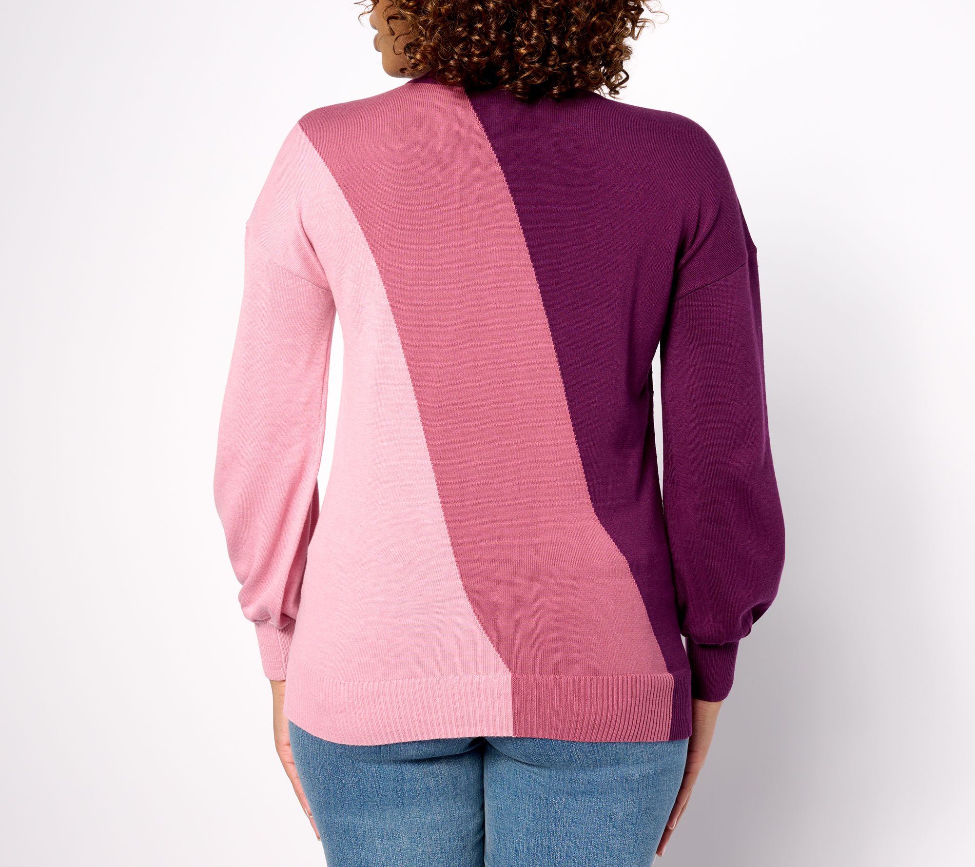 A diagonal color-block design gives this sweater a distinctive look you'll love. From Belle by Kim Gravel.