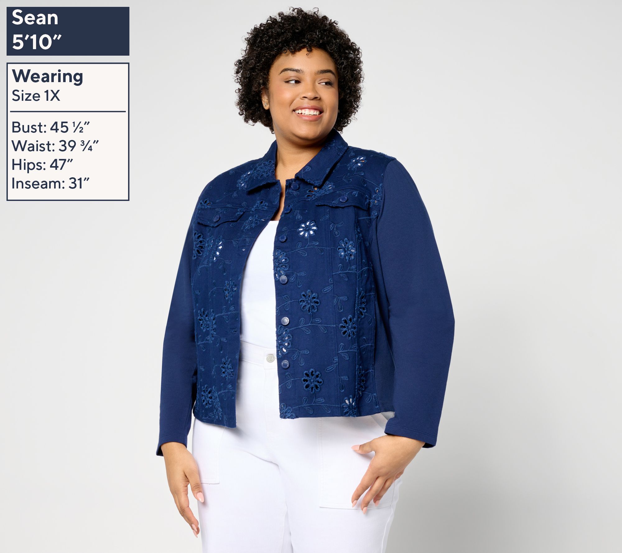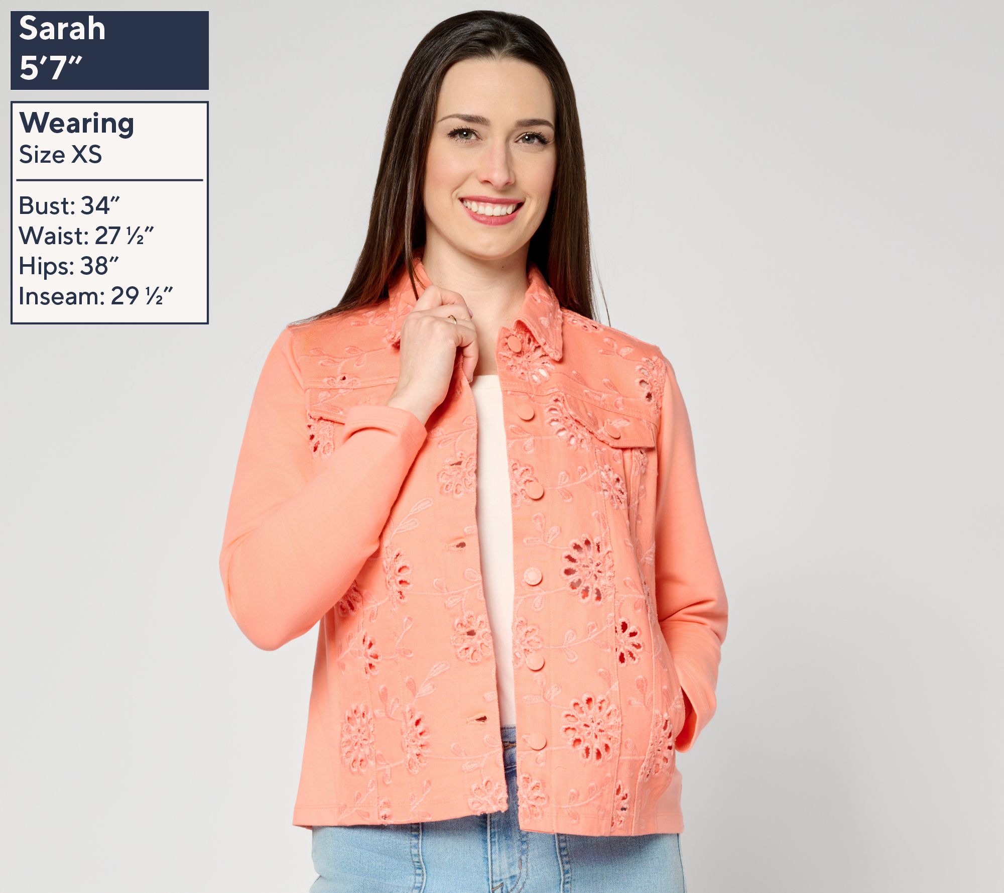 How to make a sweet tee even sweeter? Throw this eyelet jacket on top! Soft knit sleeves and back panels keep the charm-infused style reliably comfy, letting you move freely between busy morning appointments, a stylish lunch date, and sunset sips on the porch. From Belle by Kim Gravel.