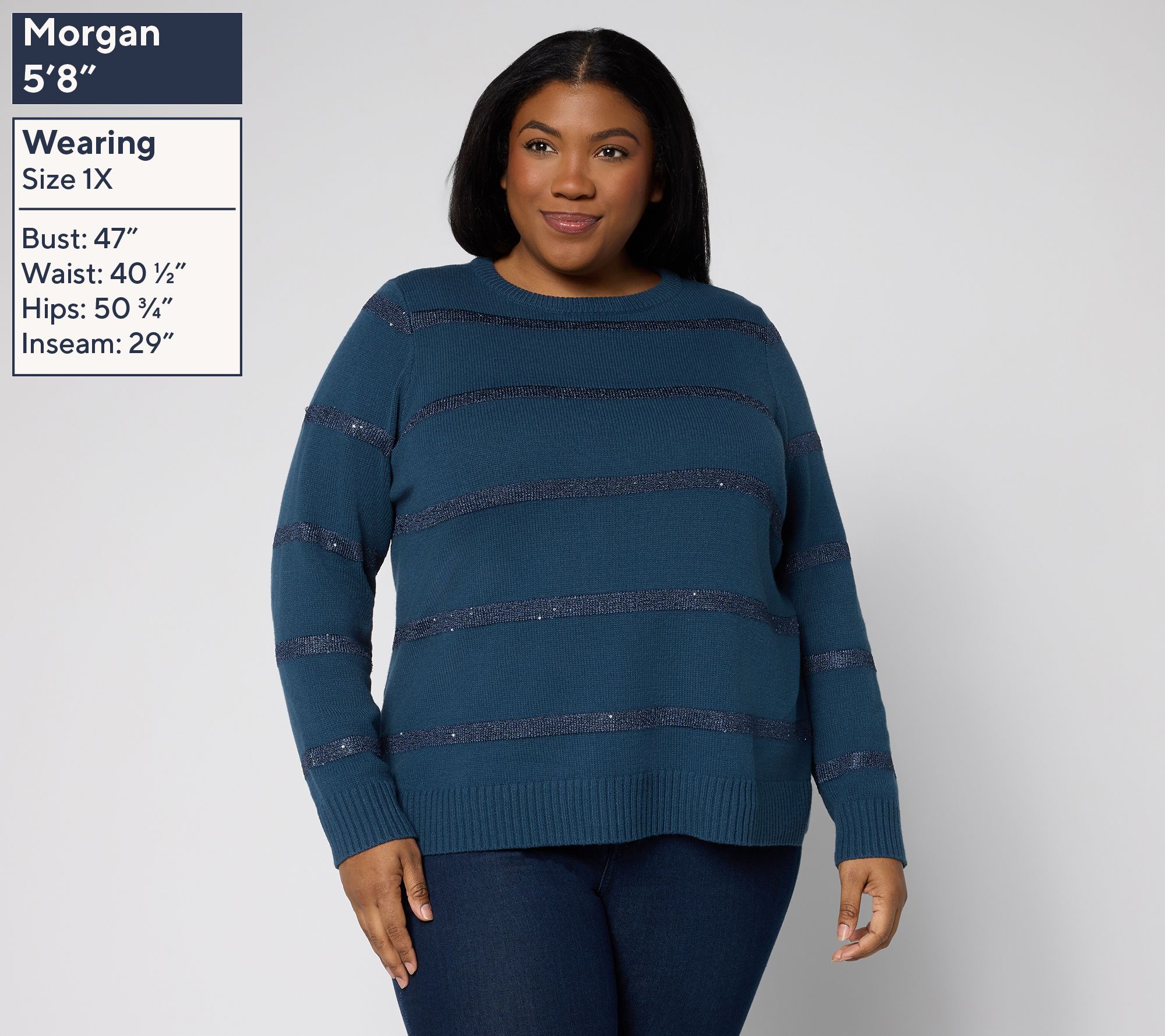 Shimmer and style meet in this crewneck sweater, ready to catch the light wherever your day takes you. Delicate micro sequin stripes add subtle sparkle to the straight hem and ribbed cuffs, giving casual looks a polished upgrade for brunch or date night. Try it with leather pants or relaxed denim for an easy statement. From Belle by Kim Gravel.