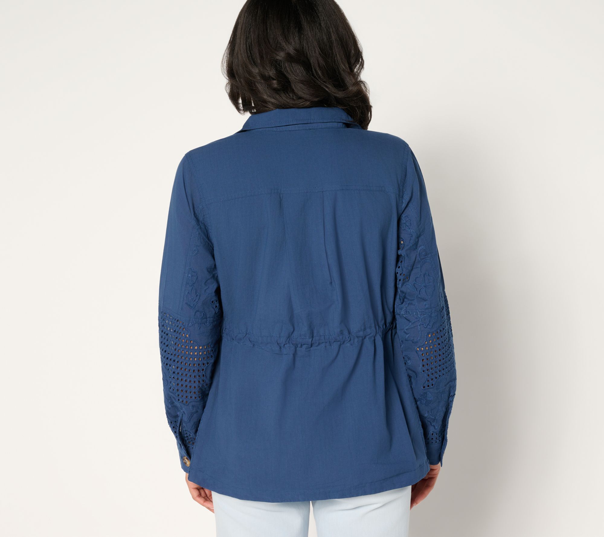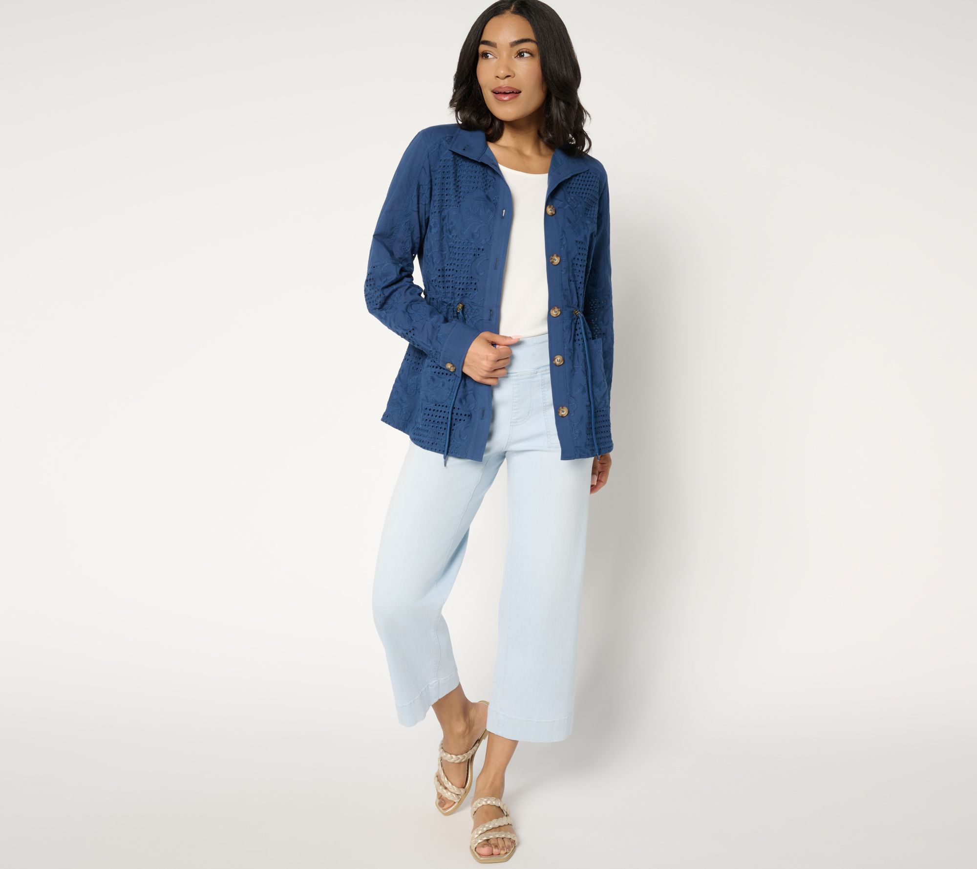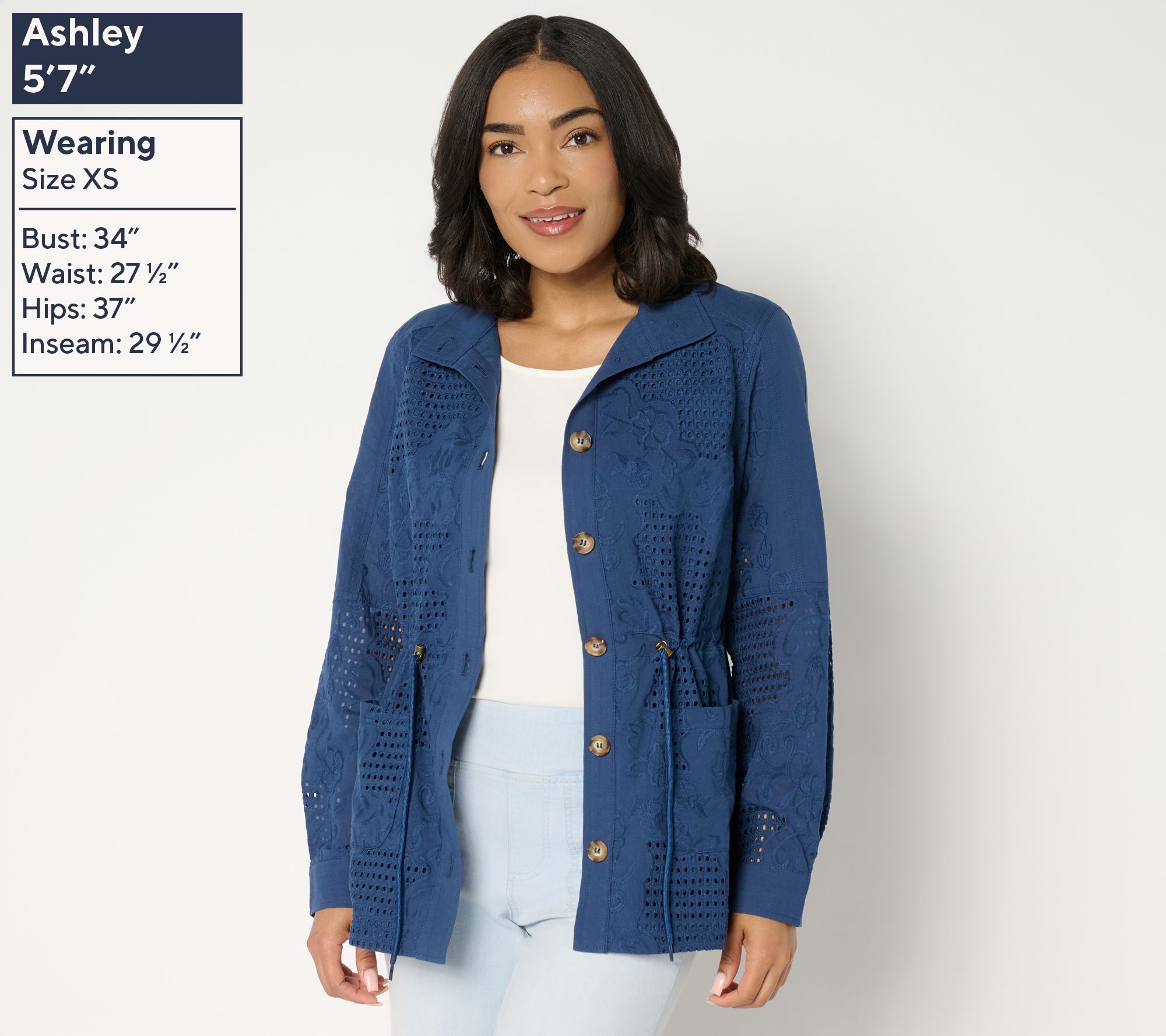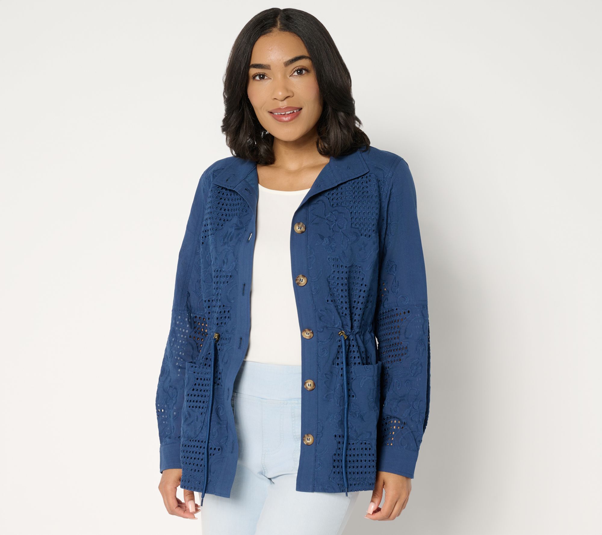 Give your outerwear a well-deserved boost with this chic mixed media lace anorak. With a cinched waist and on-trend button front closure, the distinctive look makes a stylish addition to your everyday outings. From Belle by Kim Gravel.