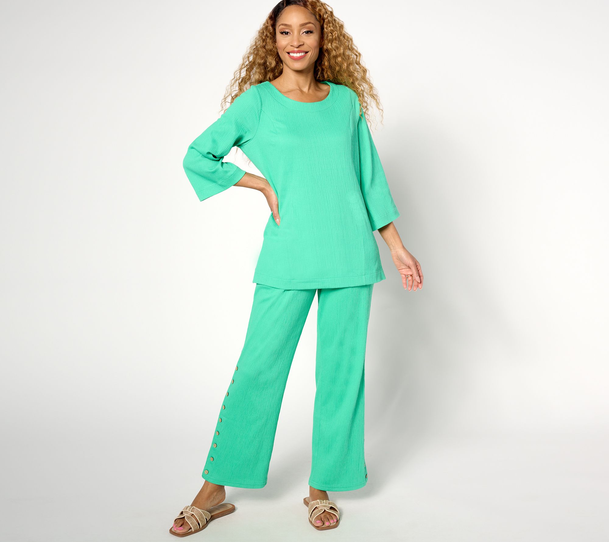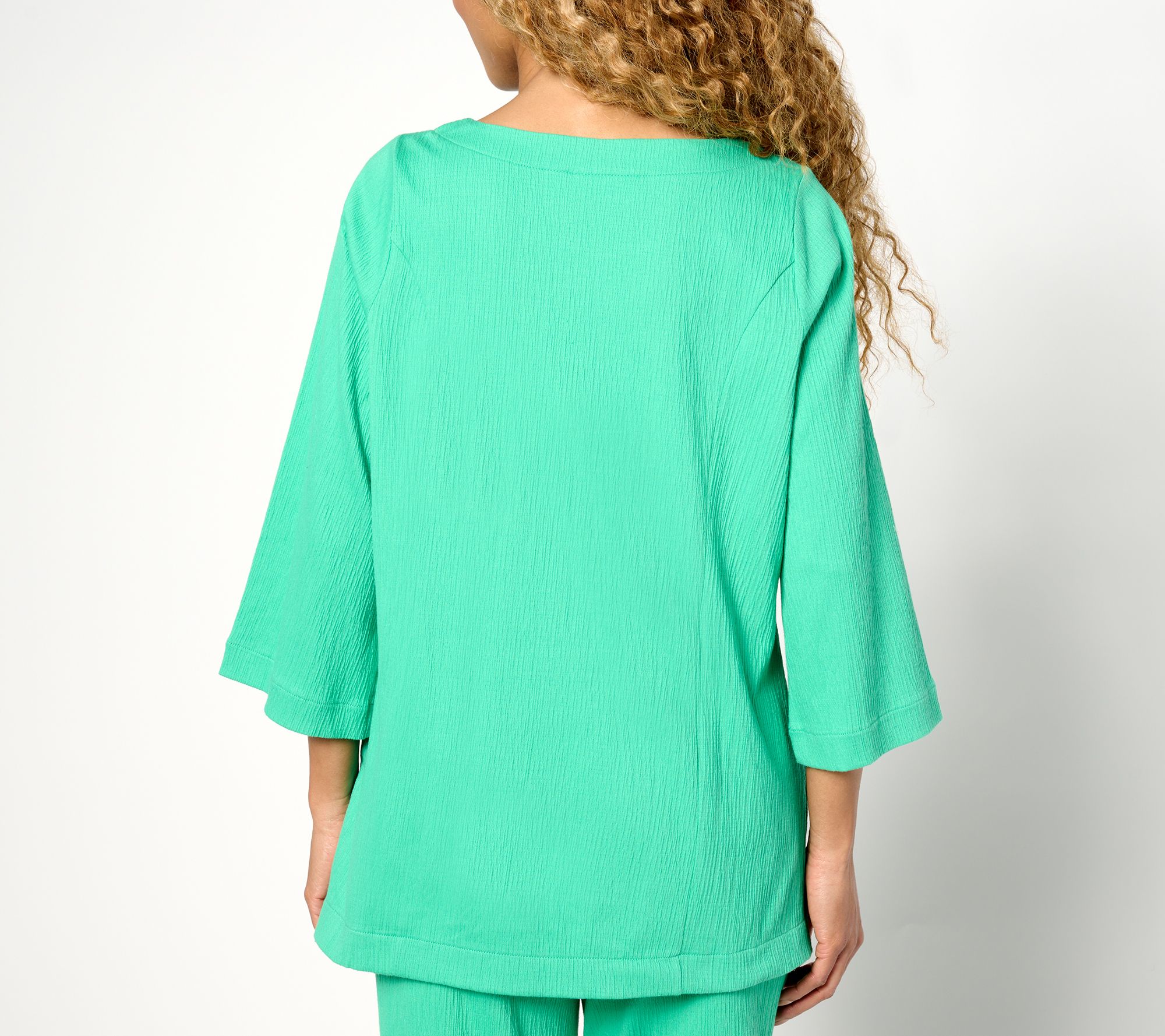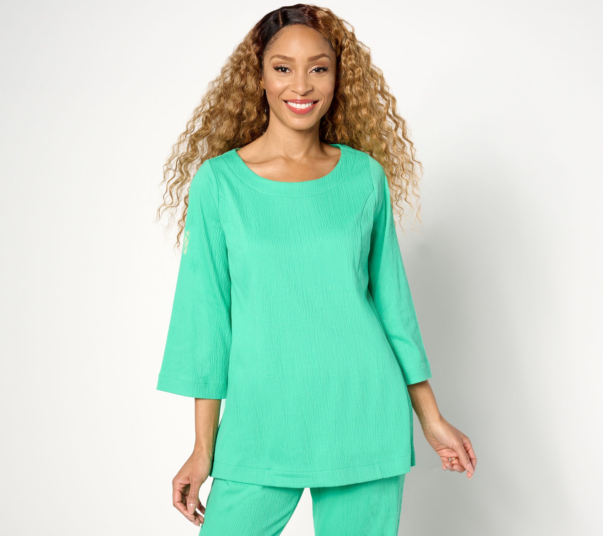 Low-stress, luxe-looking style is in the (getaway) bag with this Packabelle knit tunic. Princess seaming provides polished structure that's perfect for resort dining and beyond. From Belle by Kim Gravel.