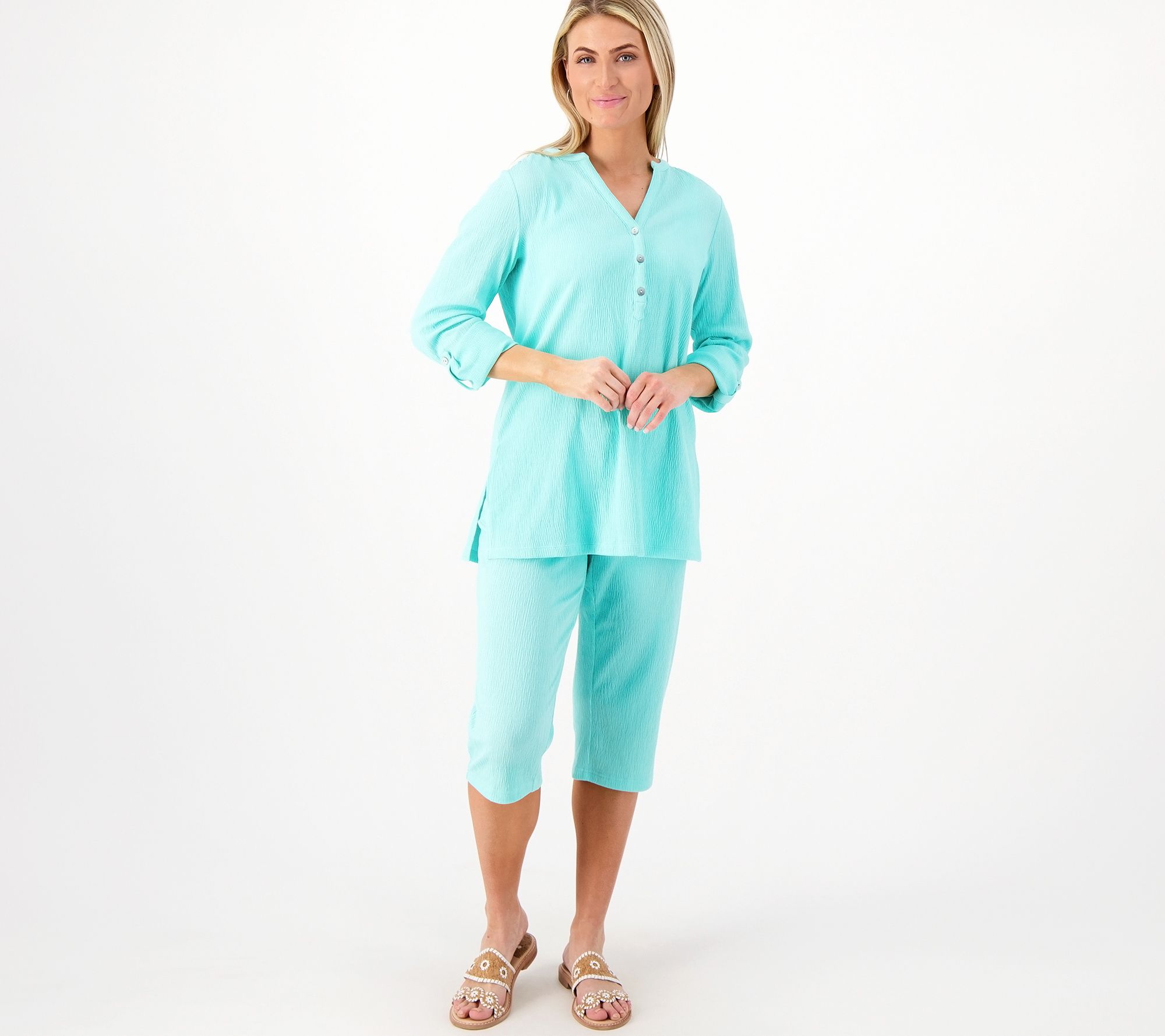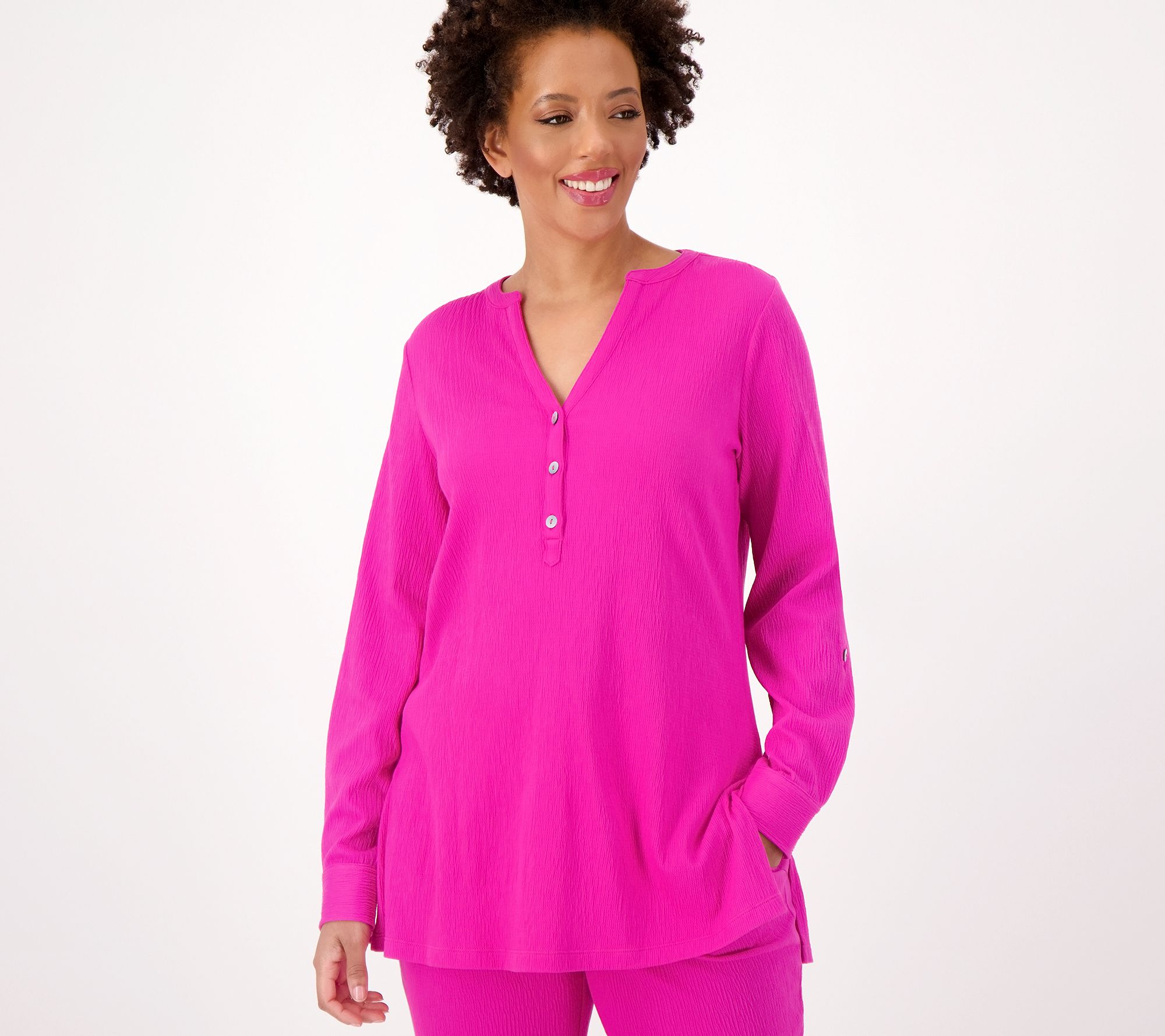Feeling the vacay vibes? Just looking at this roll-tab top, we are too! Comfortably crafted with Packabelle knit fabrication, this henley is happy to go wherever you go. From Belle by Kim Gravel.