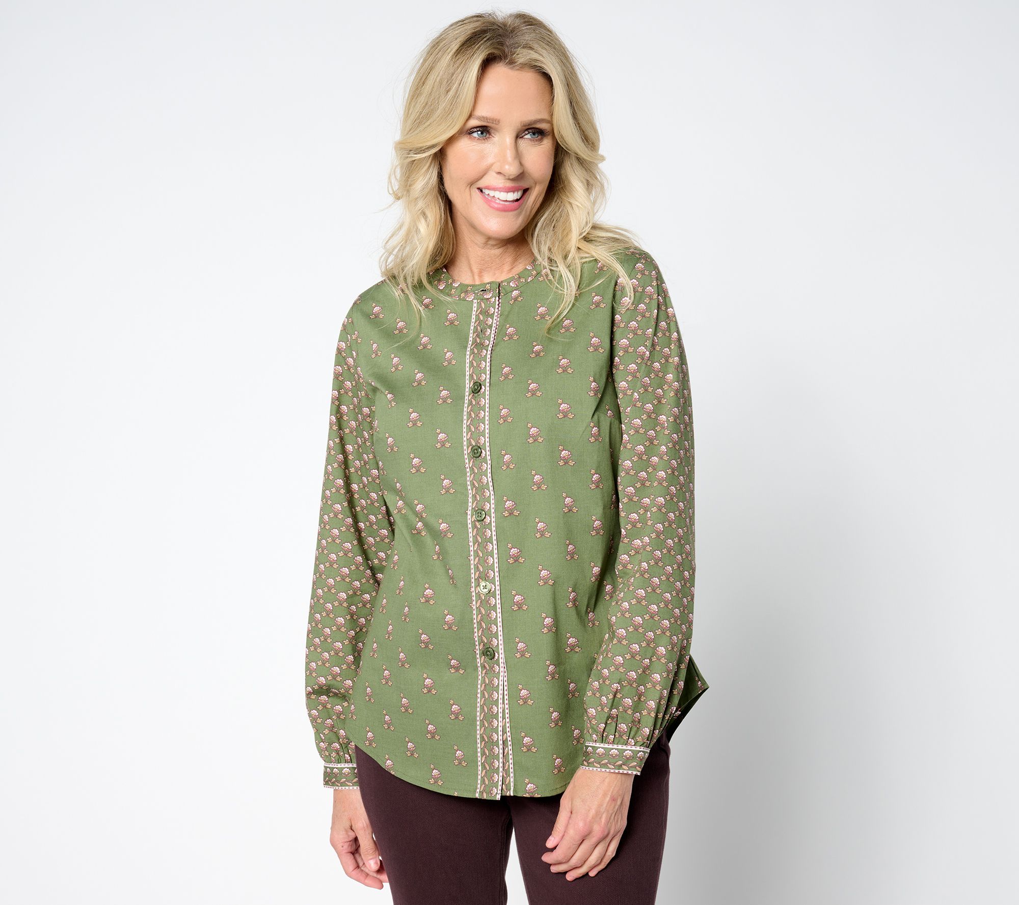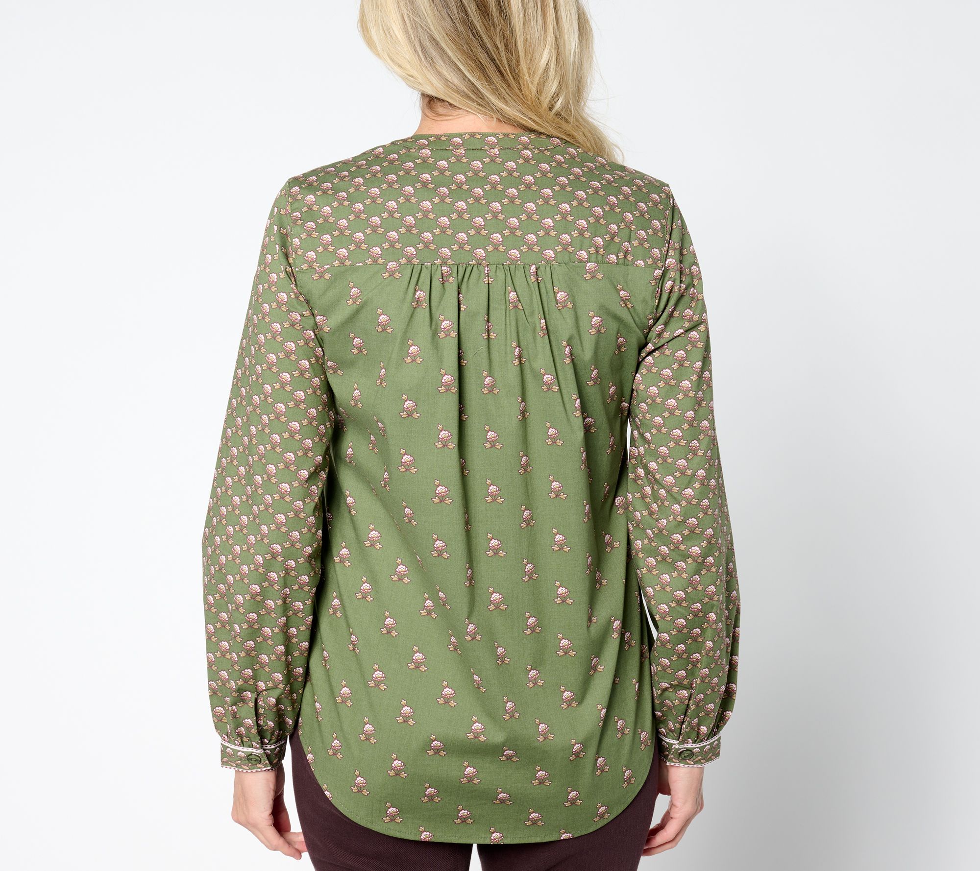 • Features: button-front, band collar, hi-low shirt tail hem, back yoke with shirring, long sleeves, mixed print pattern