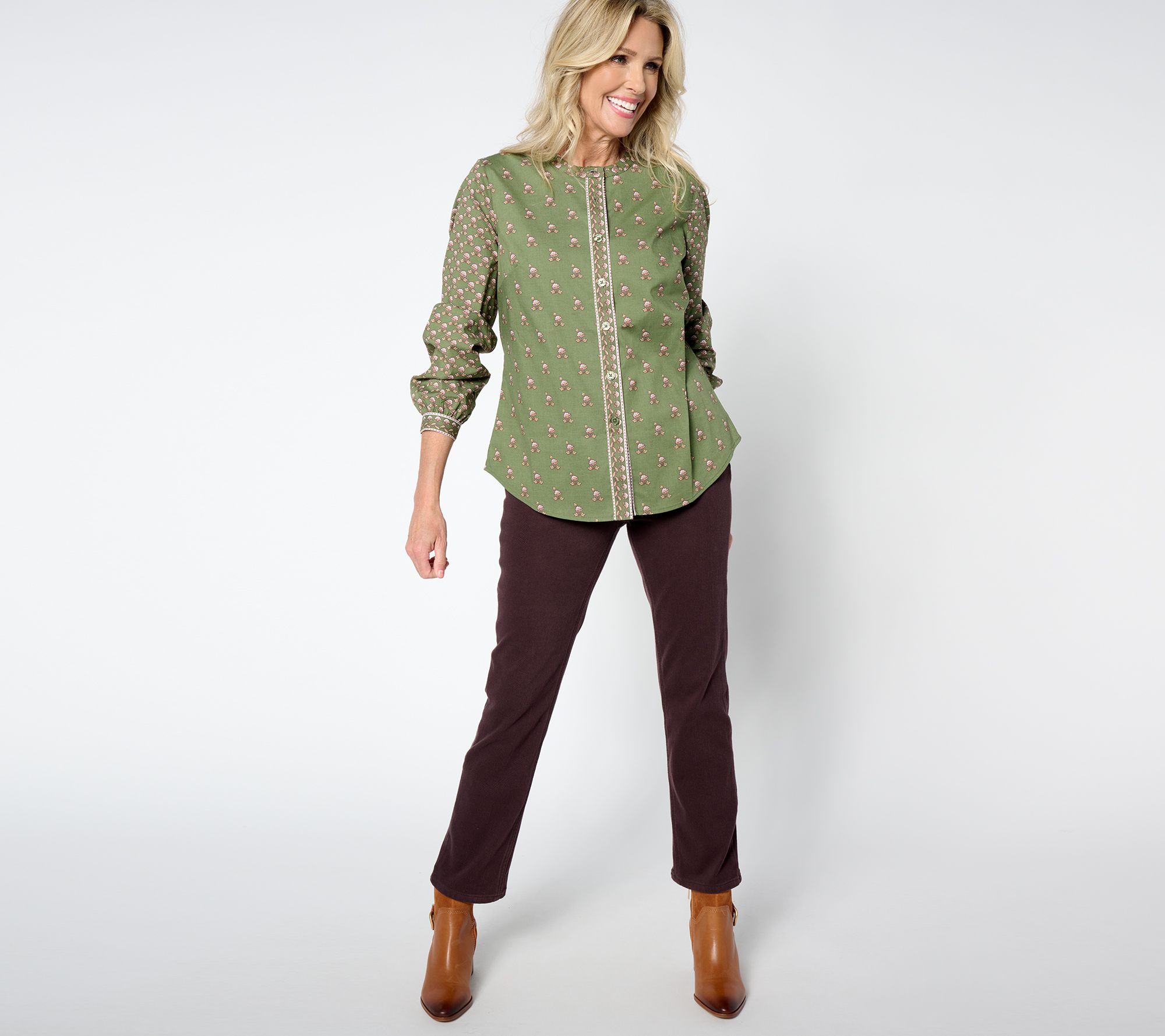 Playful prints add an energetic vibe to any outfit. Exhibit A: this perfect patchwork blouse from Kim Gravel. A hi-low shirttail hem and button-front closure gives the top a more polished silhouette, while the carefully coordinated mixture of prints creates eye-catcihng interest. From Belle by Kim Gravel.
