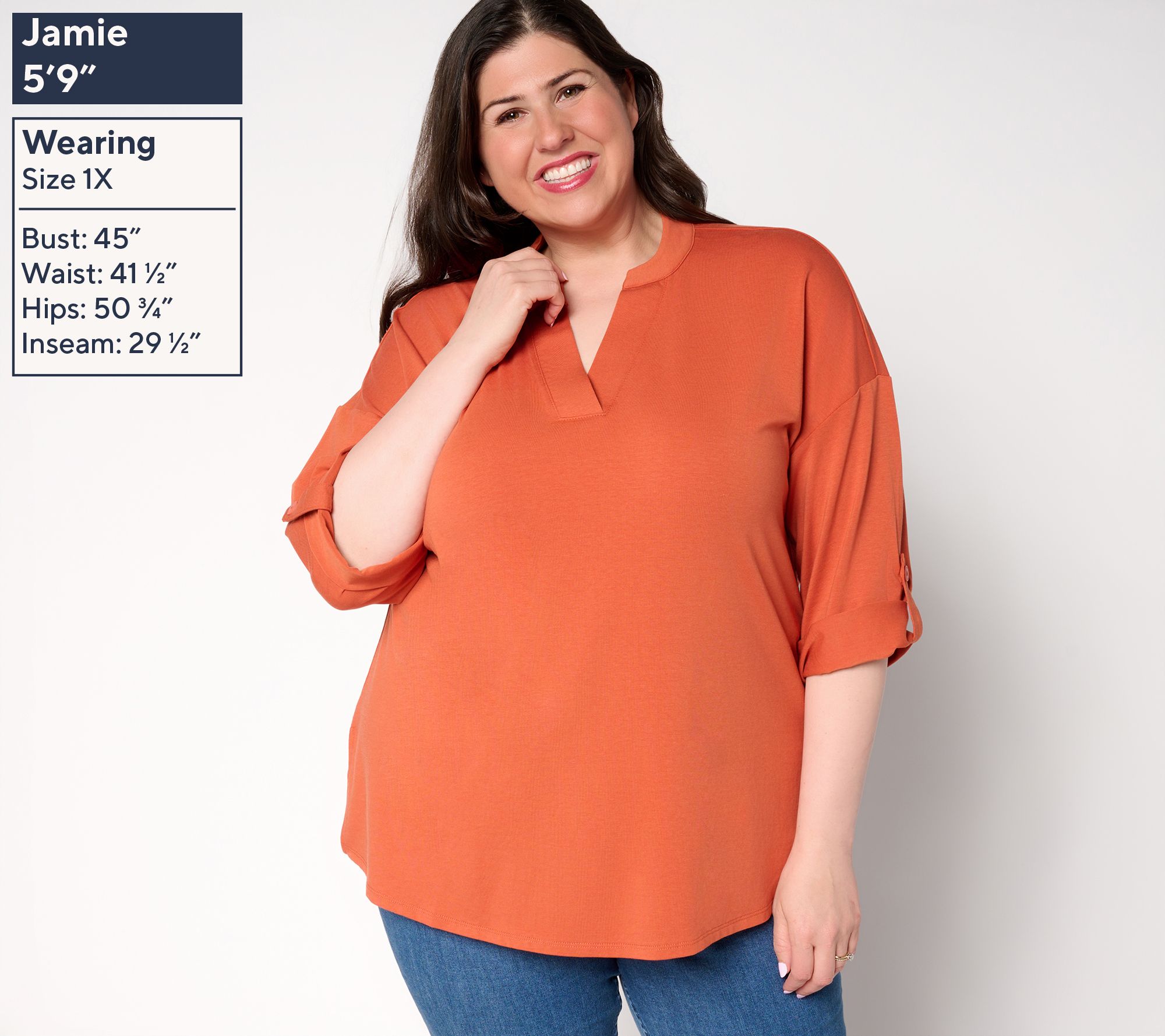 Everyday moments? They deserve a little style, too. This split-collar design from Kim Gravel, with easy drop shoulders and sleeve tabs, lends a modern yet relaxed vibe in smooth TripleLuxe, while side slits at the straight hem add comfort for on-the-go plans and laid-back afternoons. From Belle by Kim Gravel.