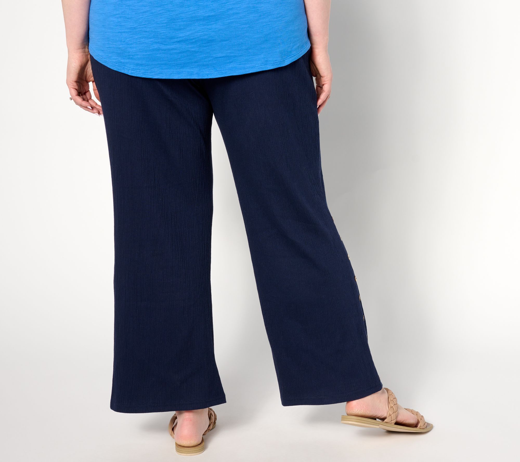 Low-stress, luxe-looking style is in the (getaway) bag with these Packabelle knit pants. Buttons along the side seams provide polish that's perfect for resort dining and beyond. From Belle by Kim Gravel.