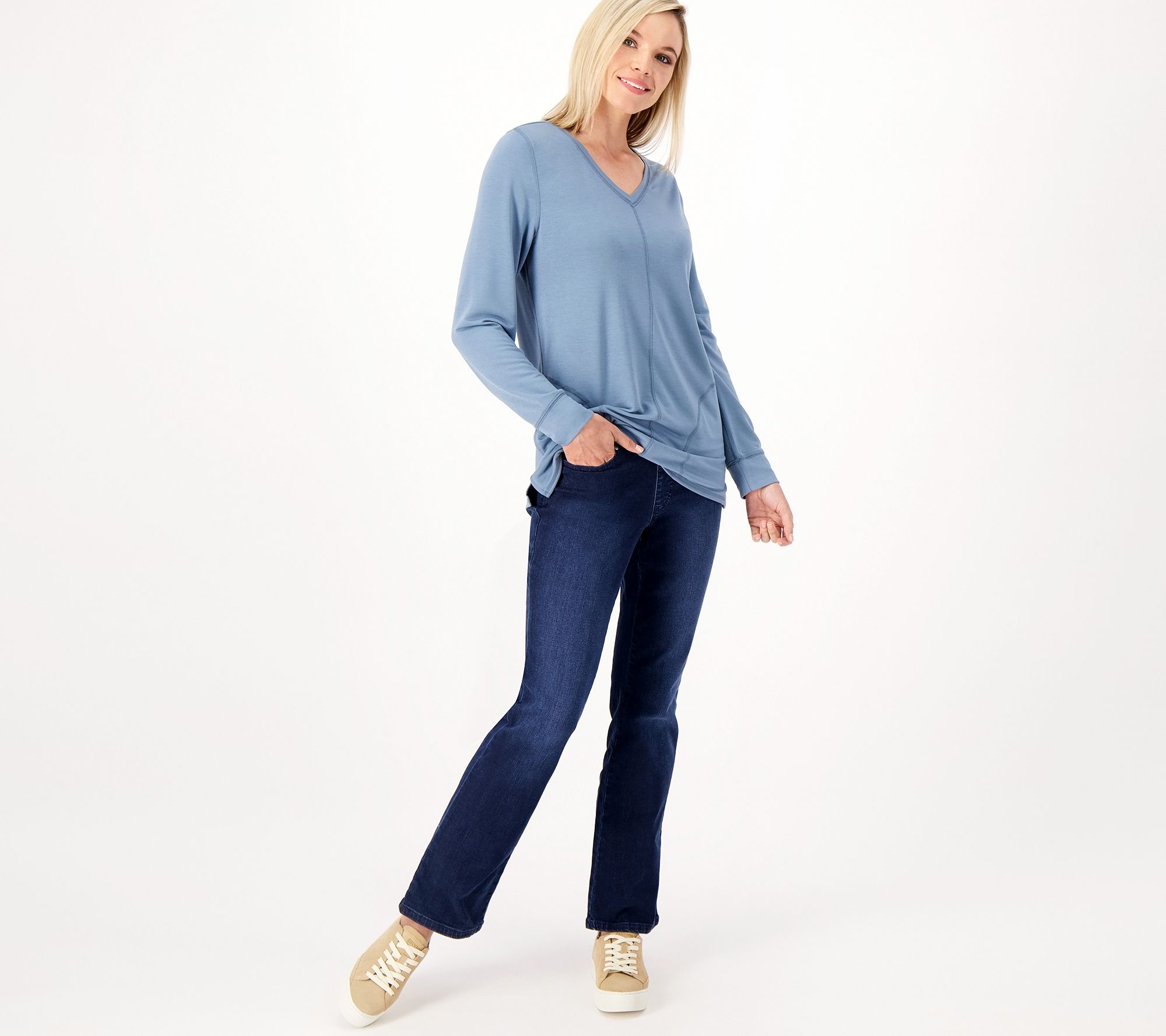 Think of her as something of a fashion scientist. Kim Gravel's cracked the jean code with this everyday boot-cut pair that mates pull-on styling with incredibly soft, incredibly livable (and believable!) TripleLuxe Denim. From Belle by Kim Gravel.