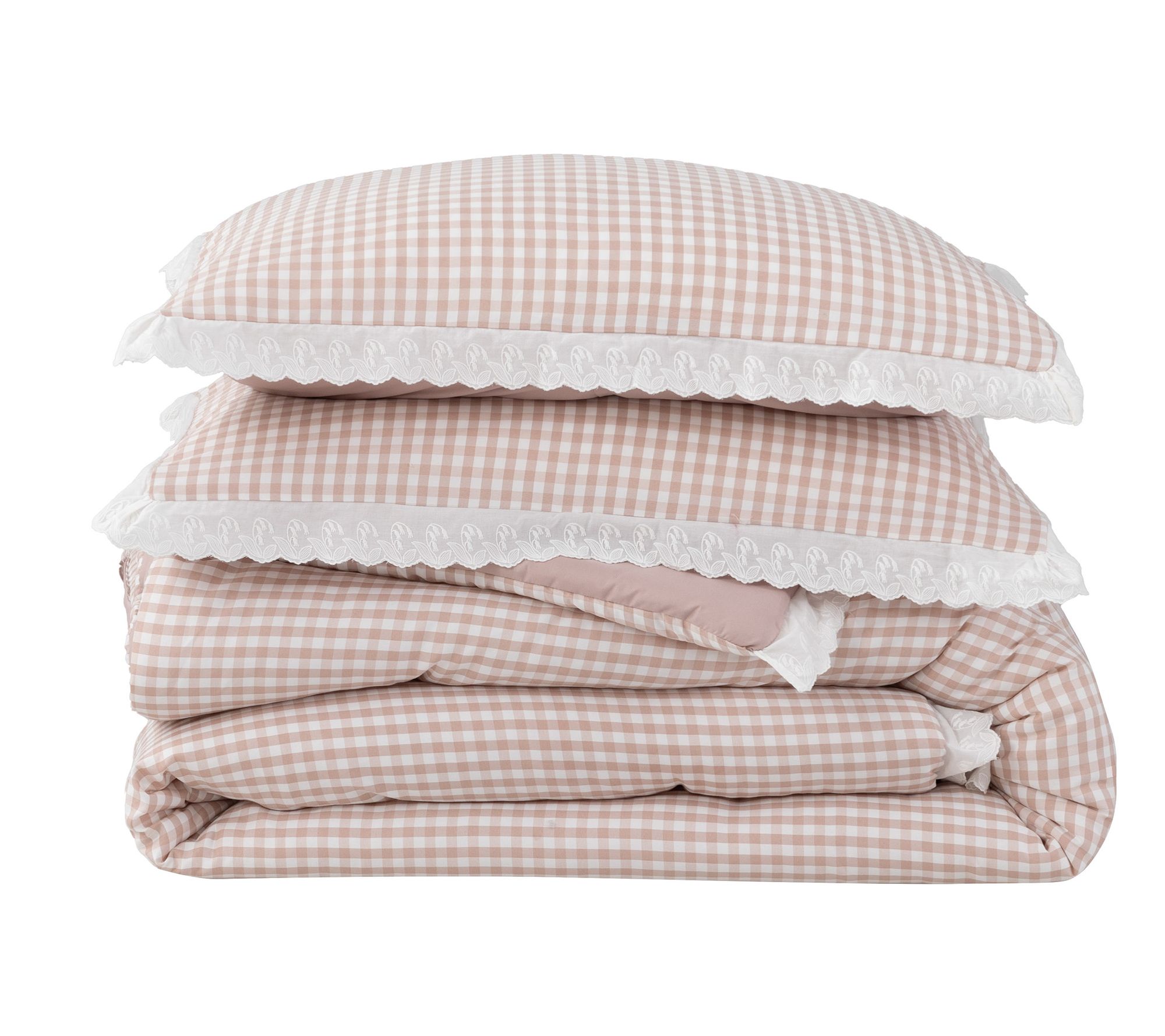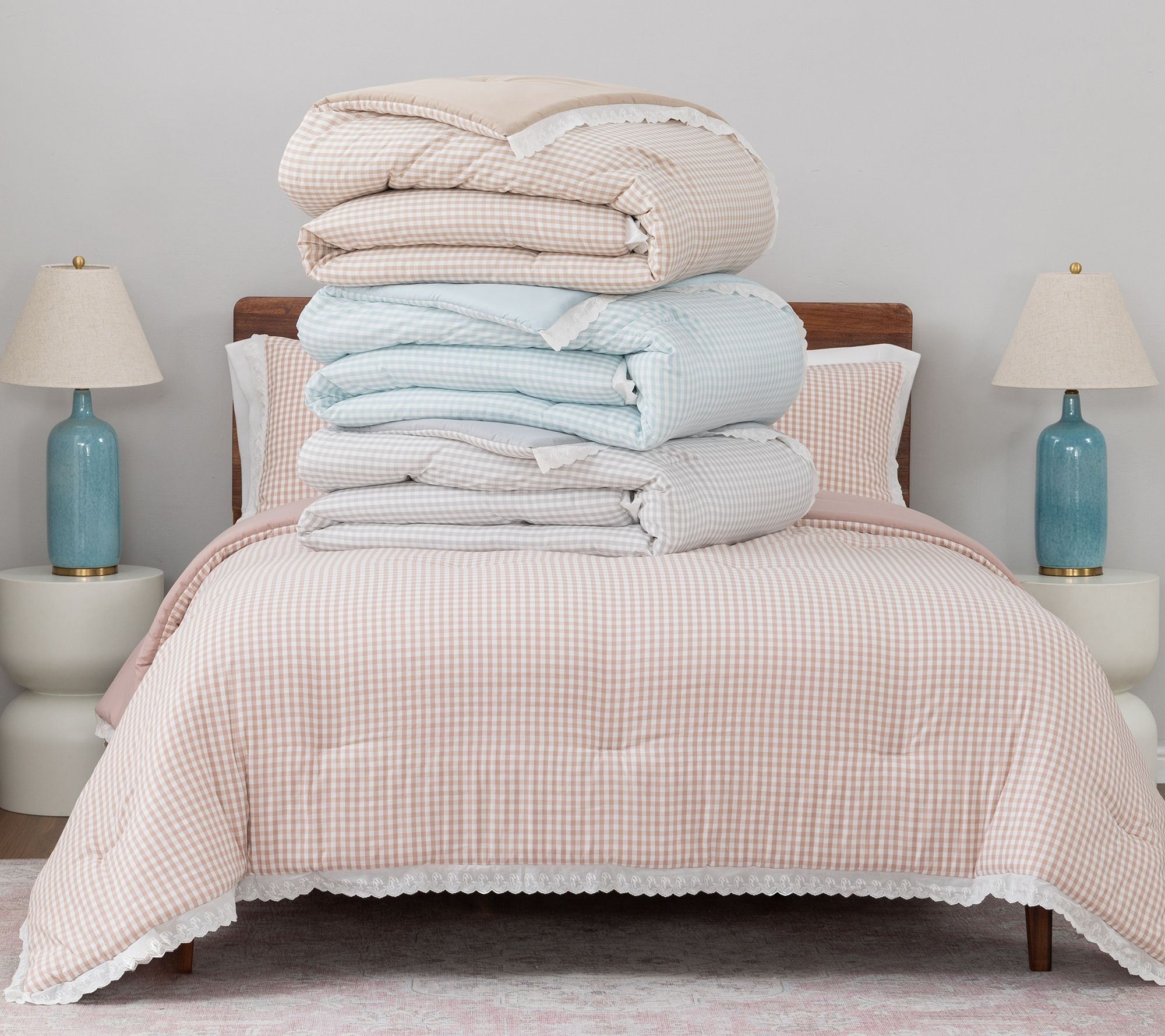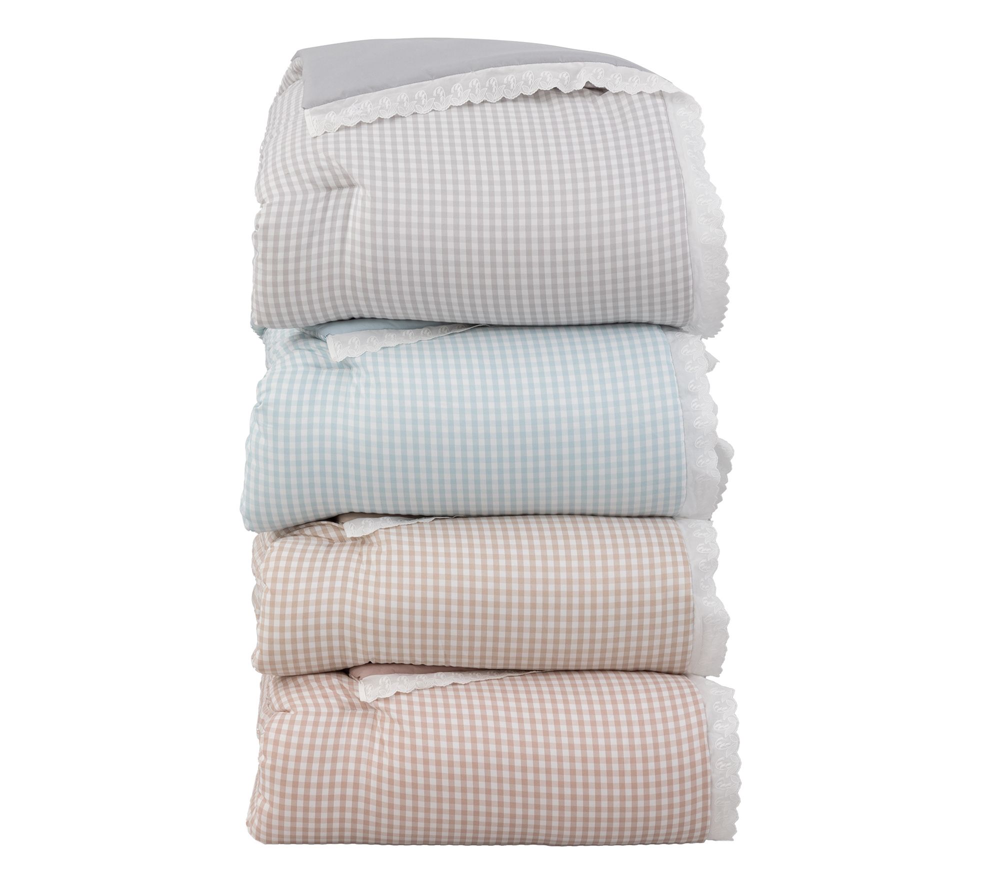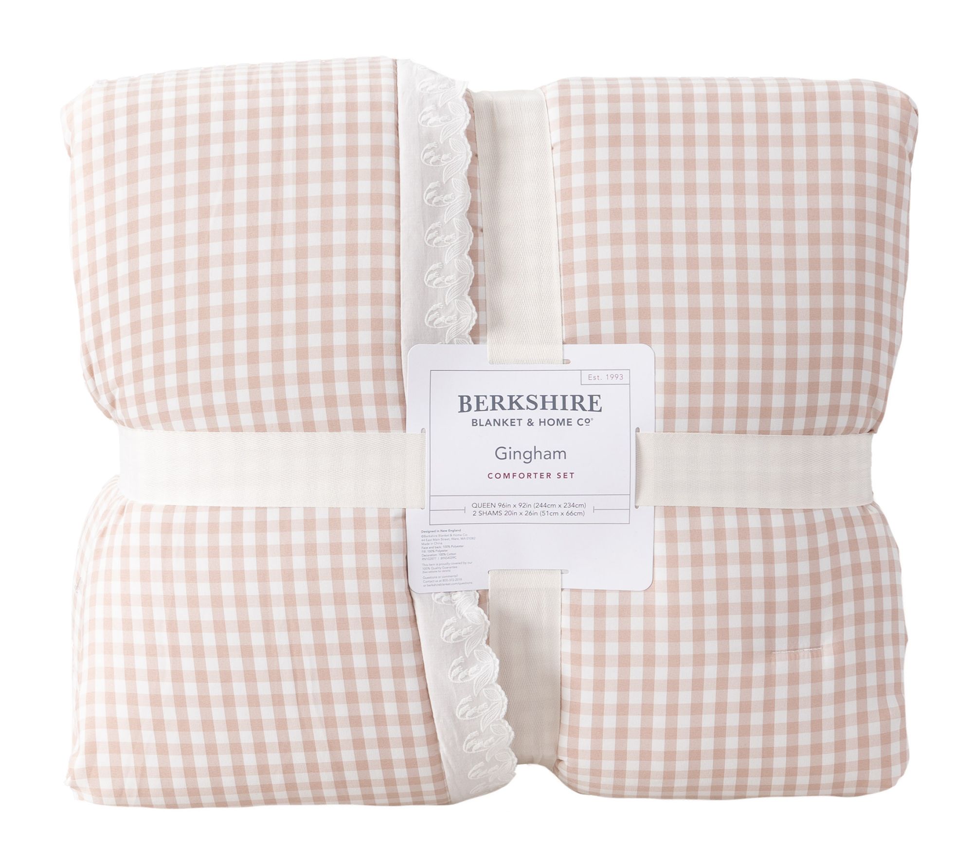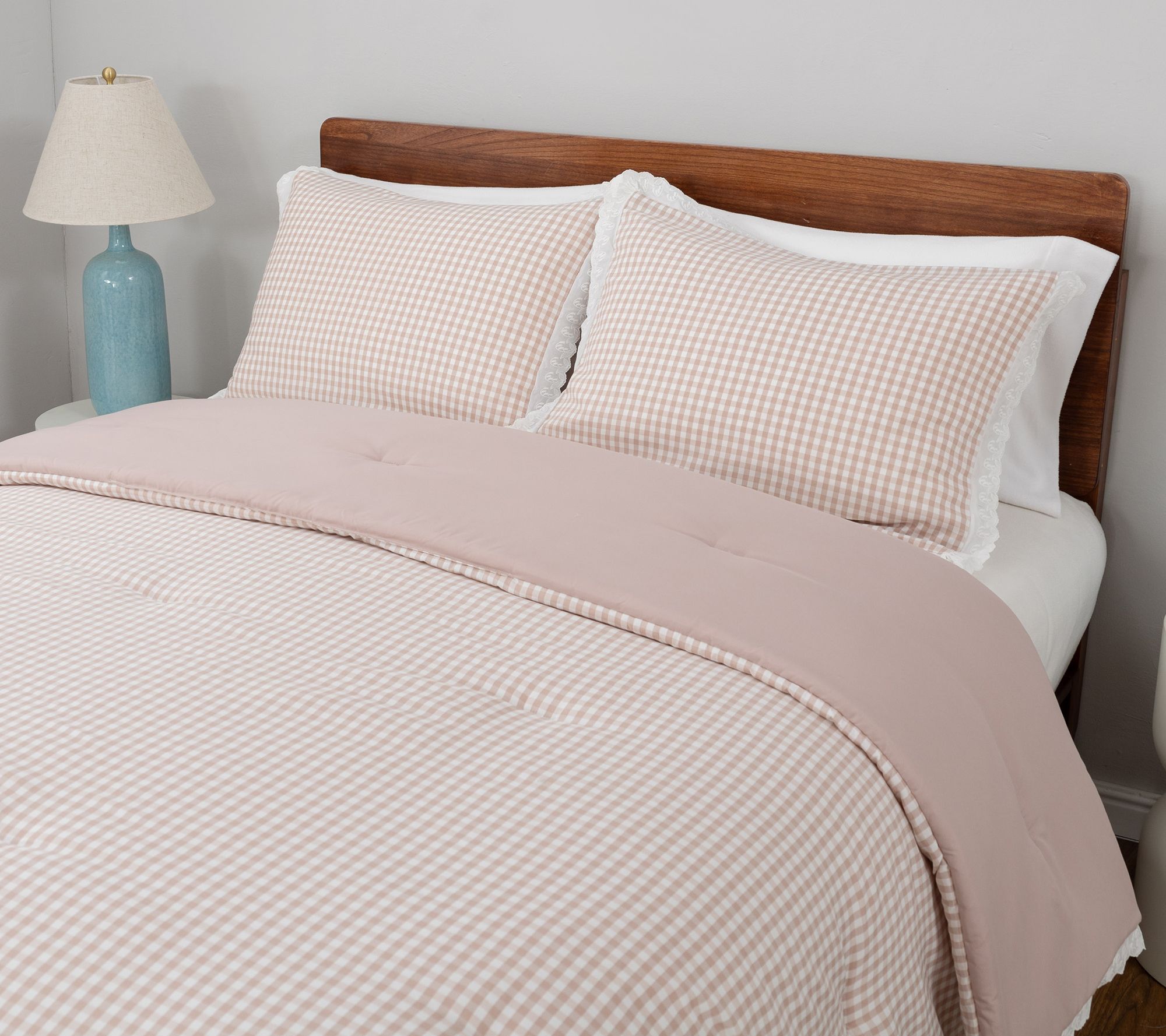 Turn your bedroom into a cozy haven with this charming gingham comforter and sham set, accented with delicate lace trim. The classic pattern brings a timeless feel to your decor, creating a serene retreat where you can unwind each day. Crafted for both comfort and style, this set adds a lovely layer of warmth and appeal to your space. From Berkshire.