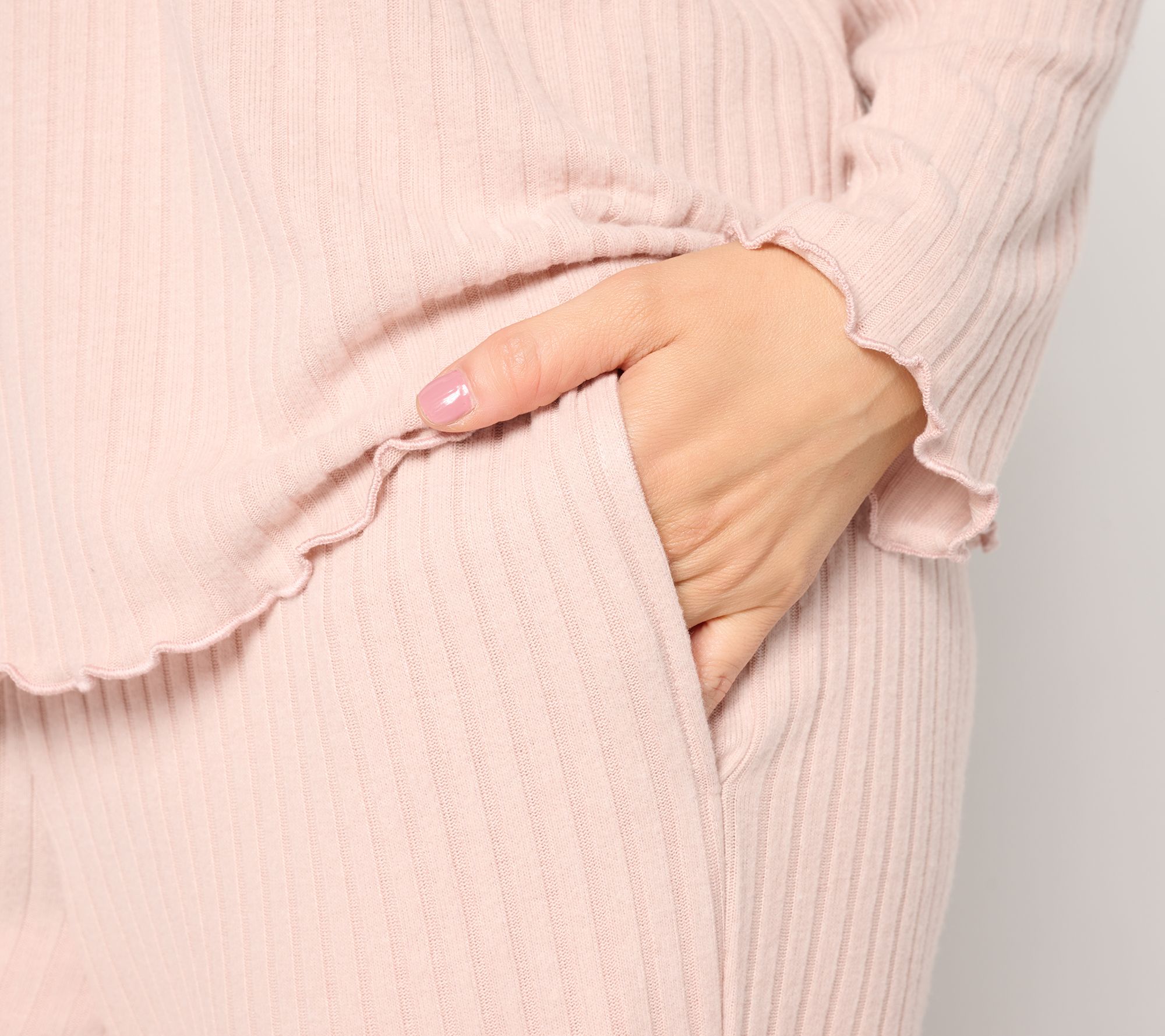 Lazy mornings just got more loungy with this ribbed heathered hacci lounge set. The knit fabric, V-neck top with lettuce edges, and side-pocket pants are an easy choice for kicking back or enjoying quiet nights with your favorite tea/movie/novel. From Berkshire Homewear.