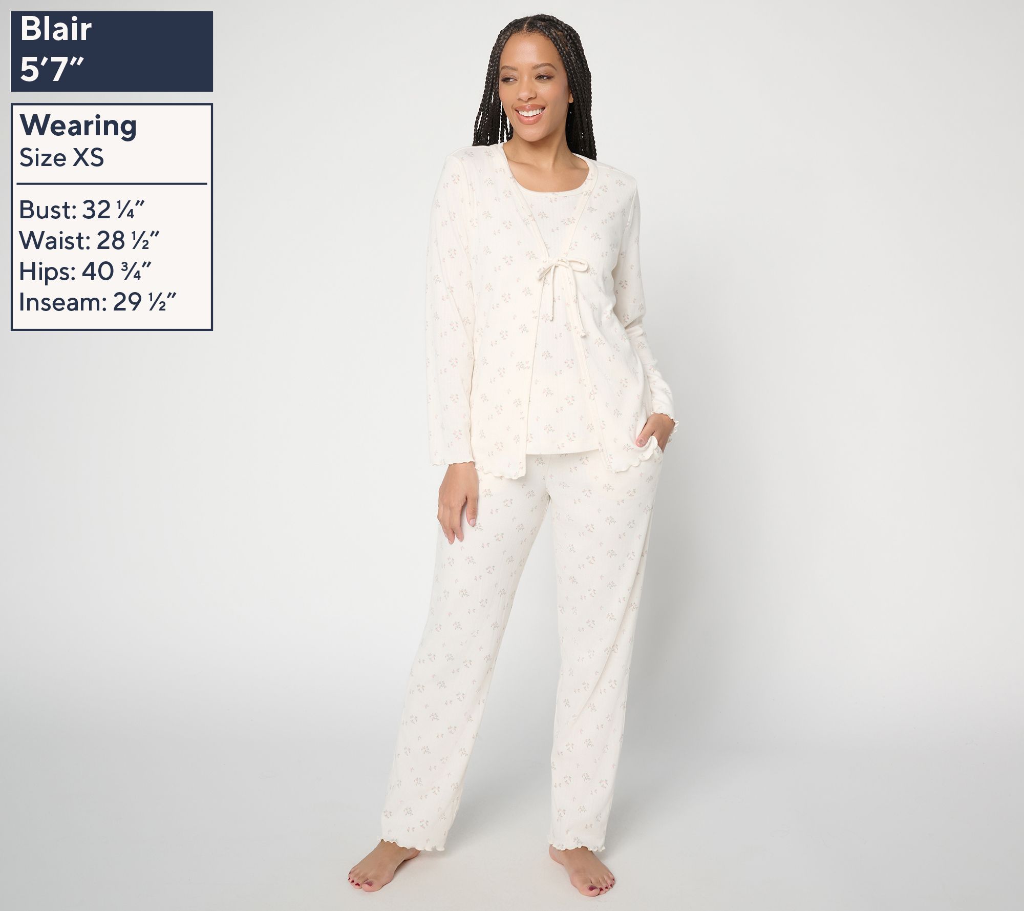 Dressed for laid-back mornings and cozy nights in, this three-piece lounge set offers options you can mix and match for any mood. Soft pointelle knit with playful prints, relaxed fits, and sweet details like a bow-tie cardigan make this pajama set an inviting choice for everything from lazy Sunday lounging to weekday wind-downs. From Berkshire Homewear.