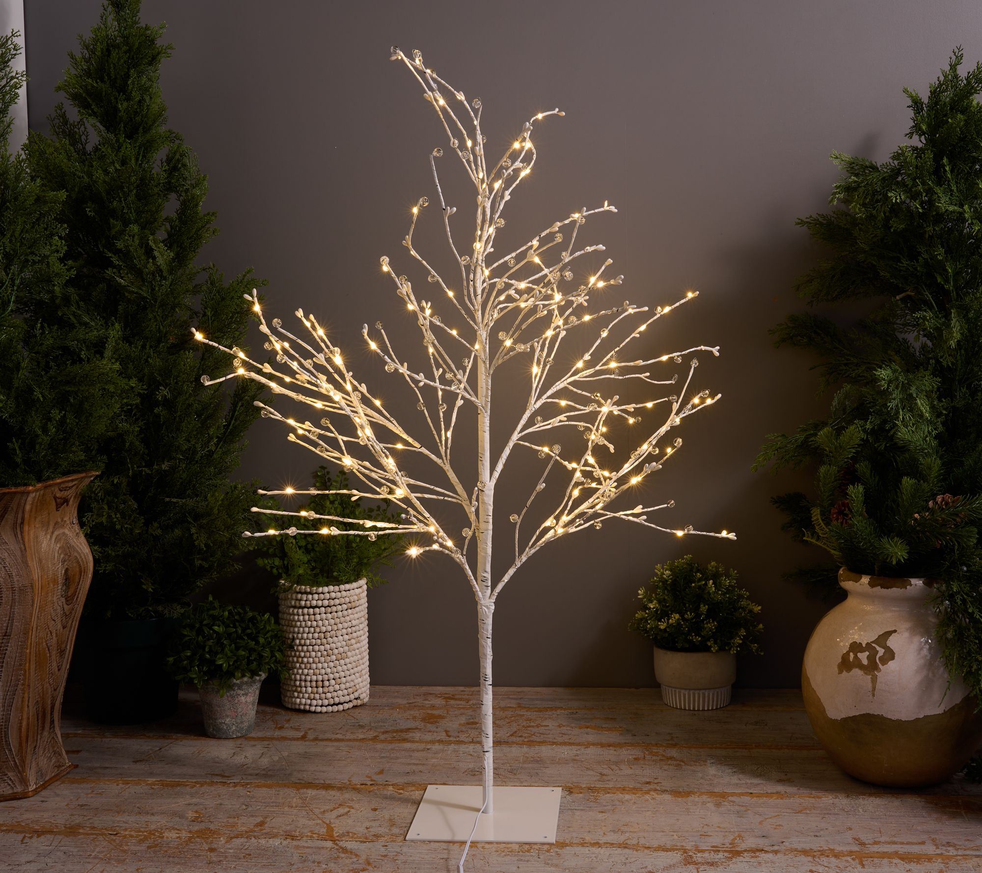 Brighten up your living space with an enchanting glow. This faux birch tree illuminates with 150 LED lights, enhancing your indoor decor. Choose from multiple lighting effects to suit any festive occasion. From Bethlehem Lights.