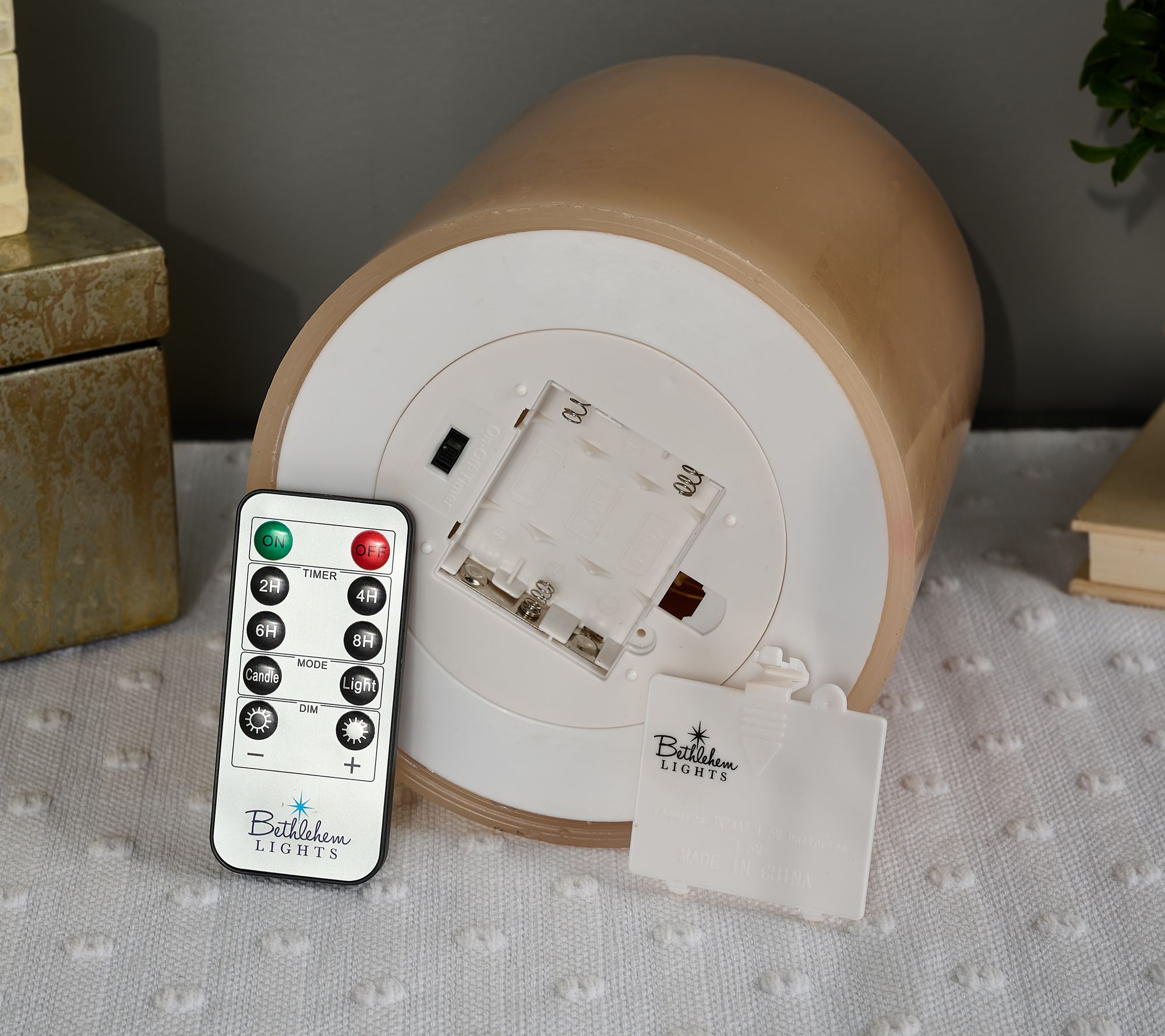 Create a warm and inviting atmosphere with this large pillar candle. With various timer options and a remote control, you can effortlessly set the perfect mood. From Bethlehem Lights.