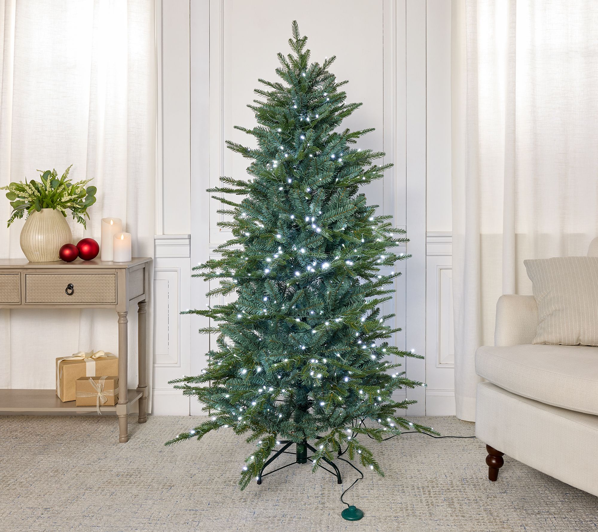 Joyful celebrations become even brighter when you gather around this 6.5'H micro LED tree, adorned with 1,200 dazzling lights and customizable color options. Effortlessly set the mood for your holiday parties or quiet winter evenings using the remote, as the tree glows in warm white, cool white, multi, or pastel hues. Bring magical light shows and sparkly ambiance to your home -- then pack it away easily in the included storage bag. From Bethlehem Lights.