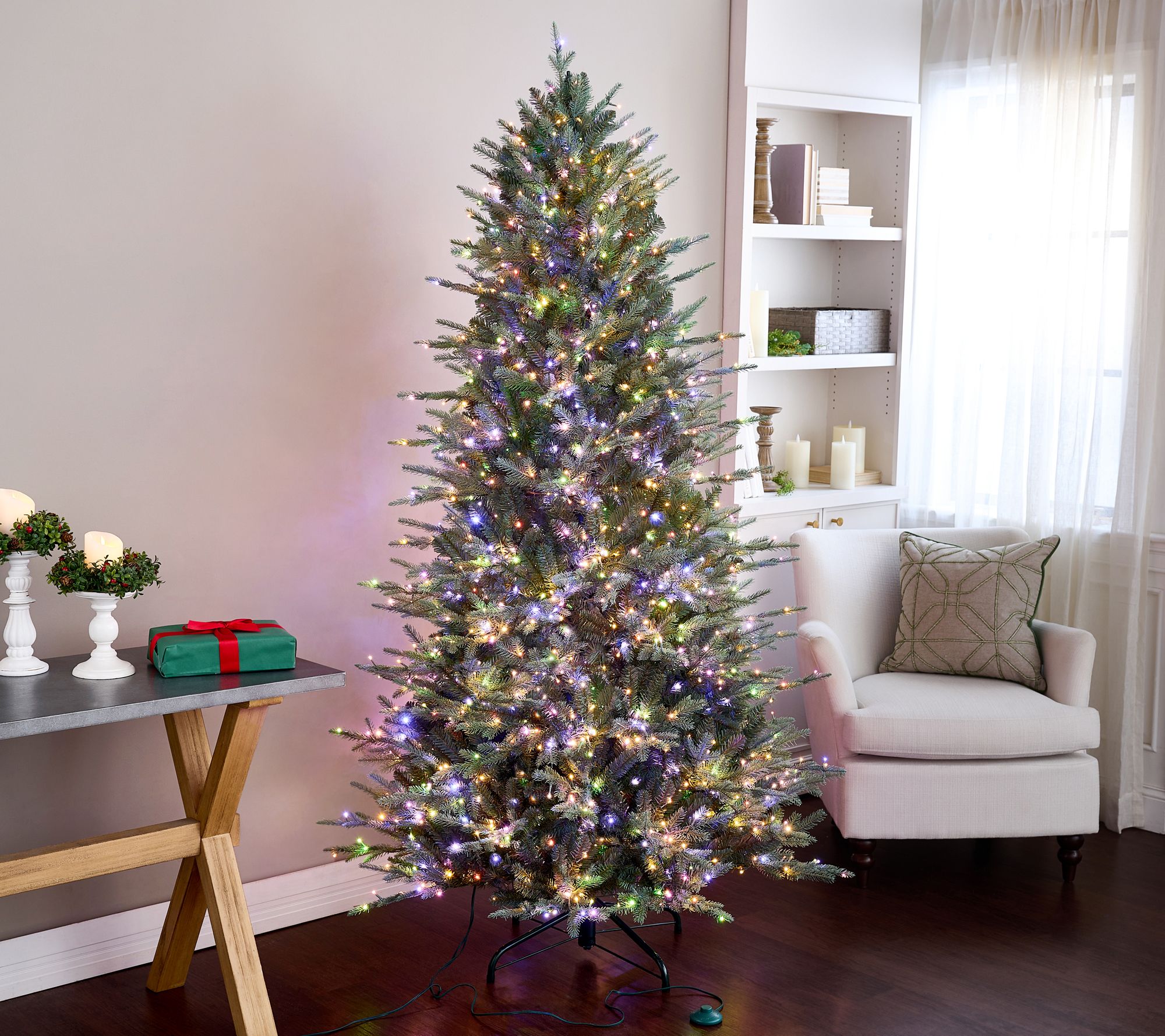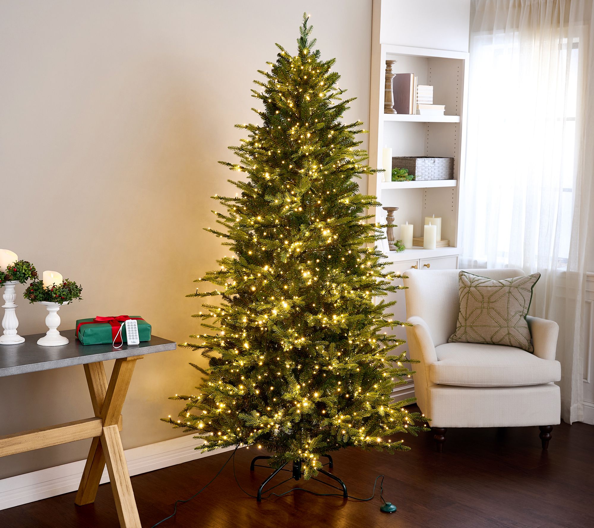 Setup is simple -- with Memory Shape Construction, this lifelike evergreen is ready right out of the box, with little to no fluffing needed. The beautifully positioned molded branches are perfect for placing your treasured ornaments. Micro-LED lights stay illuminated even if one light goes out, and feature three brightness settings, a convenient timer, and 18 different functions (with white, pastel, and multi-color options) -- all controlled by the included remote.