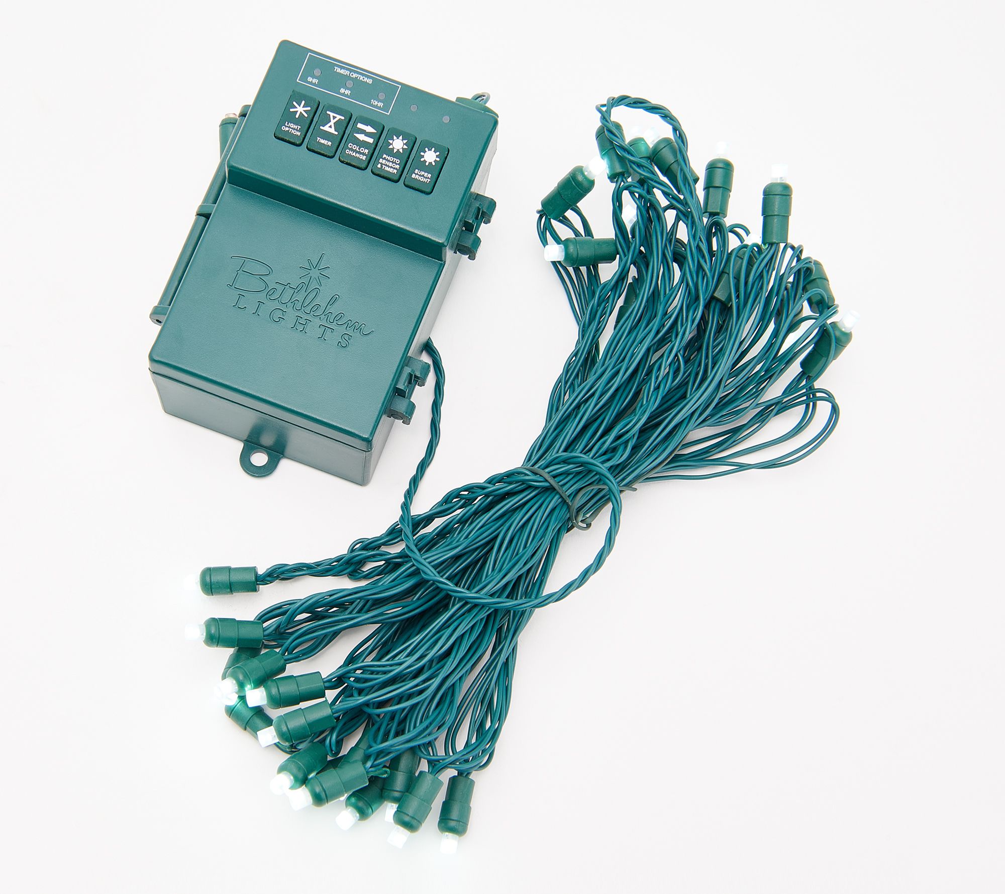• Six-, eight-, and 10-hour on timer functions; warm white and multicolor light cycles; bright/super bright light modes; steady on, fast twinkle, twinkle, fast glisten, glisten, and slow glisten modes; photo sensor mode turns lights on at darkness