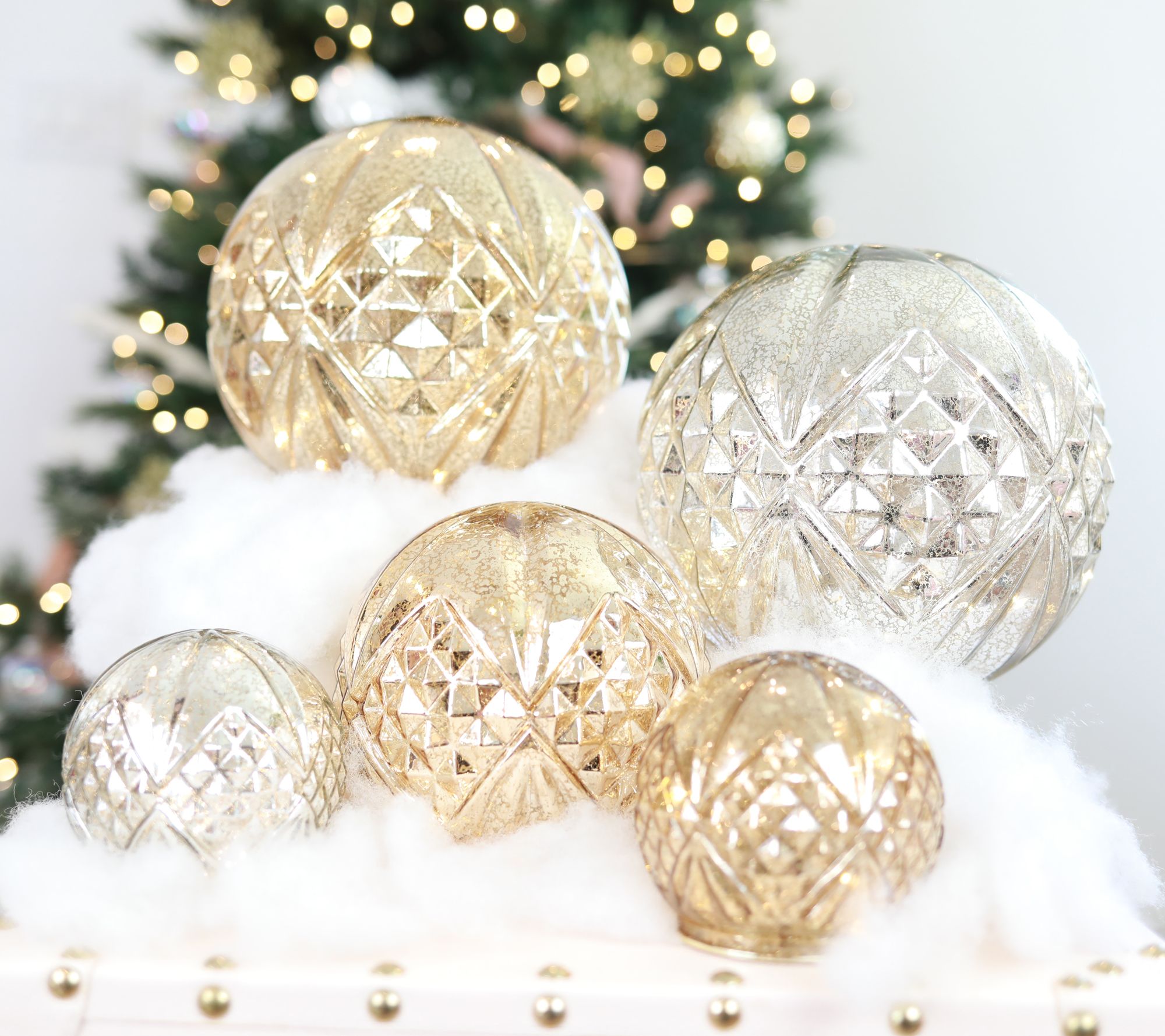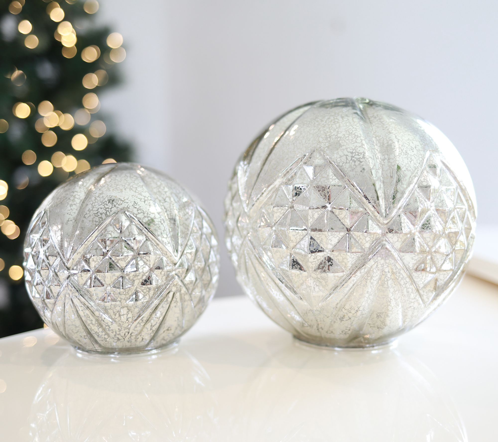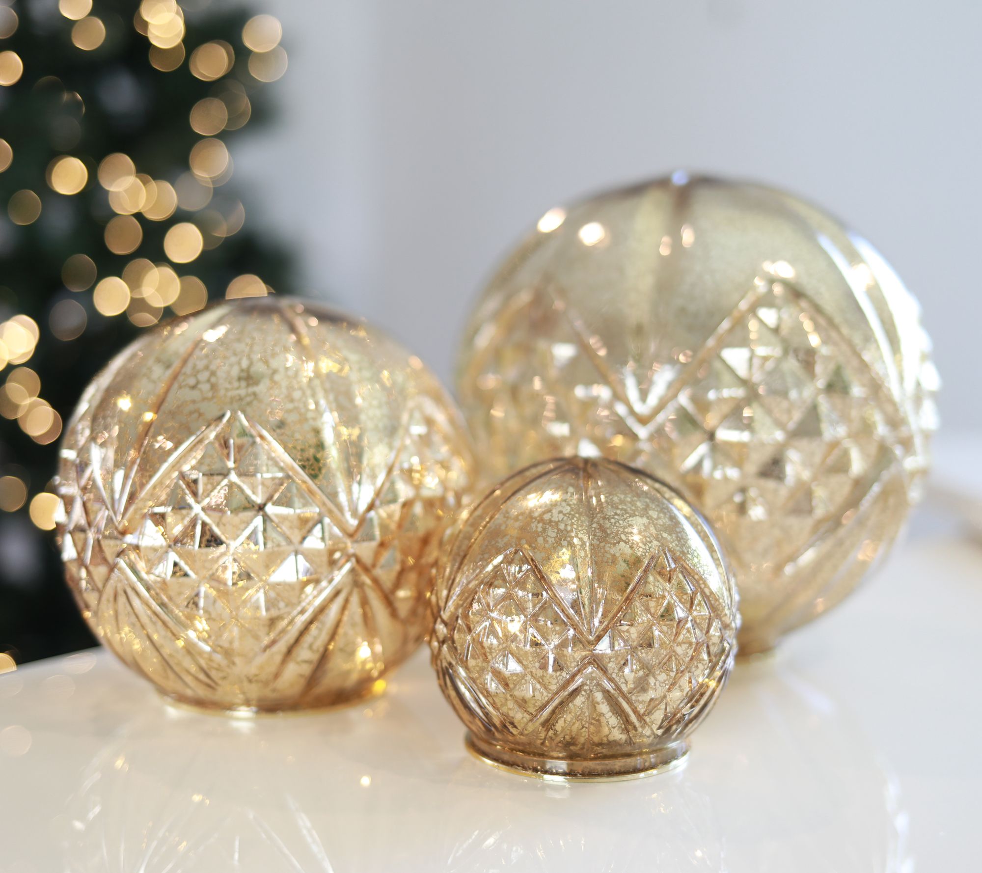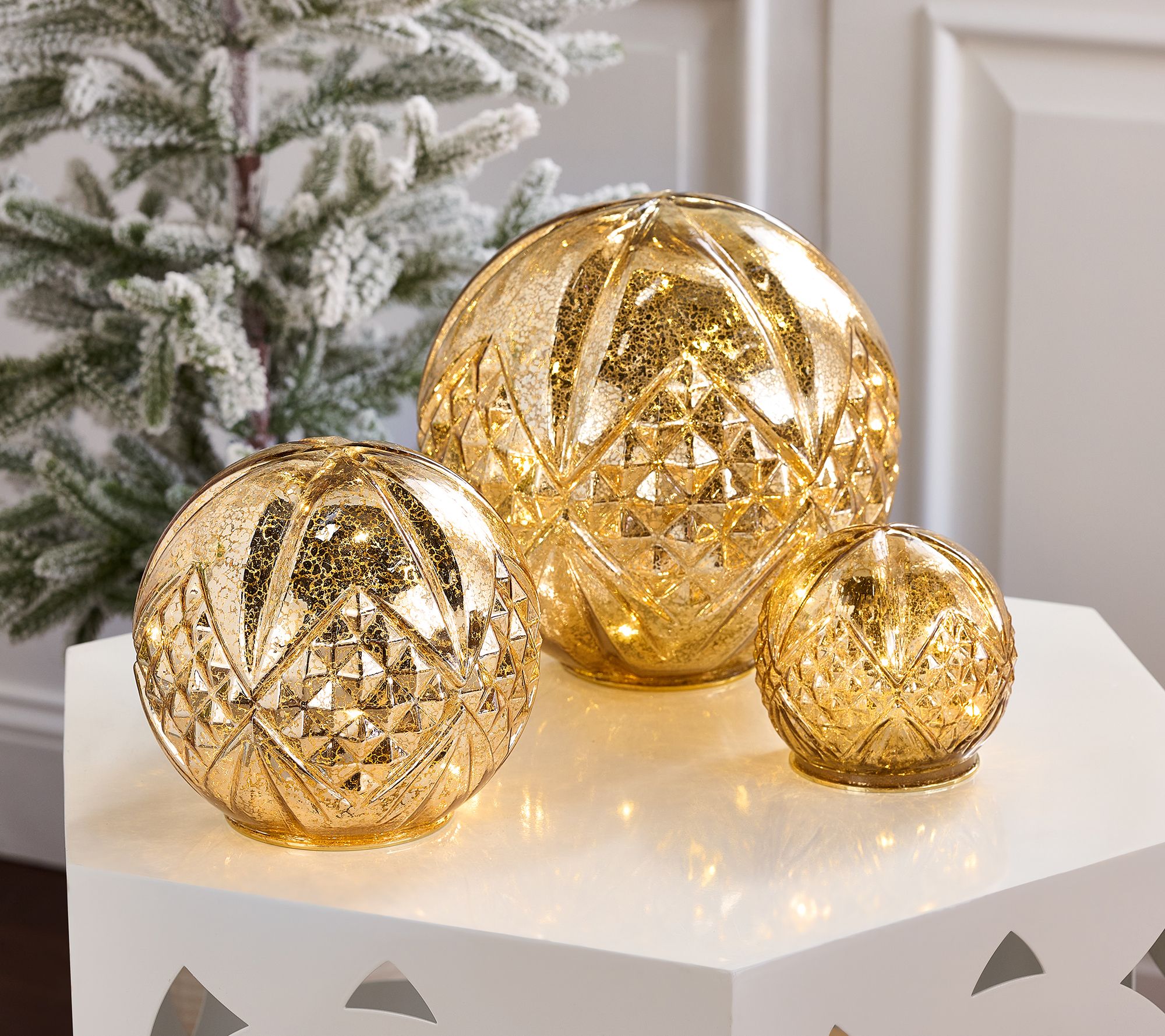 Place these illuminated mercury glass spheres on any side table, mantel, or centerpiece for an intricate and bright addition to your festive decor. From BFF Collection.
