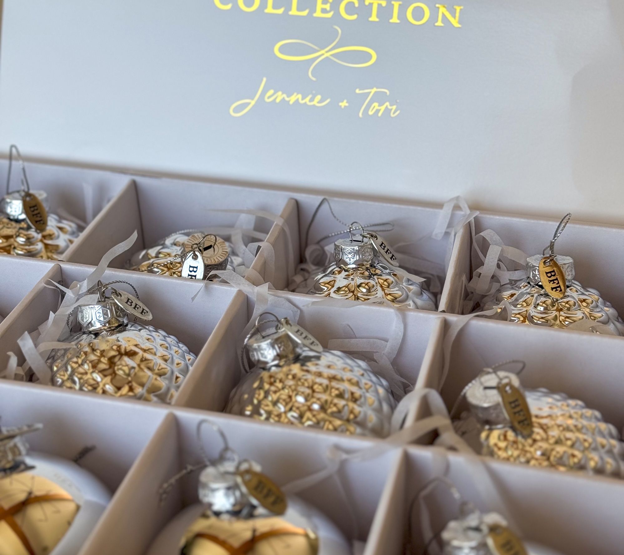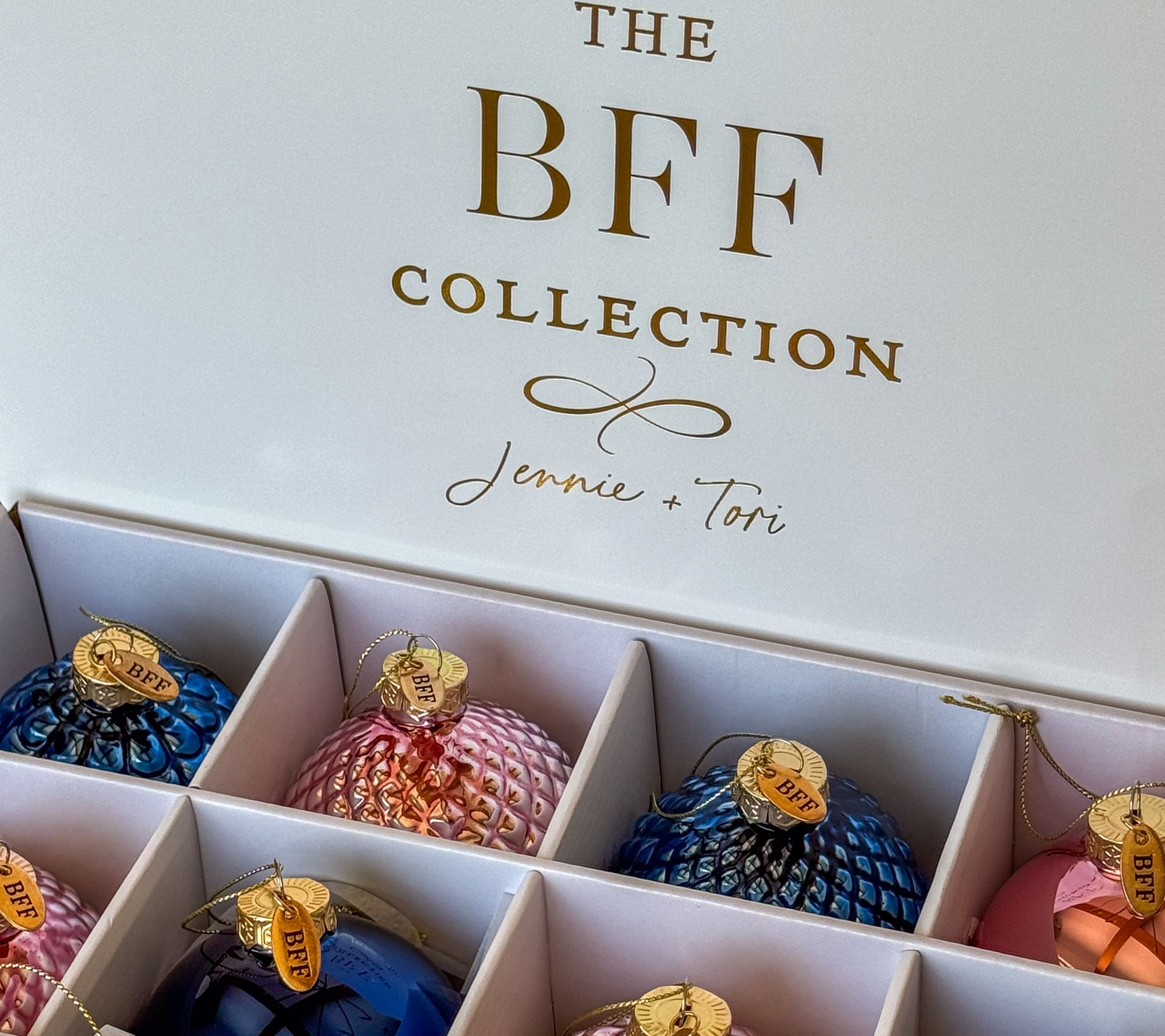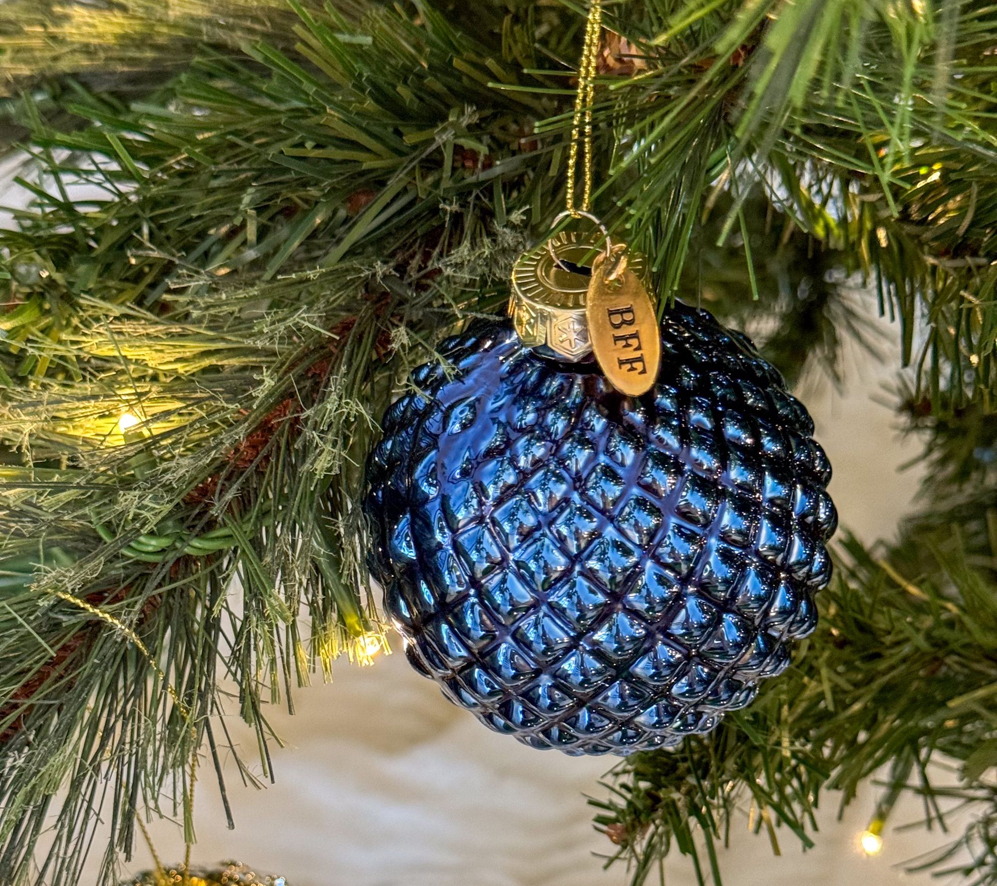 Celebrate the holidays with family, friends, and these metallic glass ornaments. Packaged in a logo box, the upscale design elevates your tree trimming options or makes a wonderful gift for the decorating diva on your list. From the BFF Collection.