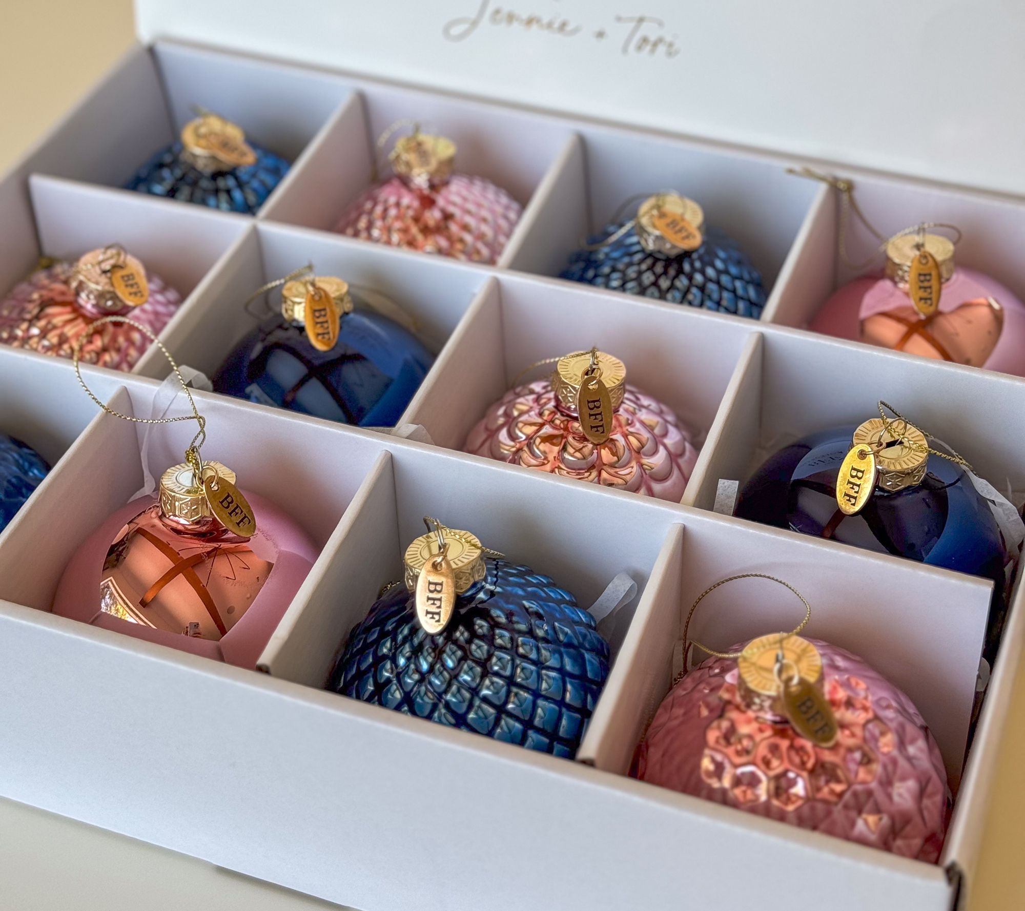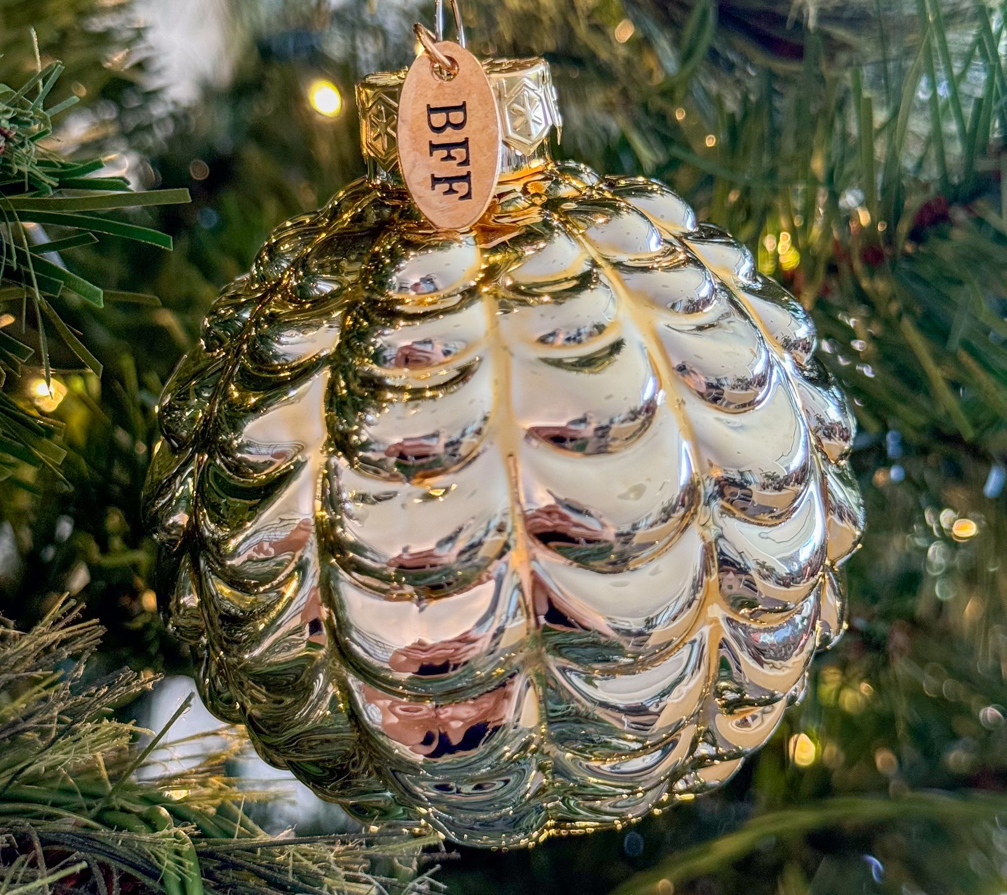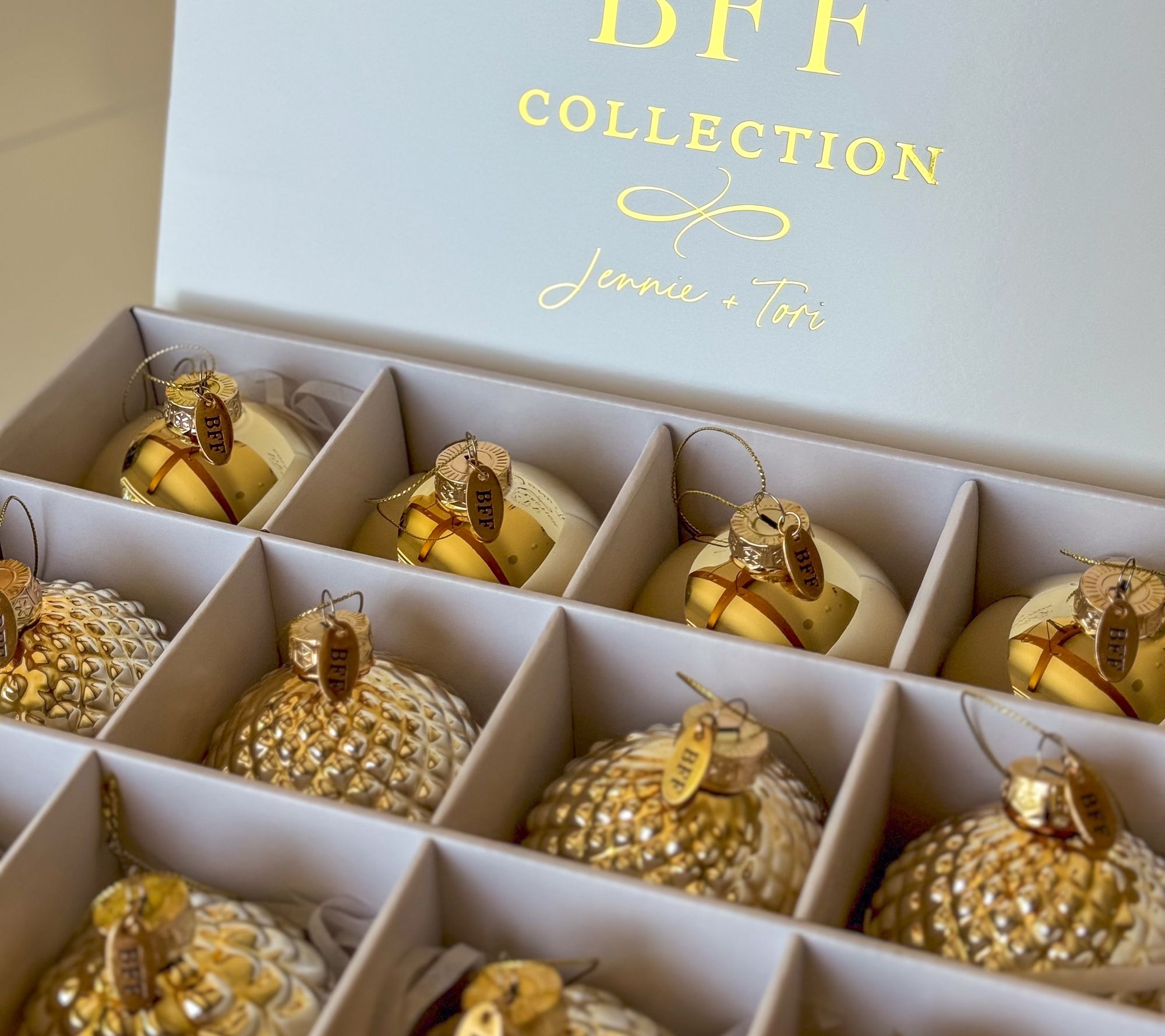 Celebrate the holidays with family, friends, and these metallic glass ornaments. Packaged in a logo box, the upscale design elevates your tree trimming options or makes a wonderful gift for the decorating diva on your list. From the BFF Collection.