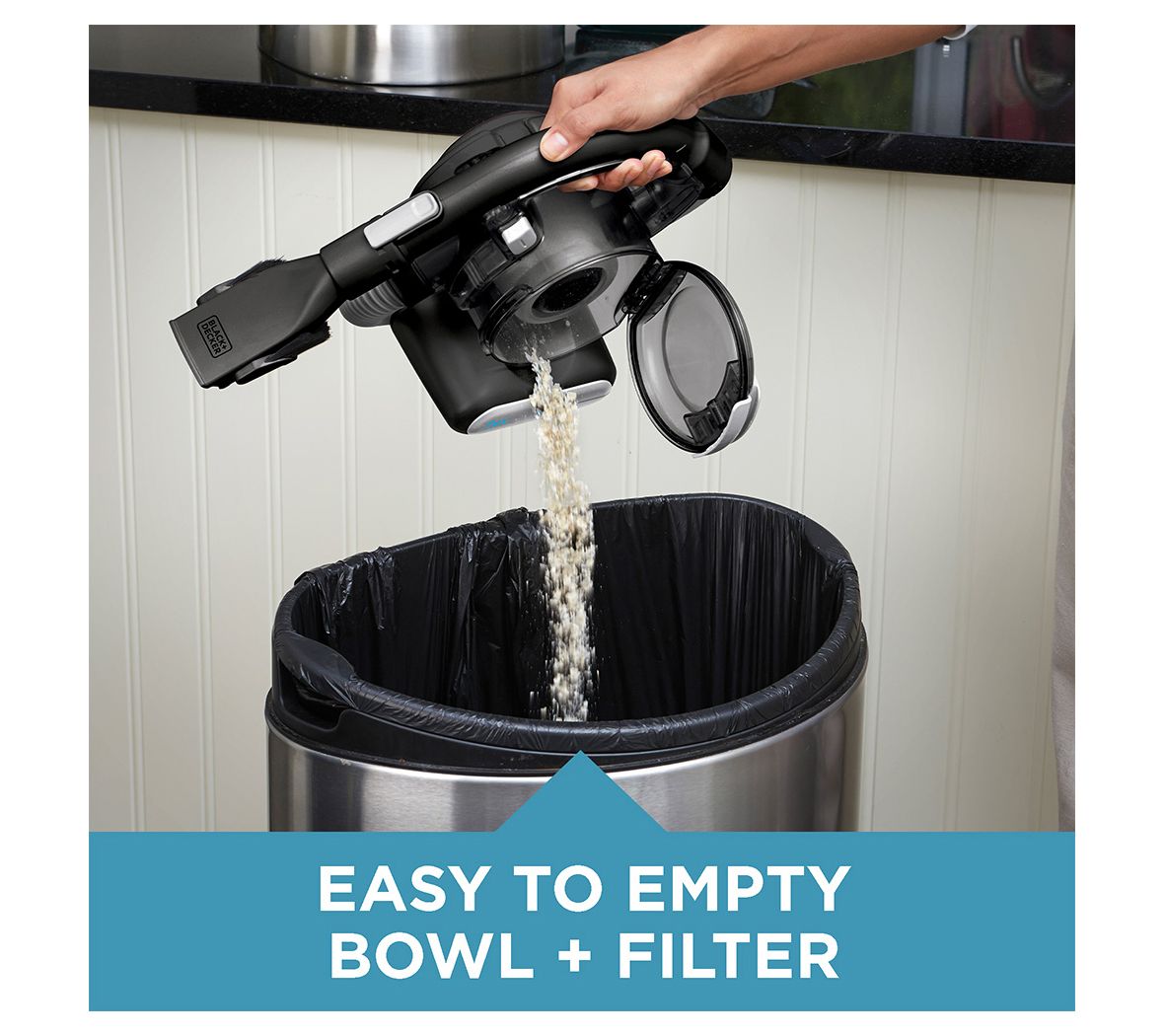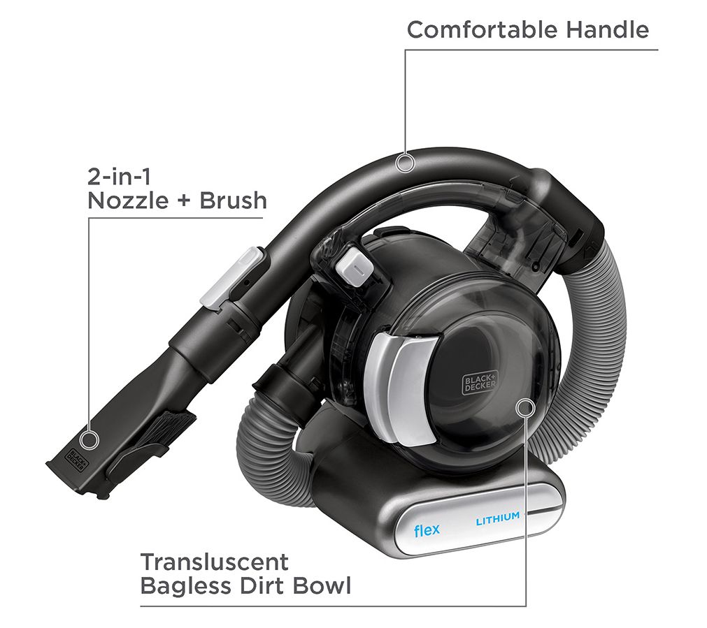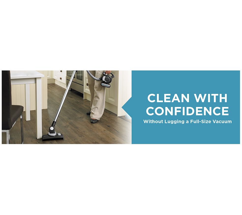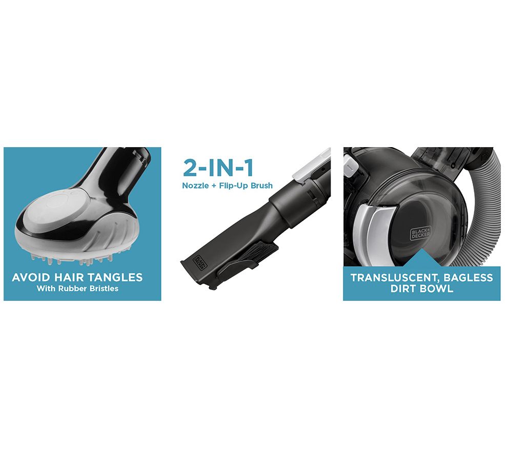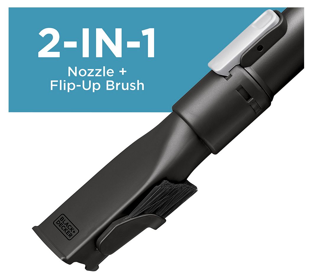 Perfect for quick cleaning jobs around the house, this handheld vacuum goes anywhere you do. Clean for to ceiling easily with the 4'L hose and switch between vacuuming and dusting with the 2-in-1 nozzle. Cyclonic action spins dirt away from the filter to help maintain performance, and the three-stage filtration system prevents dust and debris from escaping. From Black + Decker.