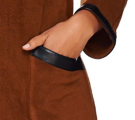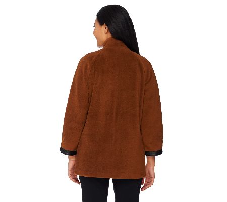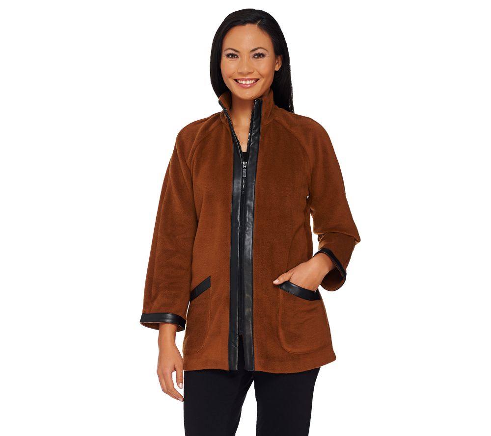 Fleece with flair. From Bob Mackie, this cozy fleece jacket features distinctive faux leather trim on the cuffs, pockets, and zipper, elevating this casual style to the next level of sophistication. From Bob Mackie.