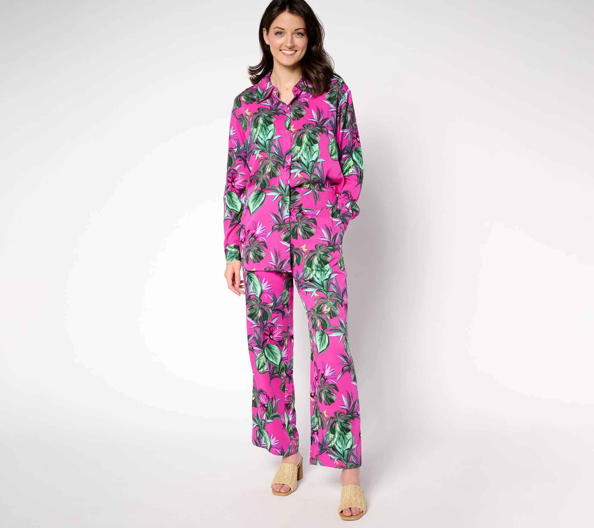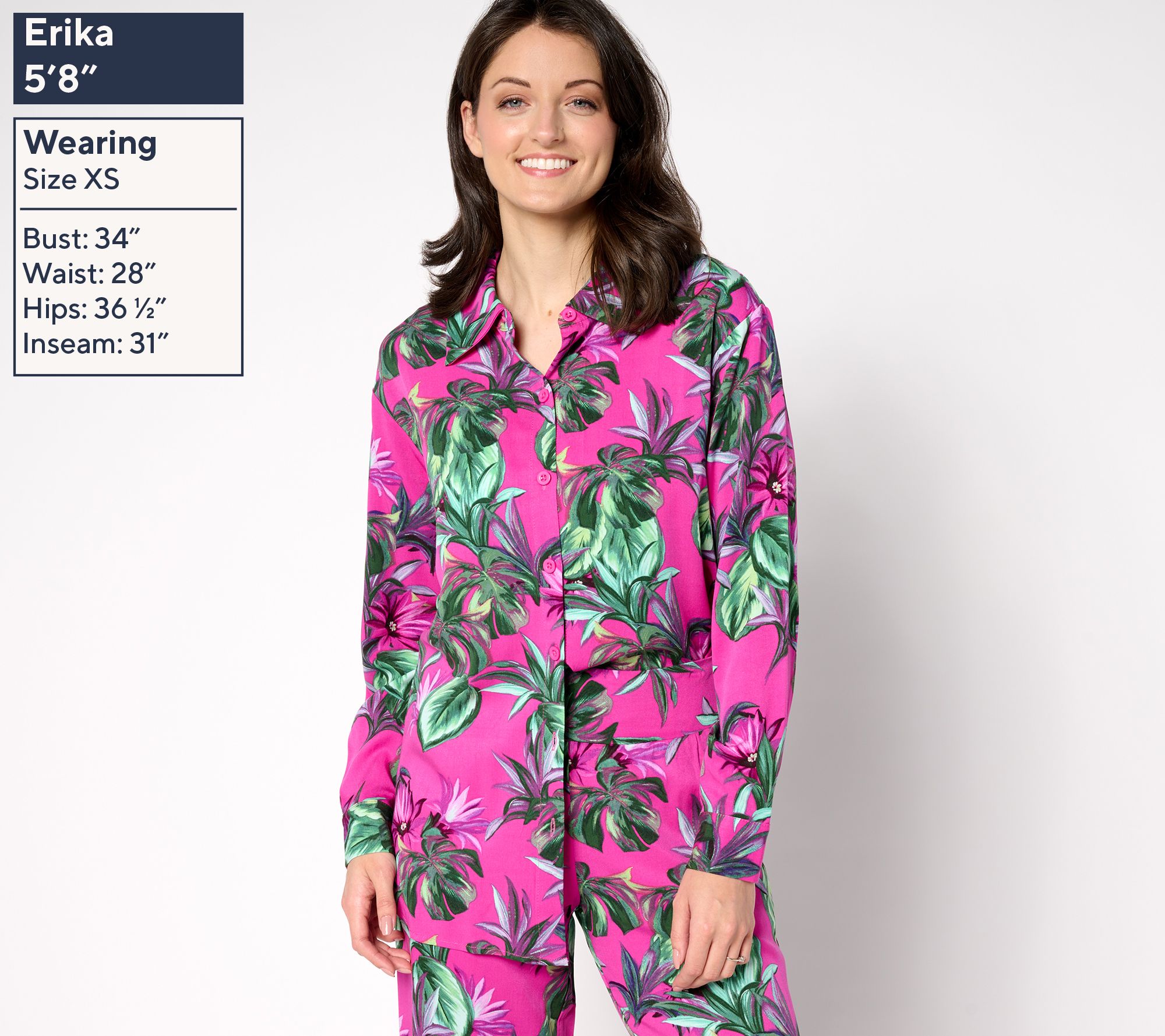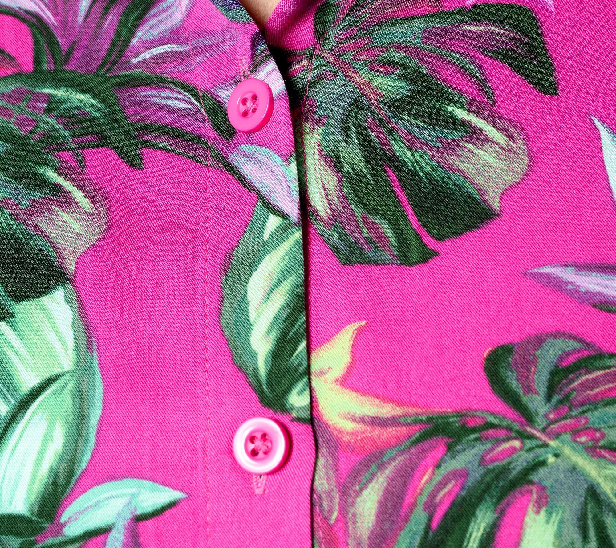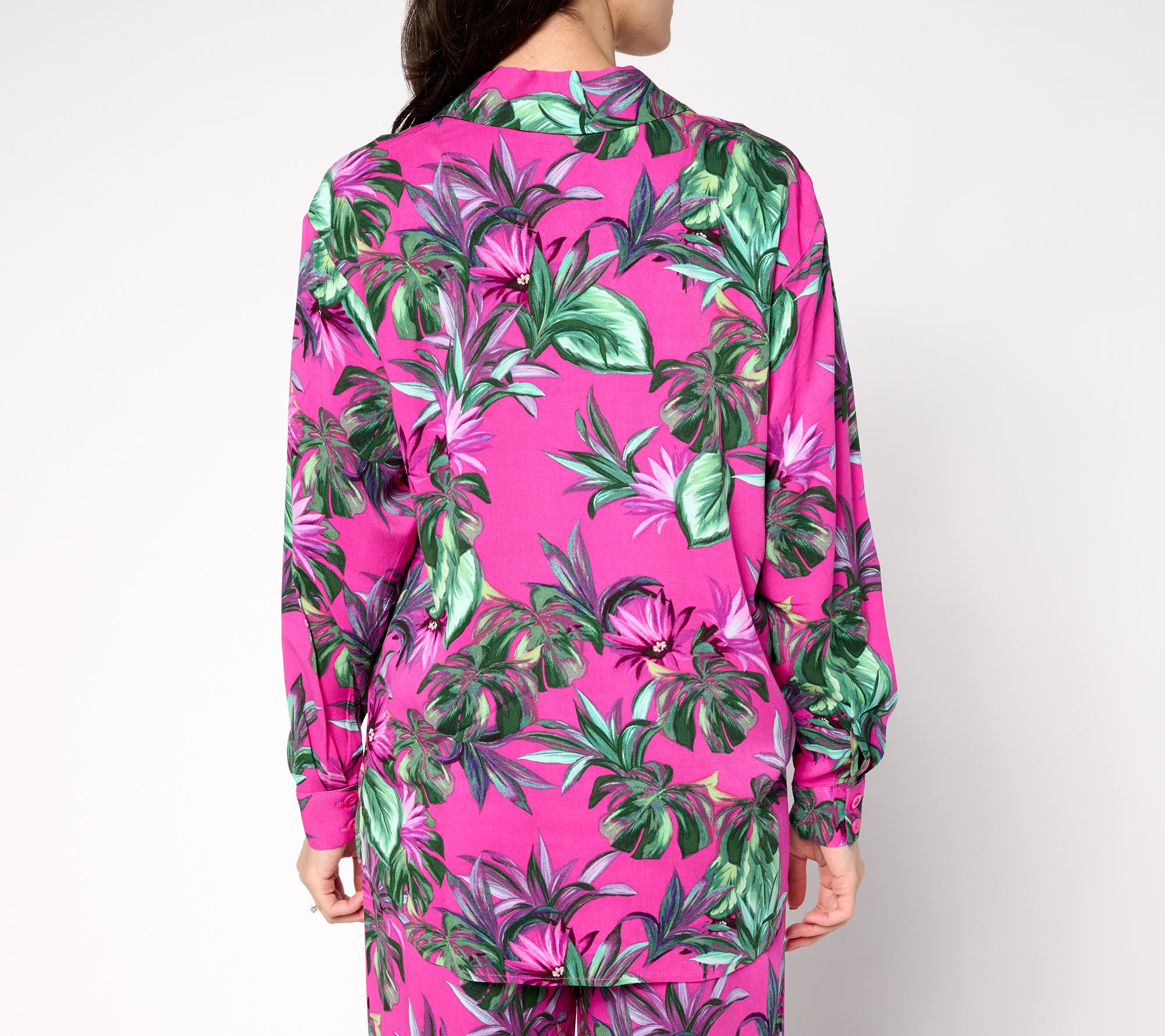 • Features: allover print, button-front closure, long sleeves, button cuffs, curved hem, side slits
