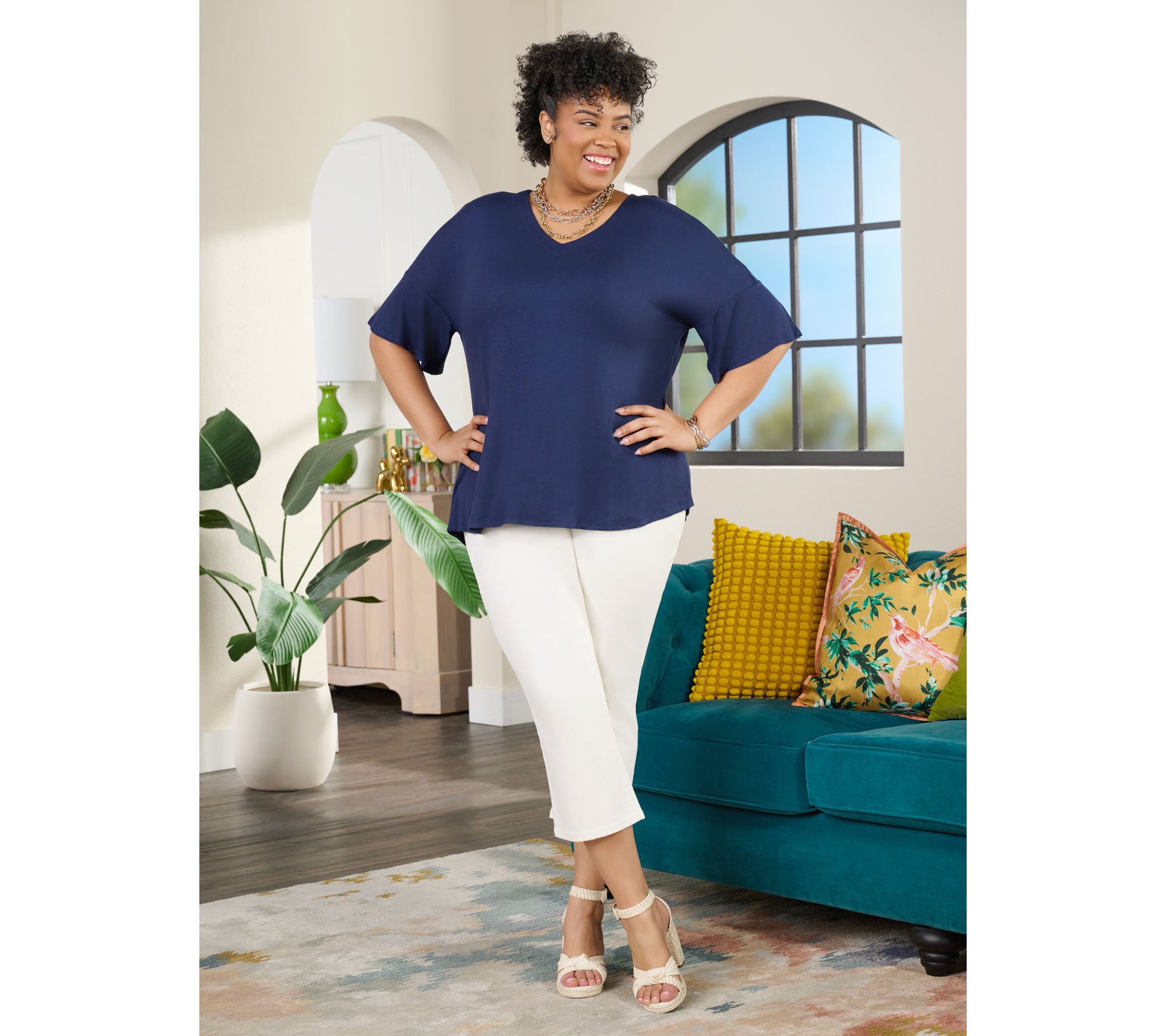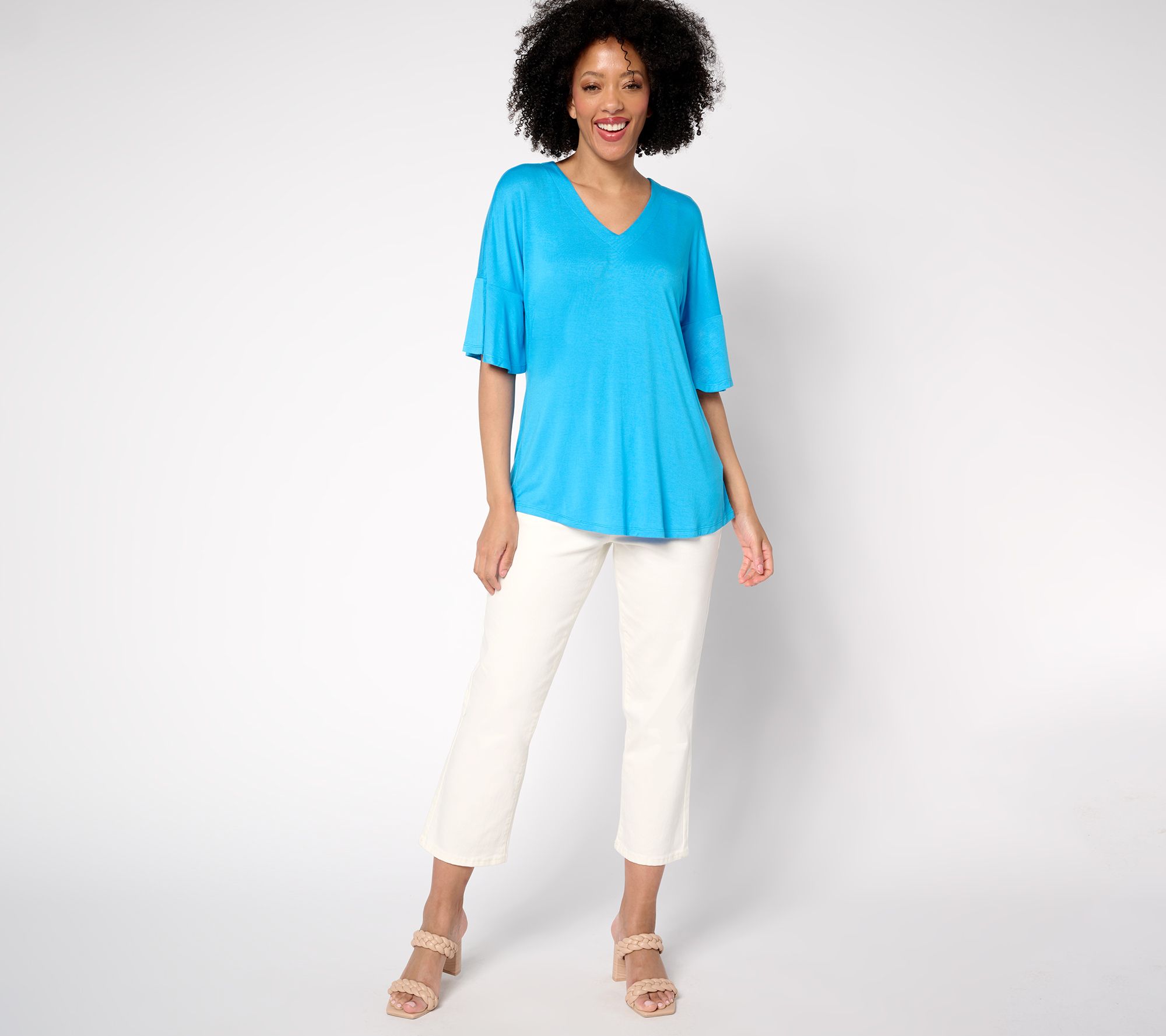 • Features: drop shoulders, flutter elbow-length sleeves, V-neckline, shirttail hem, elbow-length sleeves