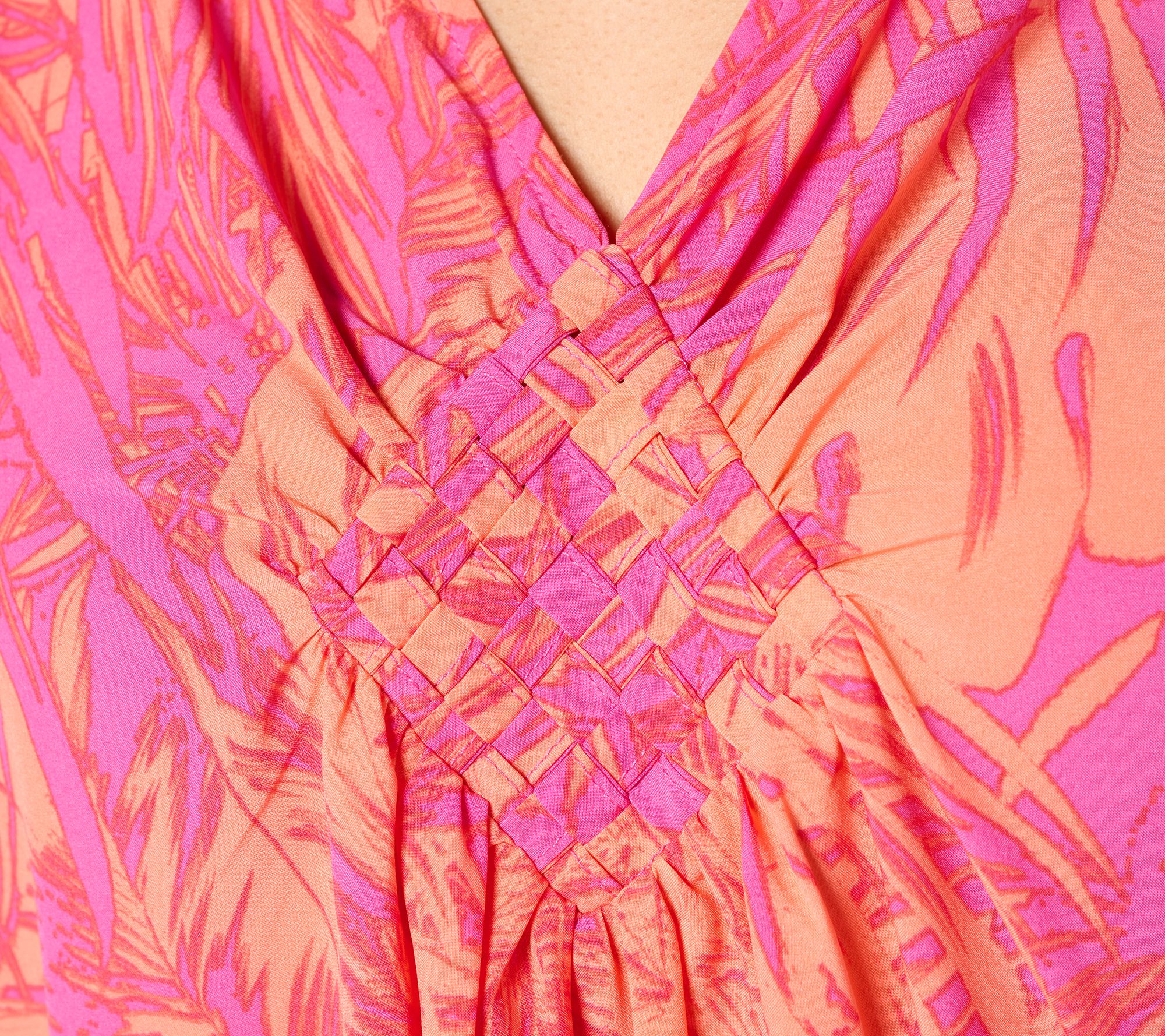 • Features: v-neckline, braided diamond patch at front neck drop, curved hem